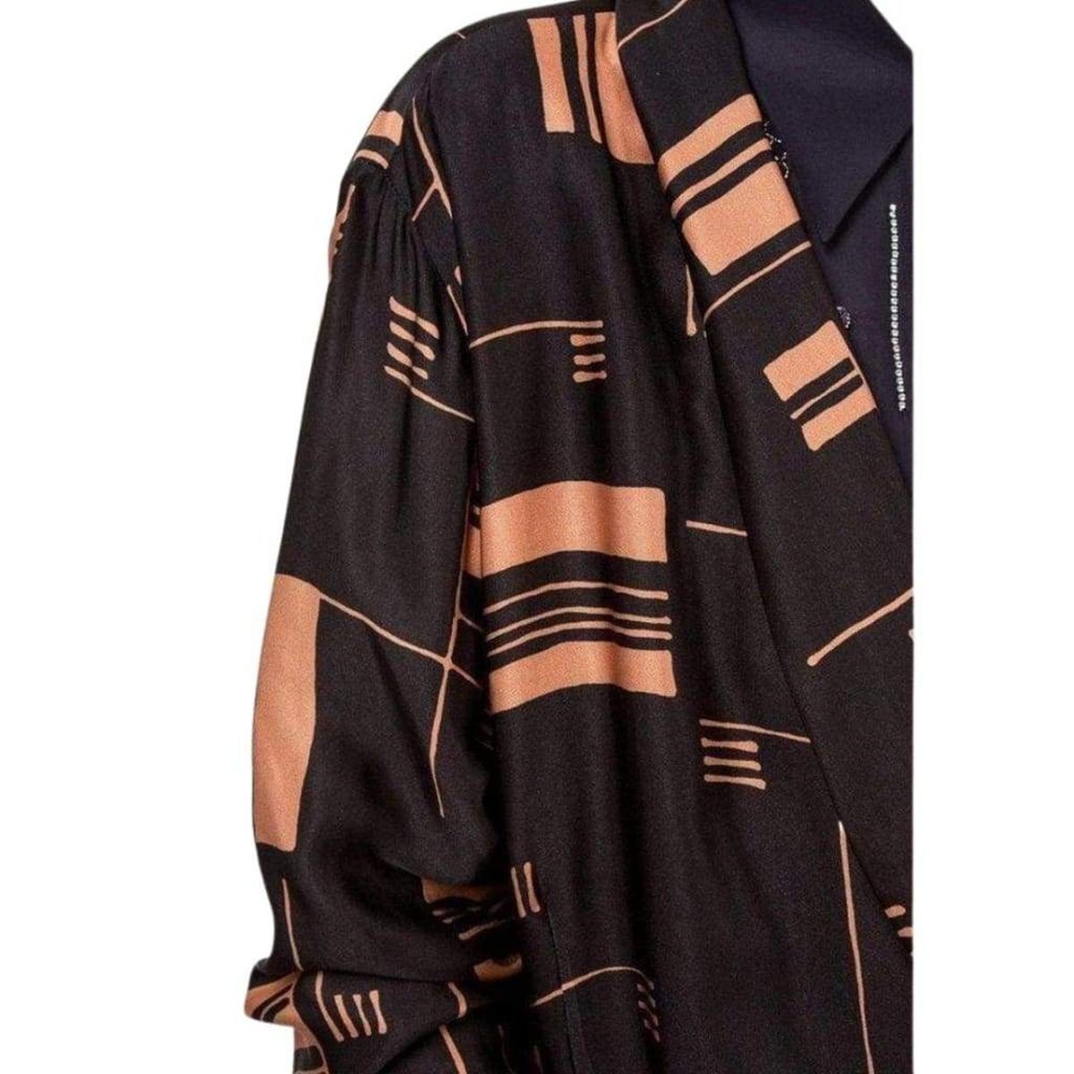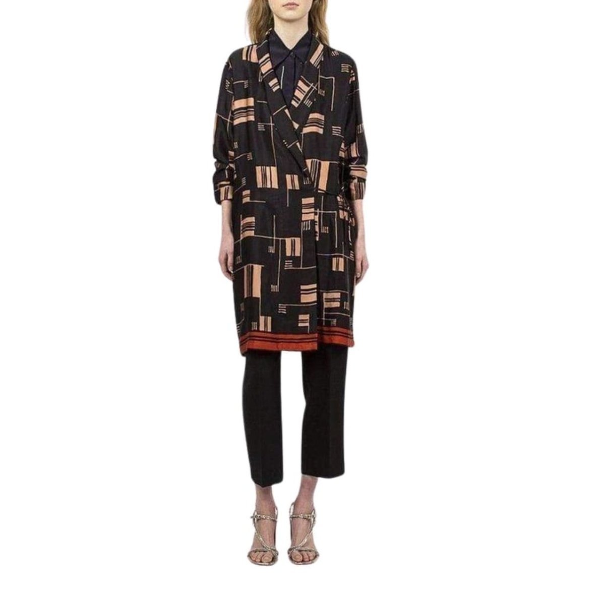 Made in a black fabric printed with a graphic pattern in nude tones Fine lapels and closes on the side of the waist with ties to tie.
