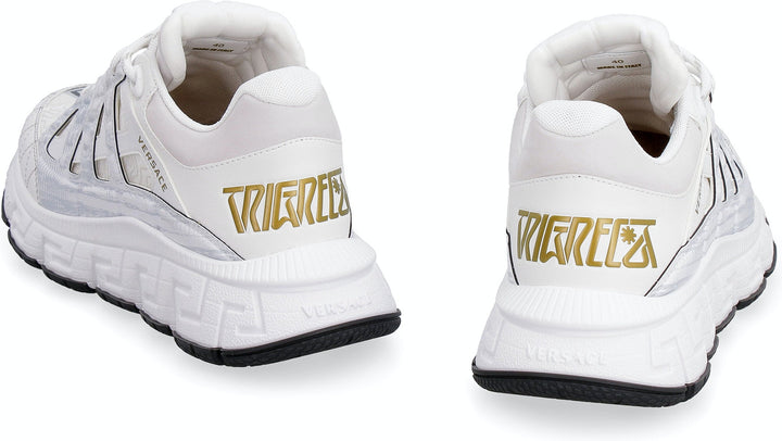 Step up your sneaker game with the VERSACE TRIGRECA SNEAKERS. These stylish kicks feature a rubberized graphic pattern, leather details, and trekking laces for a fashion-forward look. With the iconic Medusa head on the sole and extra soles included, these sneakers are the perfect combination of style and comfort.