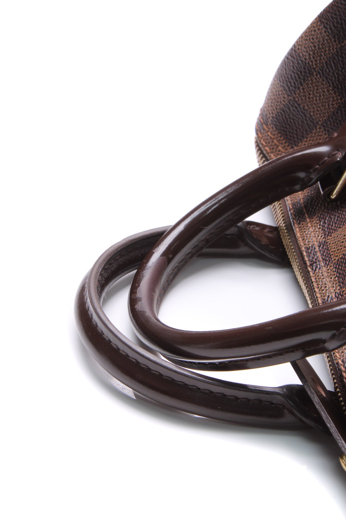 This purse is in great condition with minor wear/discoloration on the corners, edges, interior, hardware, and glazed edges, with minor peeling on the leather handles.