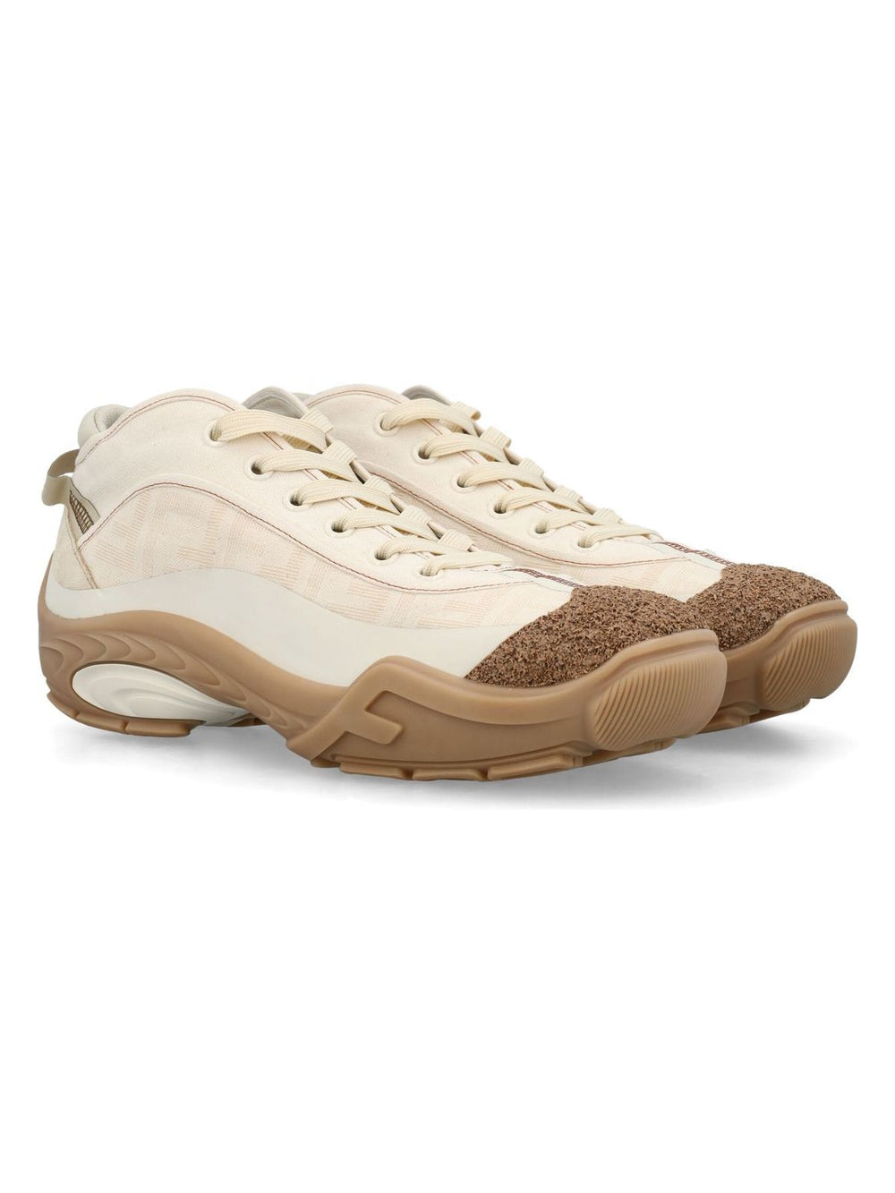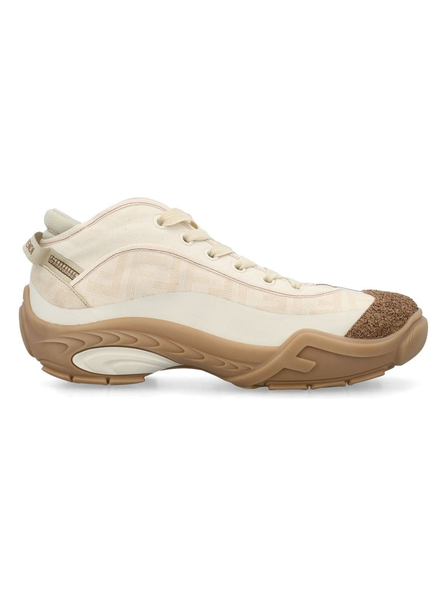 Step up your style game with these Fendi mid-top leather sneakers. They feature a loop at the heel, a lace-up fastening, and a cork-covered toe for a unique touch. The Fendi shadow laser-cut fabric and lightweight rubber running sole make these sneakers a standout choice for any casual look.