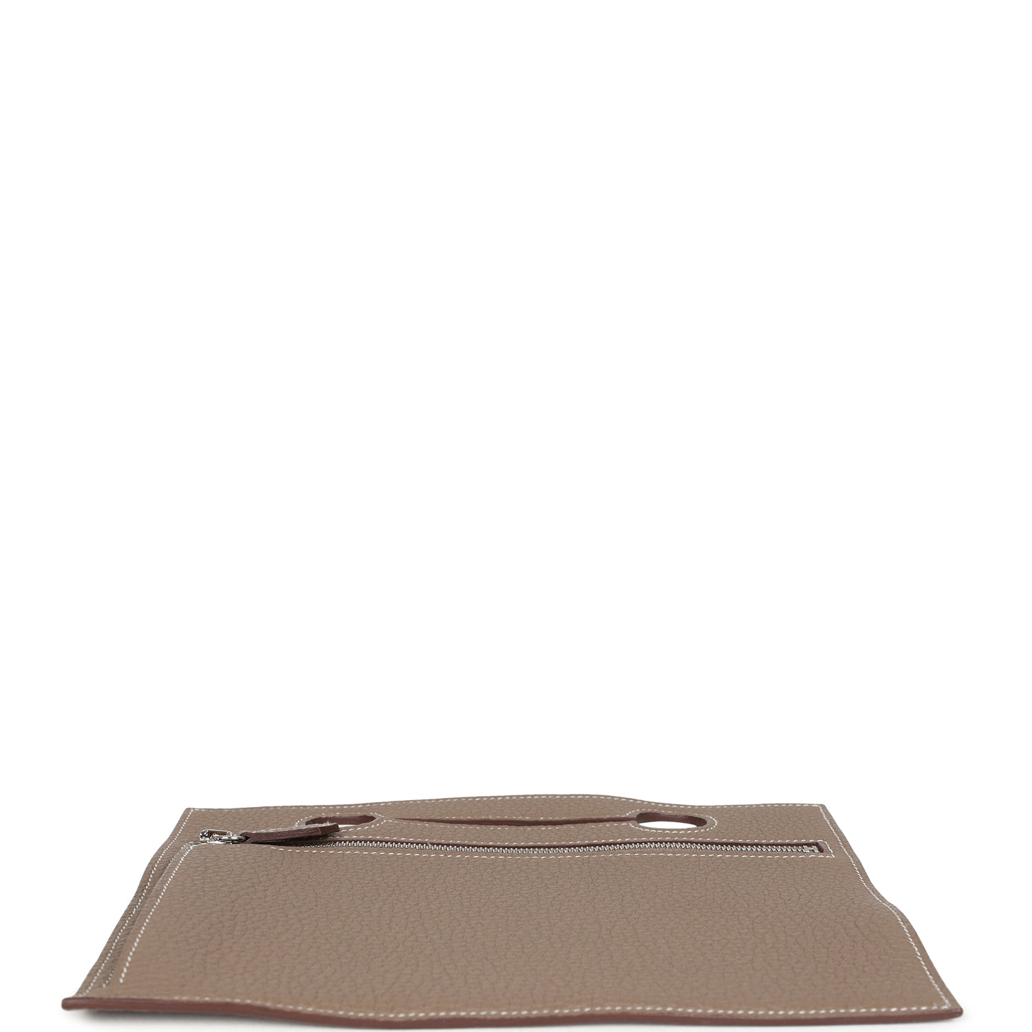 This Back Pocket Pouch is in Etoupe togo with palladium hardware featuring a removable back pocket pouch that is compatible with Birkin 25, 30, and 35 bags. It also has a front zipper closure.