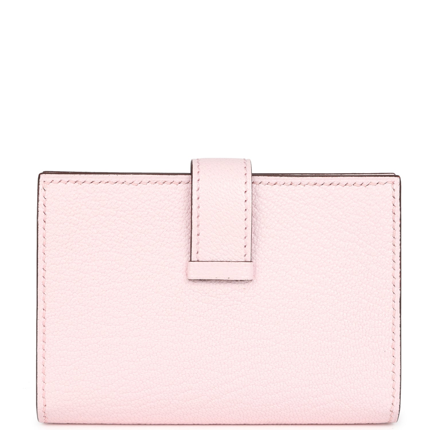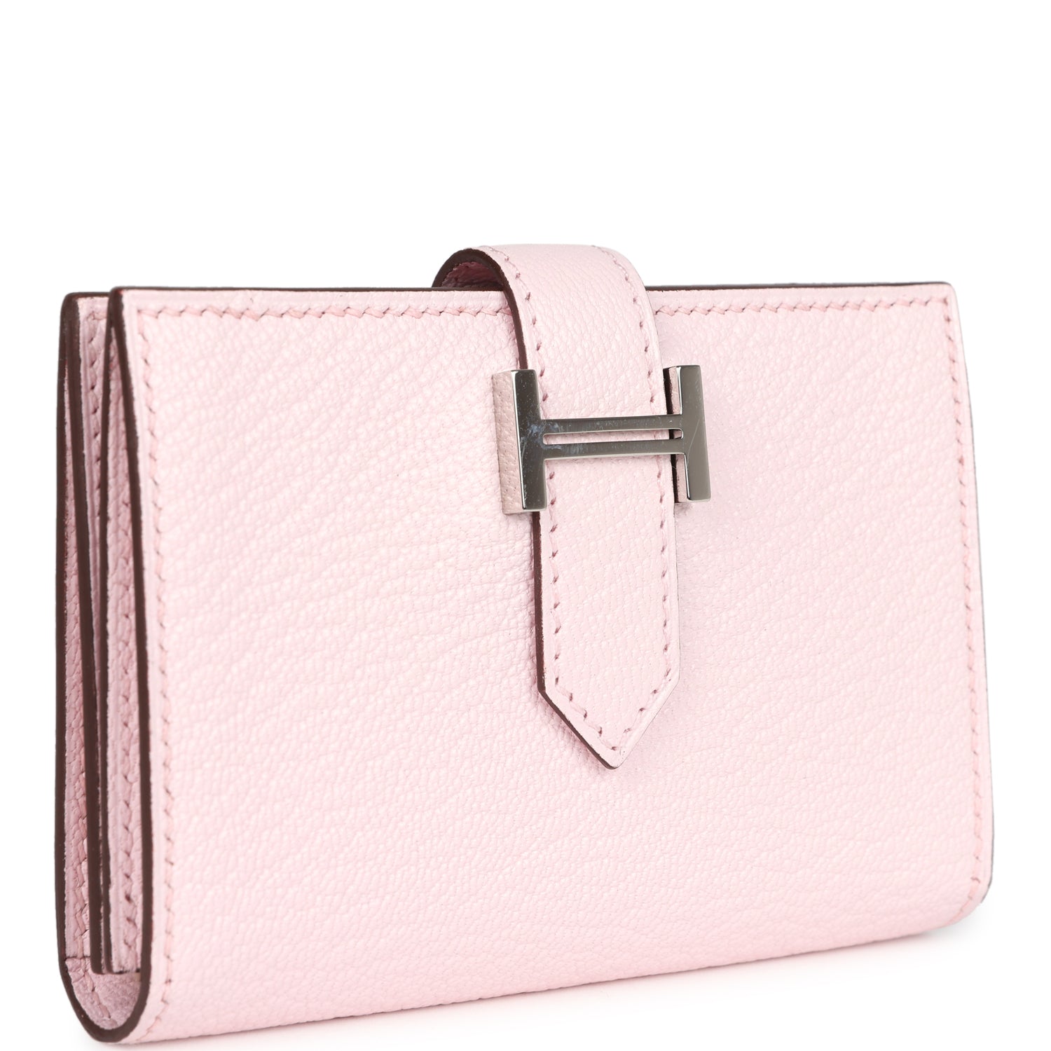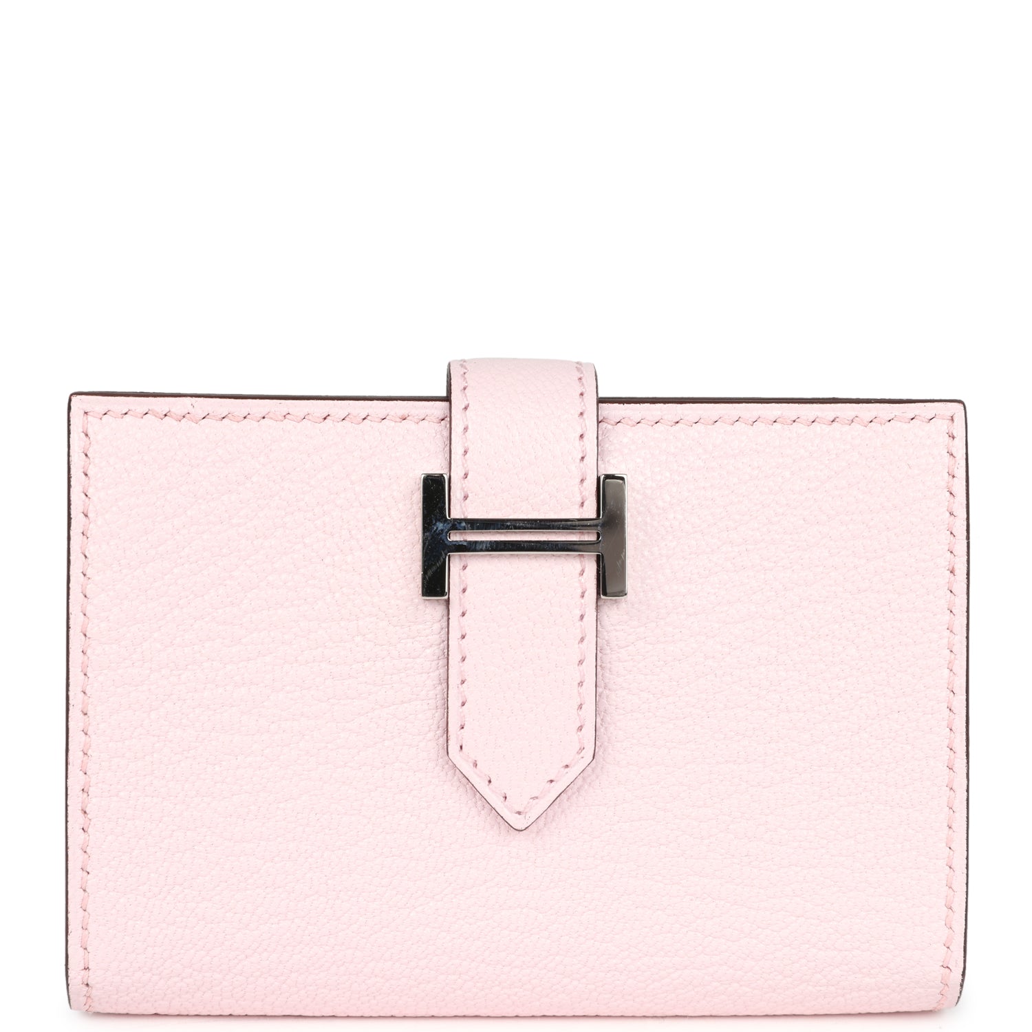 This Bearn Card Holder is in Rose Darling chevre mysore leather with palladium hardware, tonal stitching, and a loop closure that tucks into a palladium H.