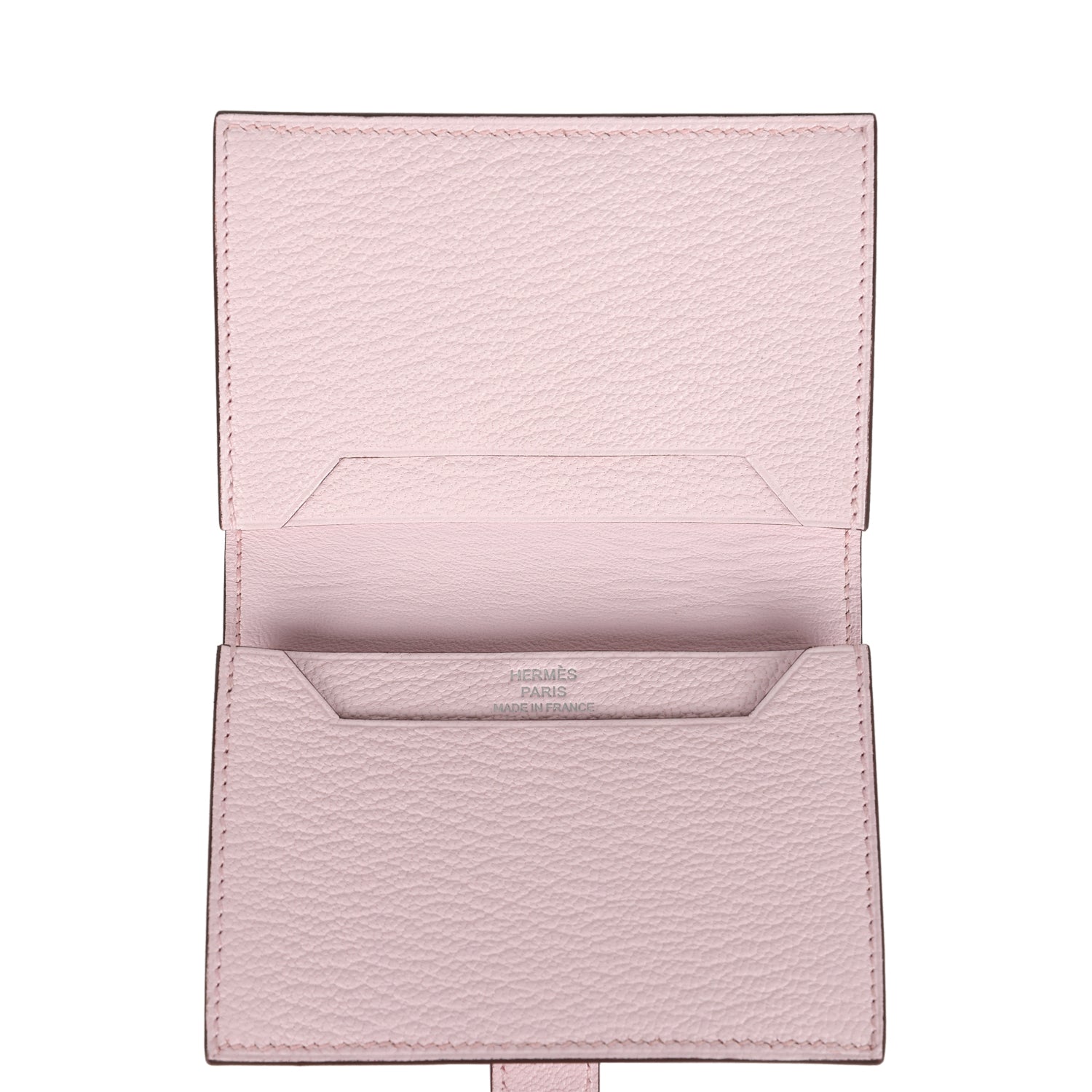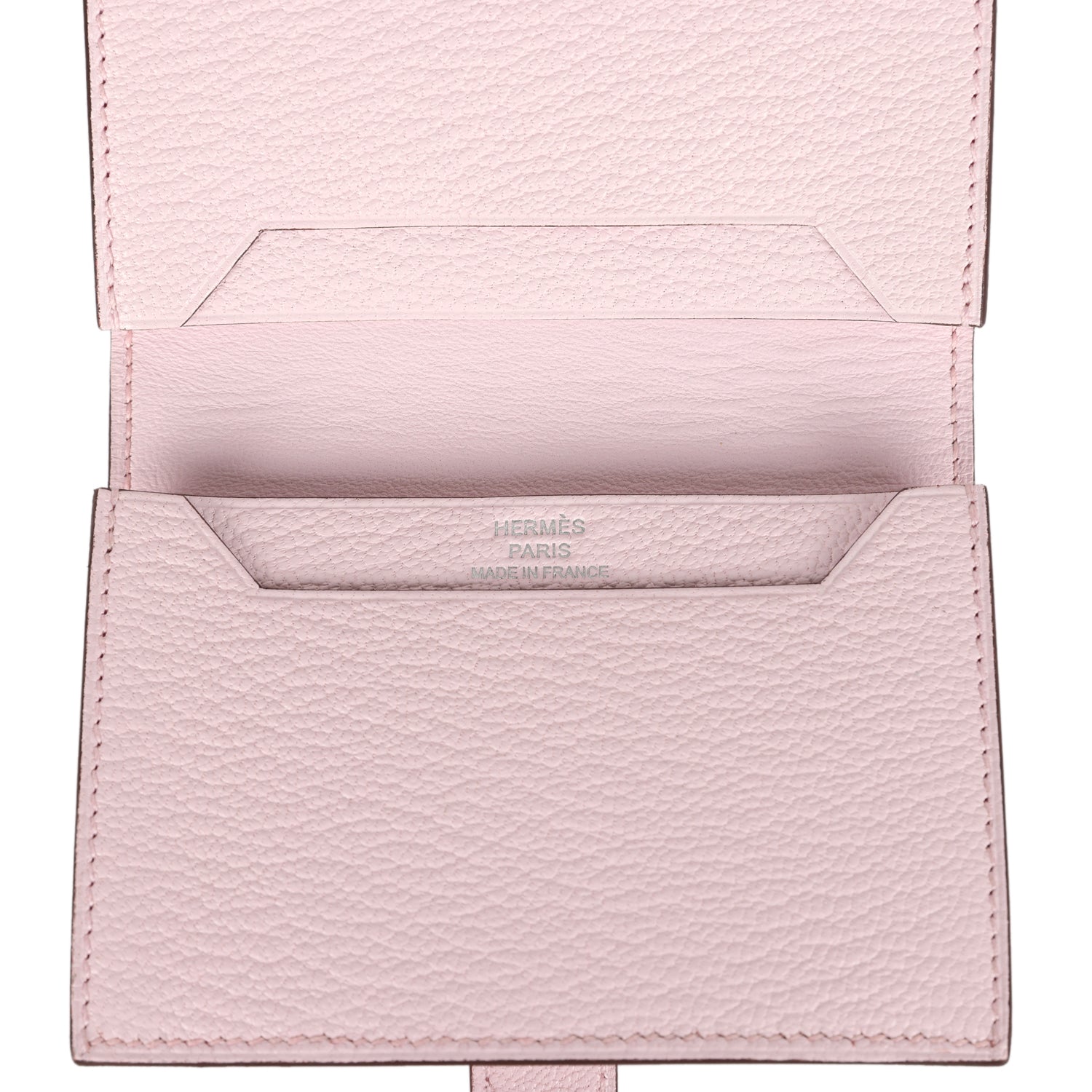 The interior is lined with Rose Darling chevre leather with four credit card slots.