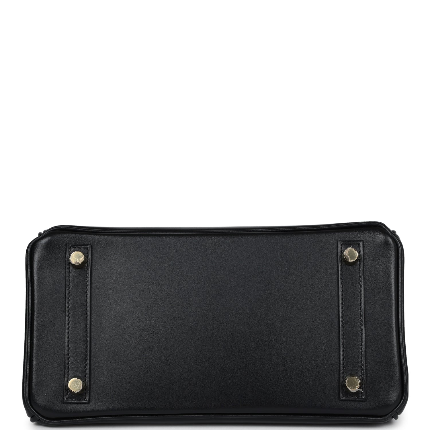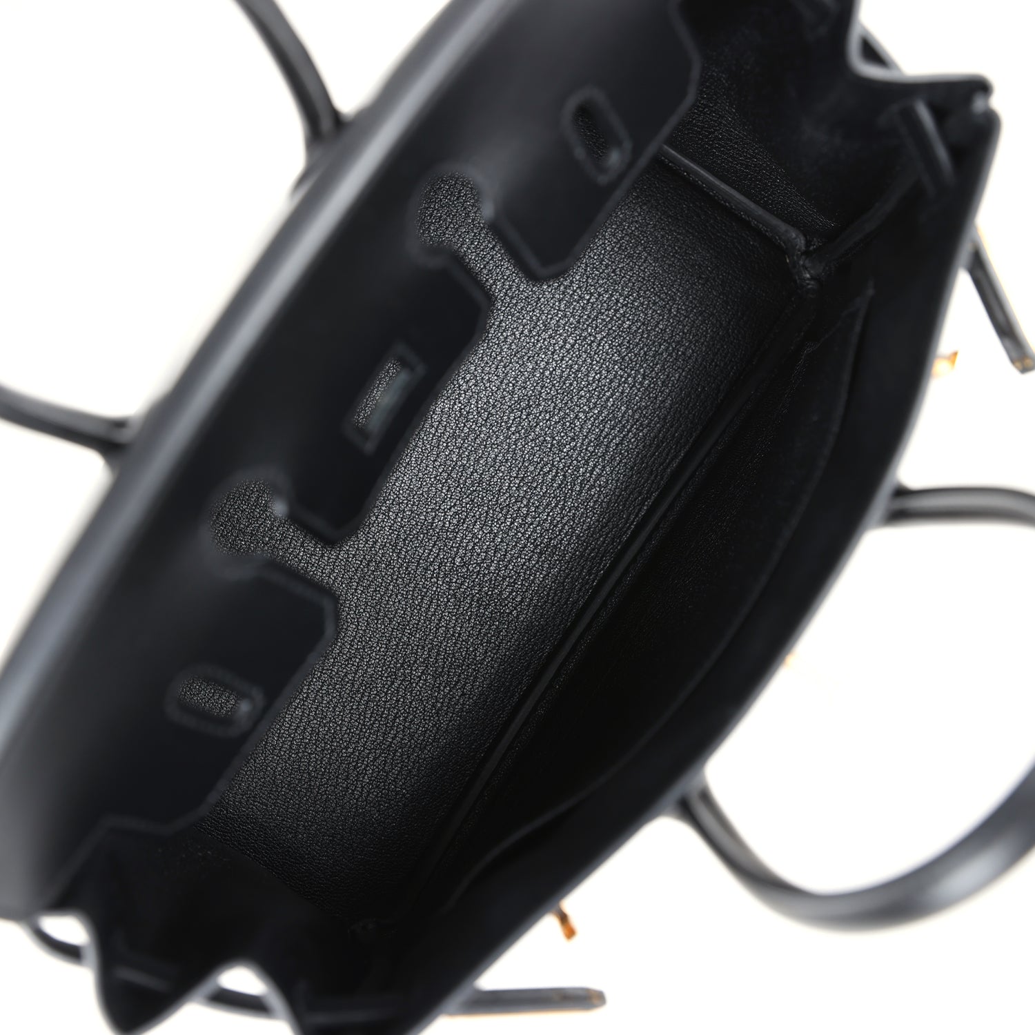 This Birkin is in Black box calf leather with gold hardware and has tonal stitching, front flap, two straps with center toggle closure, clochette with lock and two keys, and double rolled handles.