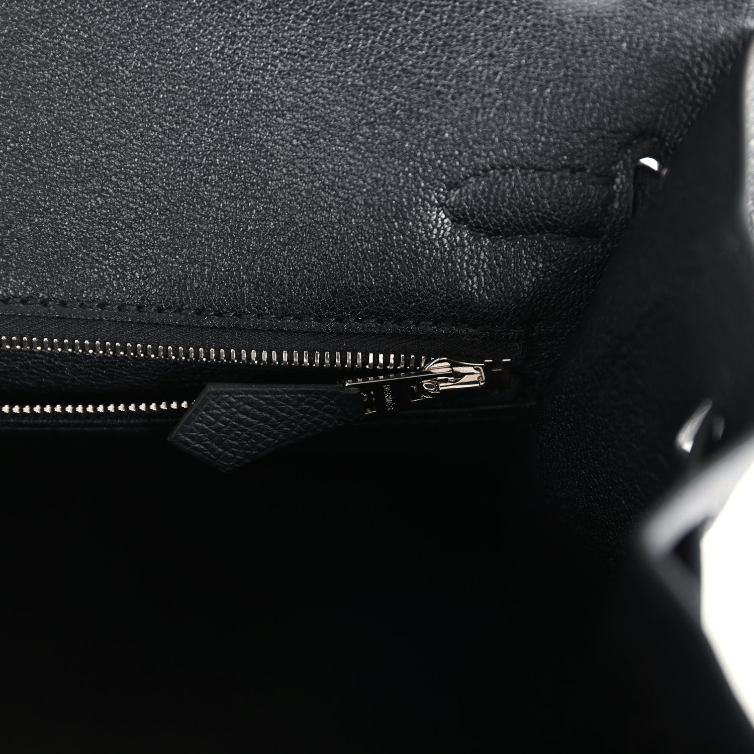 The interior is lined with Black chevre and has one zip pocket with an Hermes engraved zipper pull and an open pocket on the opposite side.