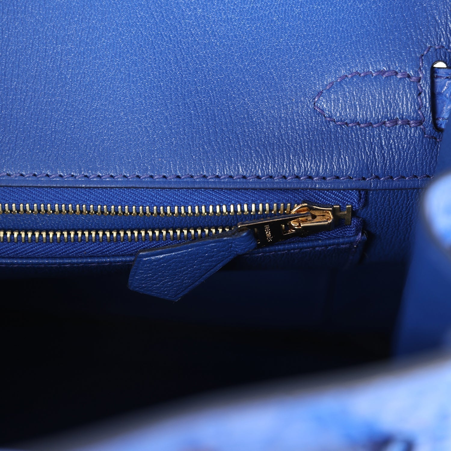 The interior is lined with Bleu Royal chevre and has one zip pocket with an Hermes engraved zipper pull and an open pocket on the opposite side.
