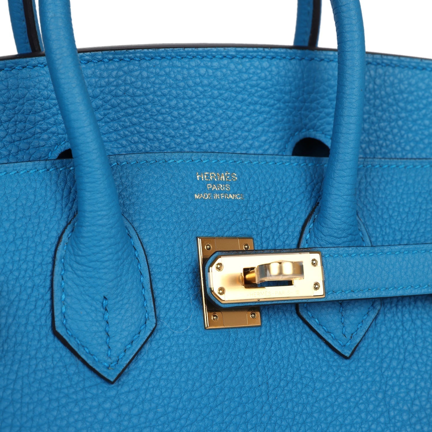 This Birkin is in Bleu Zanzibar Togo leather with gold hardware, tonal stitching, front flap with two straps, front toggle closure, clochette with lock and two keys, and double rolled handles.
