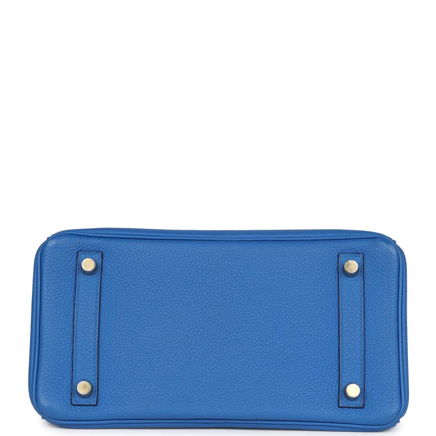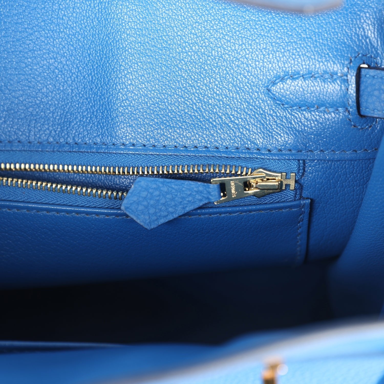 This Birkin is in Bleu Zellige togo leather with gold hardware and has tonal stitching, front flap, two straps with center toggle closure, clochette with lock and two keys, and double rolled handles.