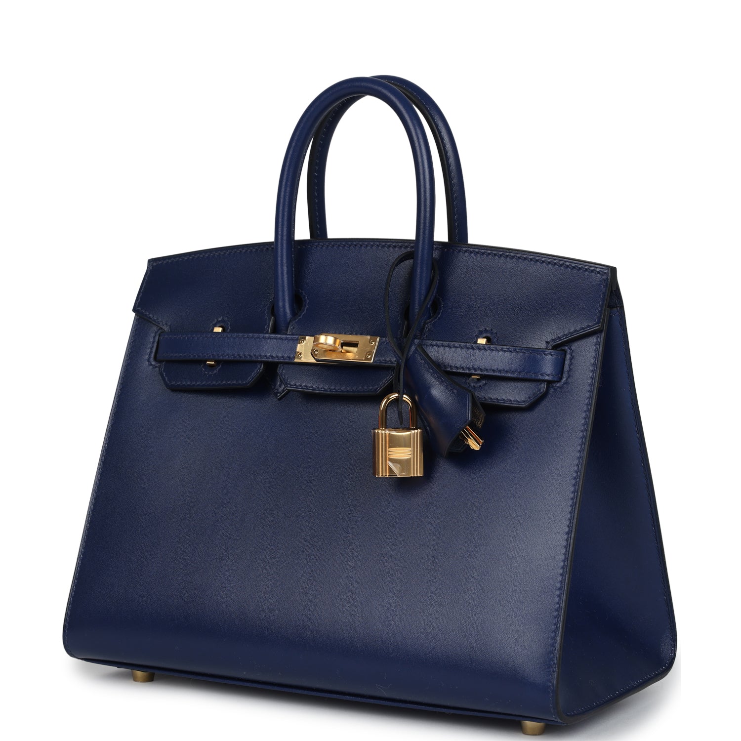 This Birkin is in Bleu Saphir Box calfskin leather with gold hardware and has tonal stitching, front flap, two straps with center toggle closure, clochette with lock and two keys, and double rolled handles.