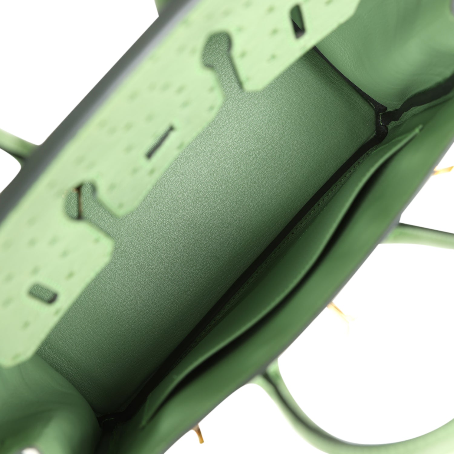 This Birkin is in Vert Criquet ostrich with gold hardware and features tonal stitching, front flap, two straps with center toggle closure, clochette with lock and two keys, and double rolled handles.