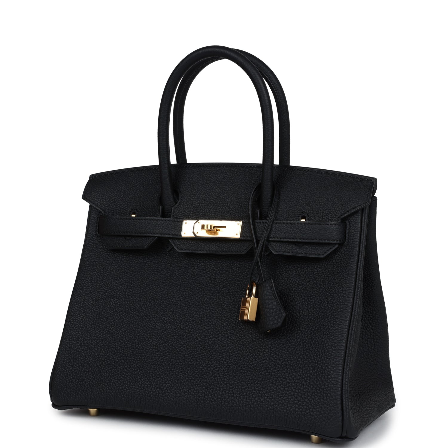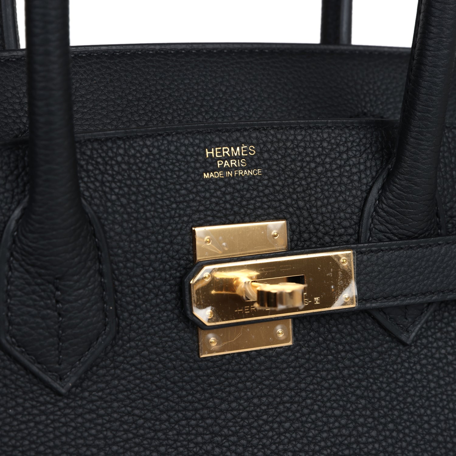 This Birkin is in Black togo leather with gold hardware and has tonal stitching, front flap, two straps with center toggle closure, clochette with lock and two keys, and double rolled handles.