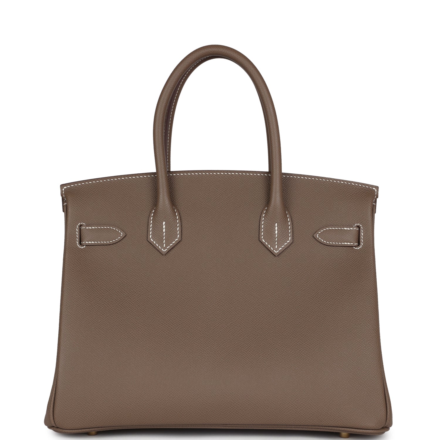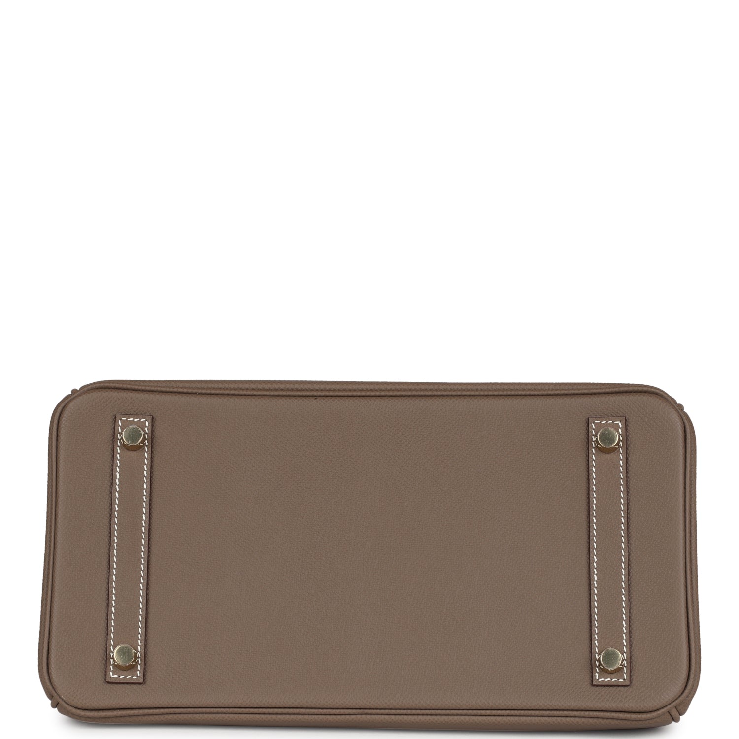 This Birkin is in Etoupe epsom leather with gold hardware and has contrast stitching, two straps with front toggle closure, clochette with lock and two keys and double rolled handles.