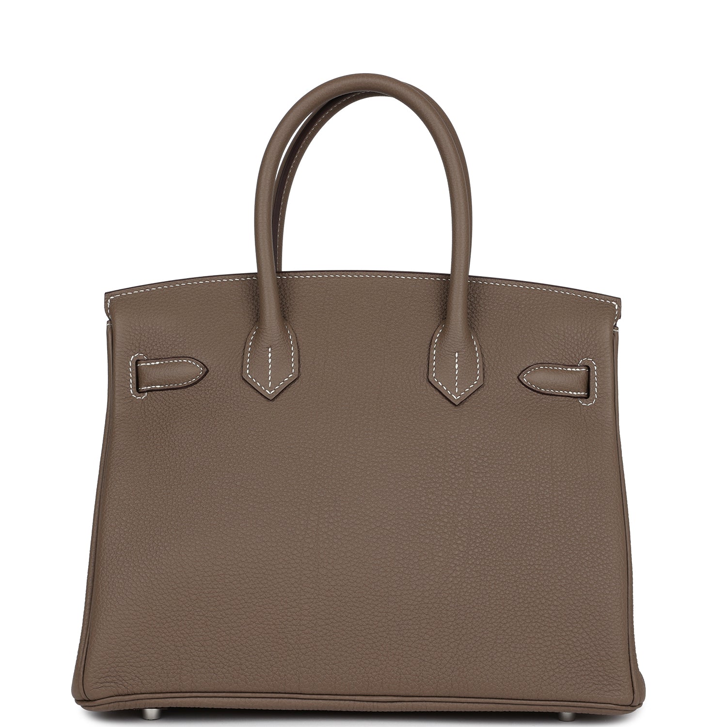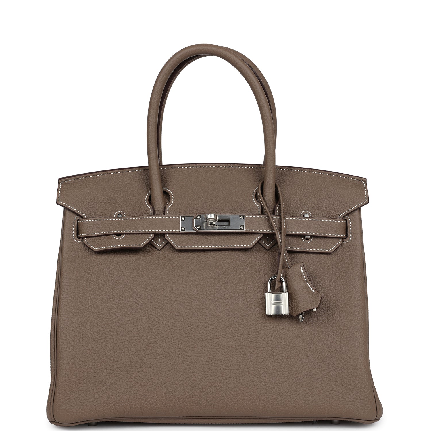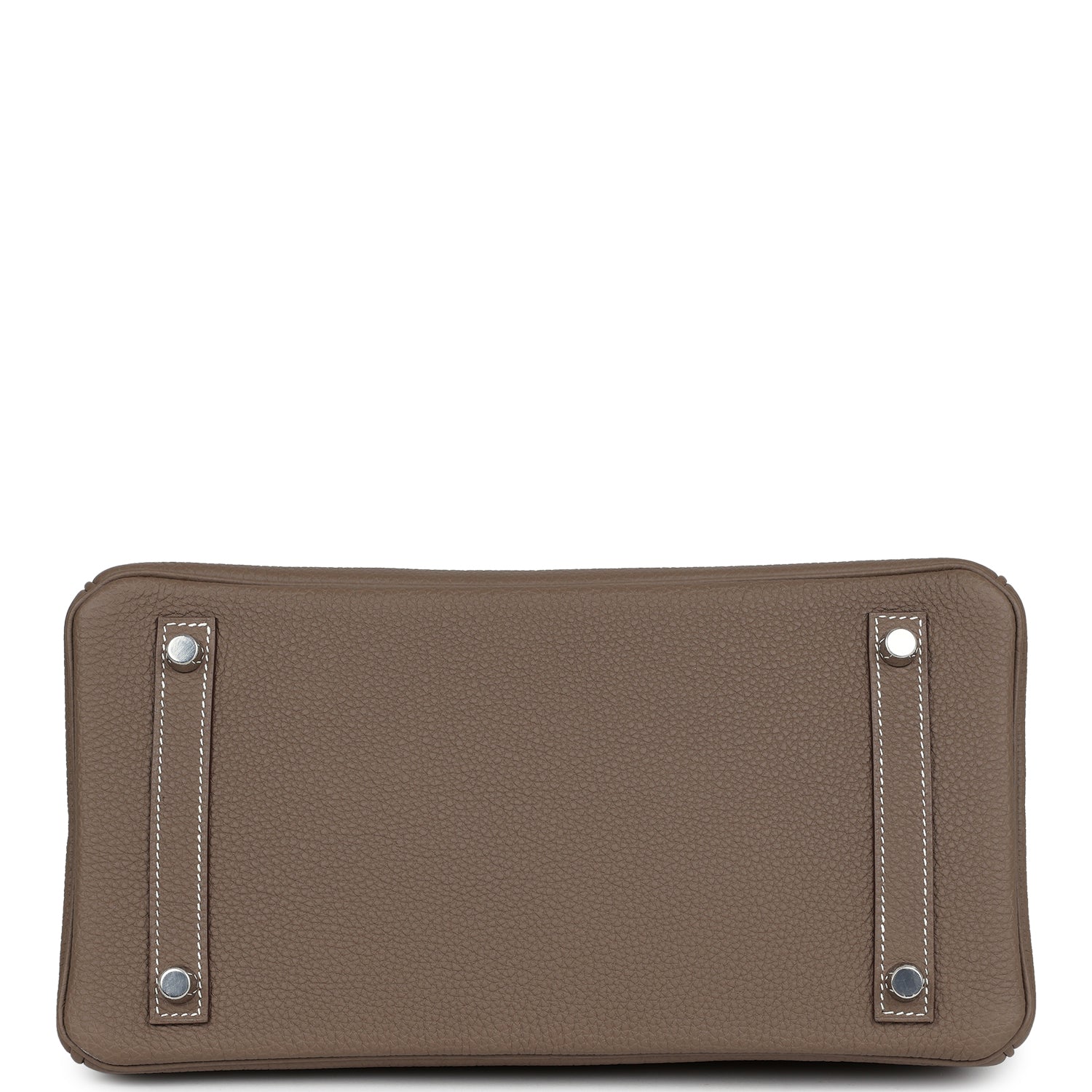 This Birkin is in Etoupe togo leather with palladium hardware and has contrast stitching, two straps with front toggle closure, clochette with lock and two keys and double rolled handles.