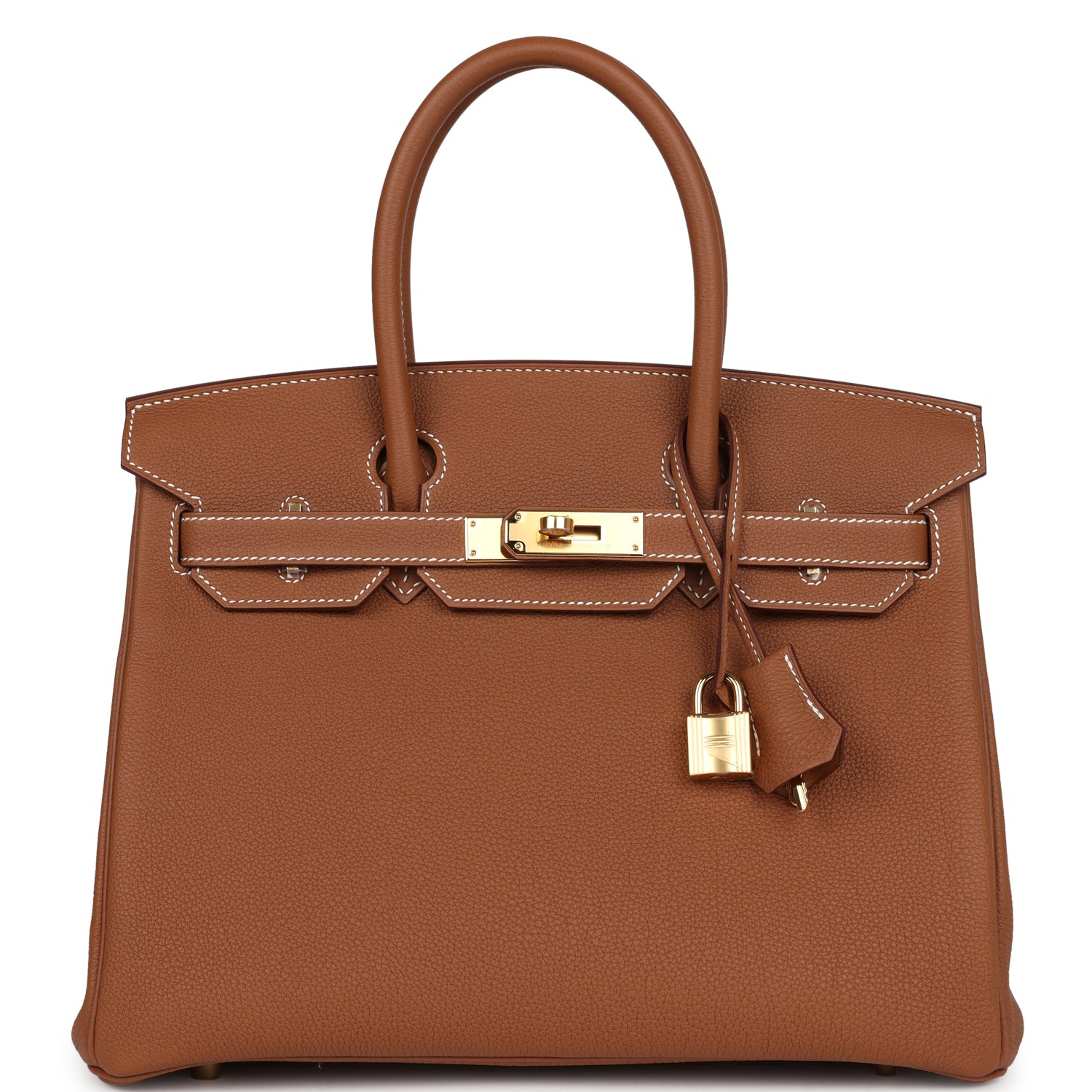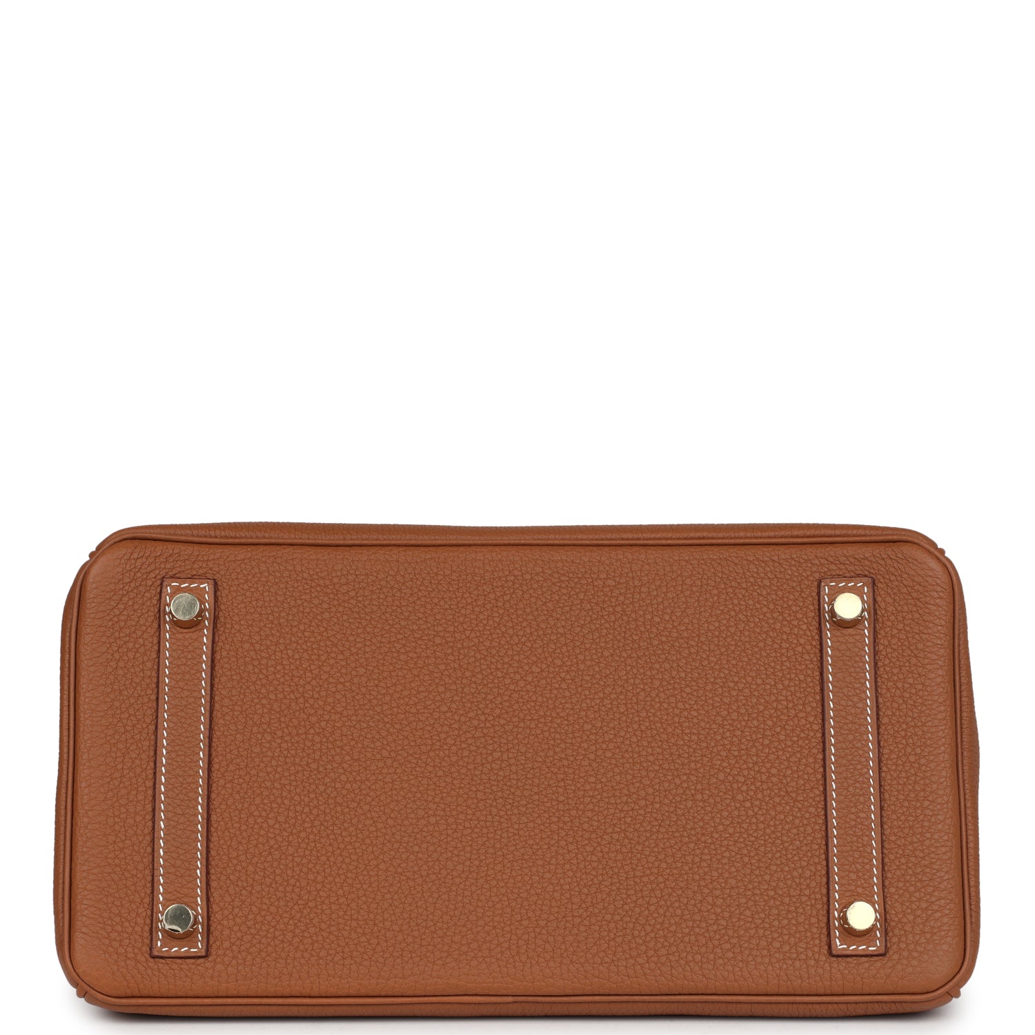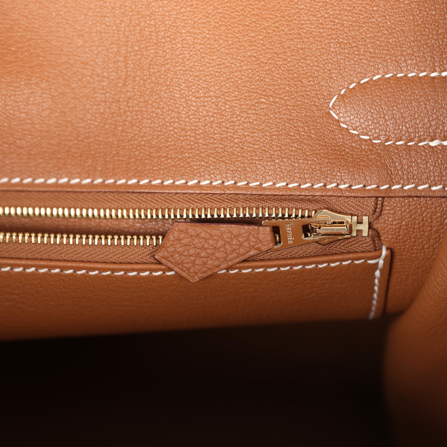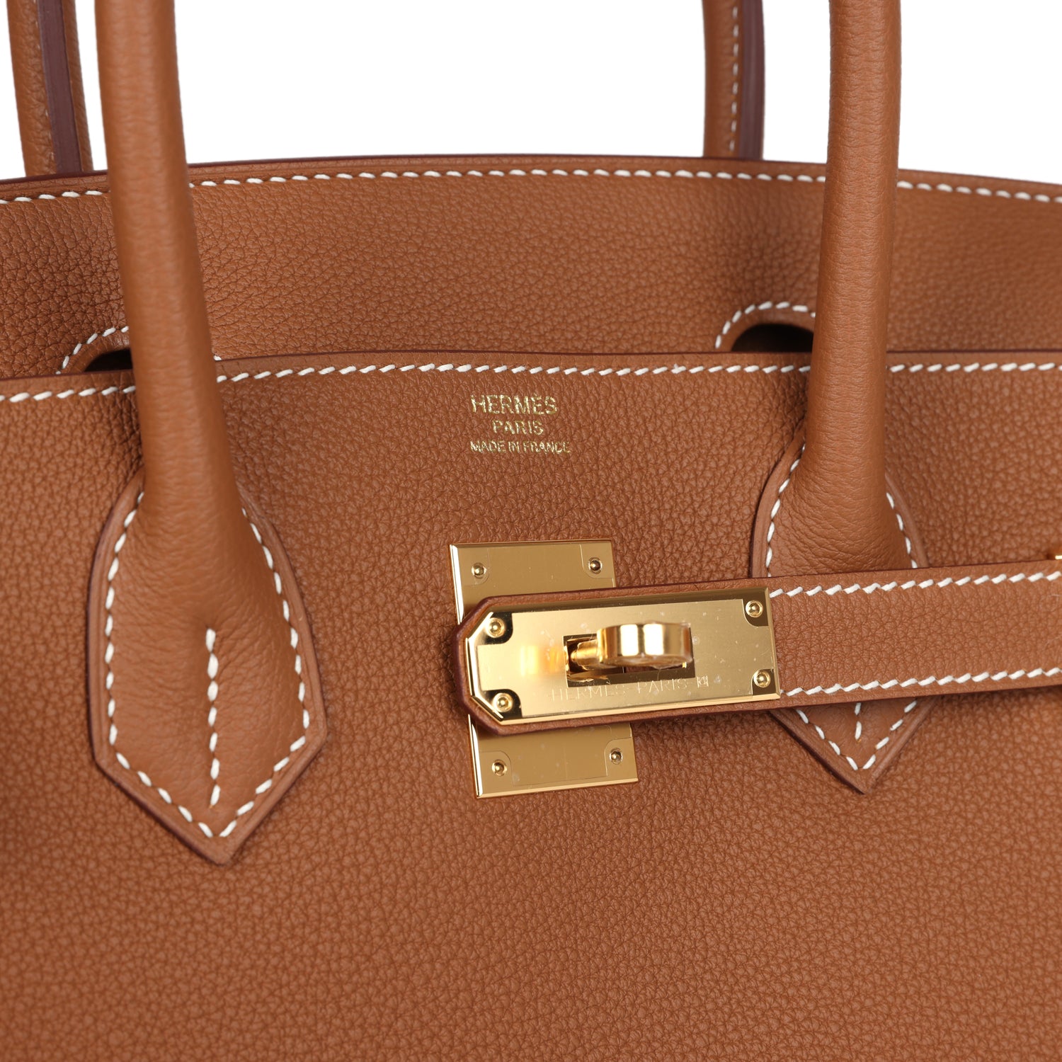 This Birkin is in Gold togo leather with gold hardware and has contrast stitching, front flap, two straps with center toggle closure, clochette with lock and two keys, and double rolled handles.