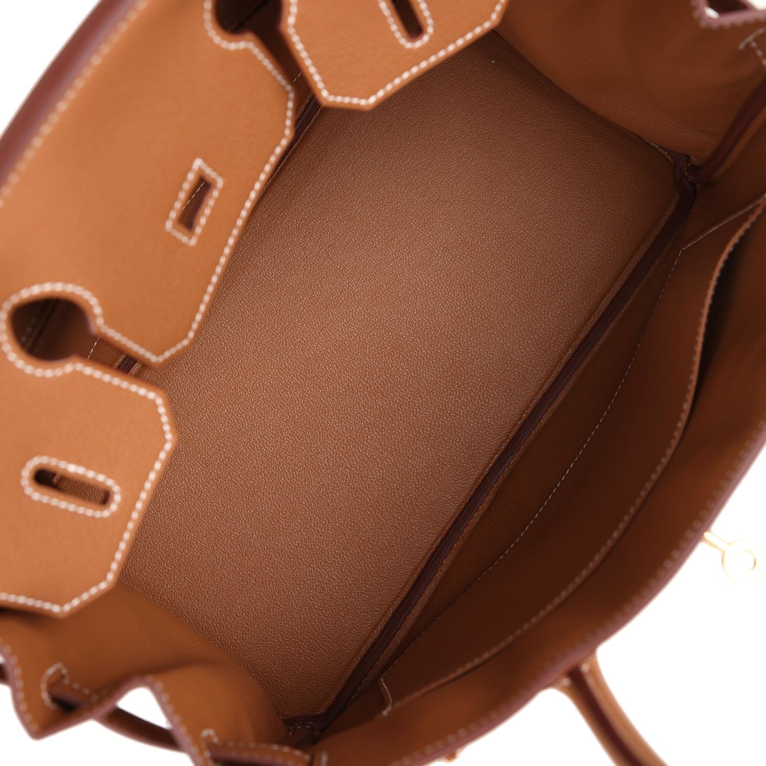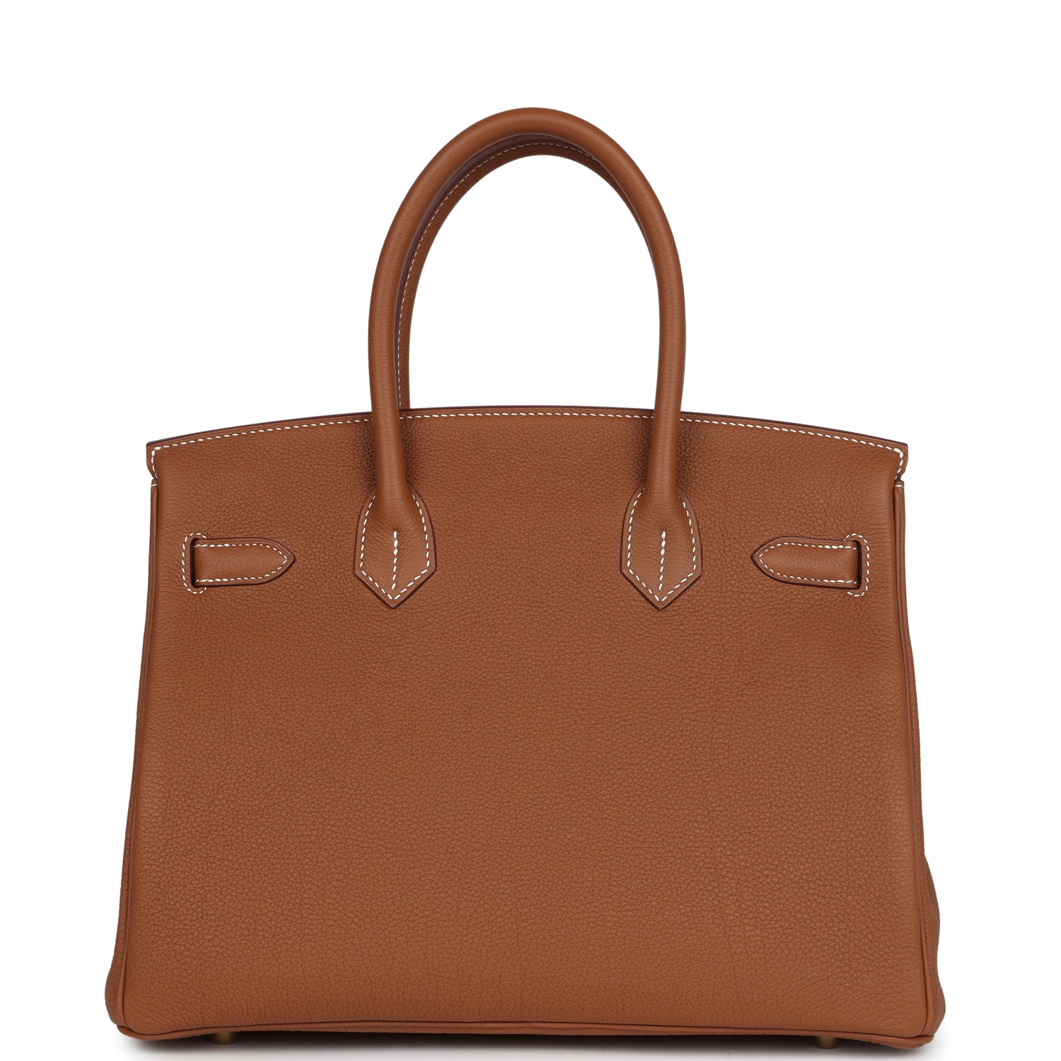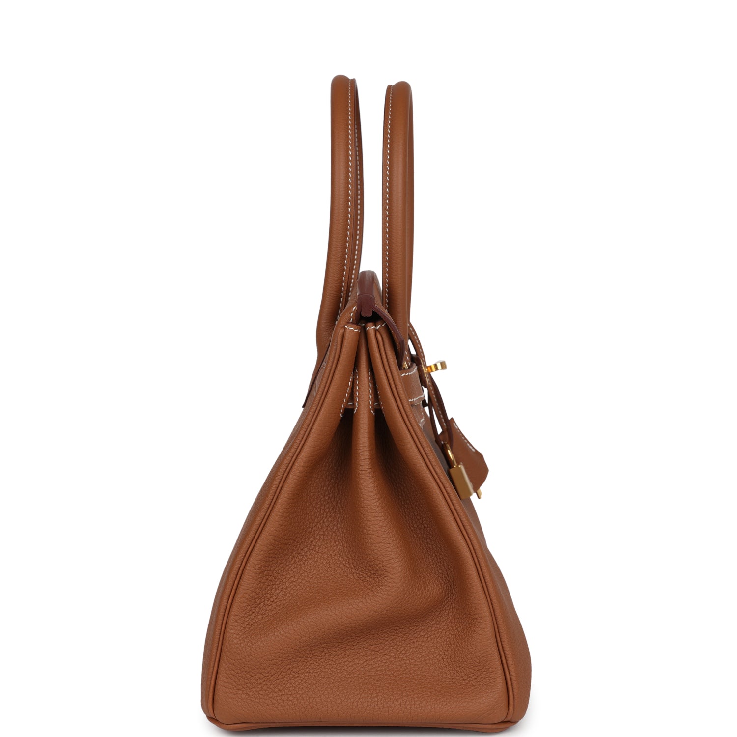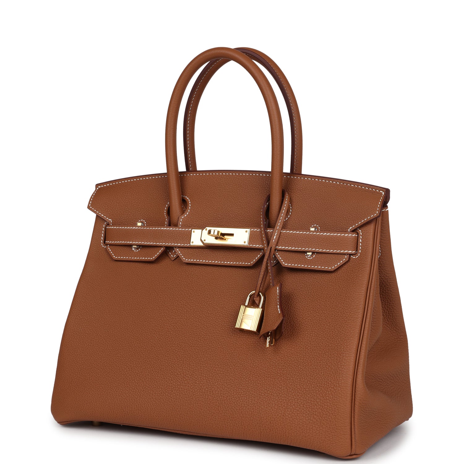 This Birkin is in Gold togo leather with gold hardware and has contrast stitching, front flap, two straps with center toggle closure, clochette with lock and two keys, and double rolled handles.