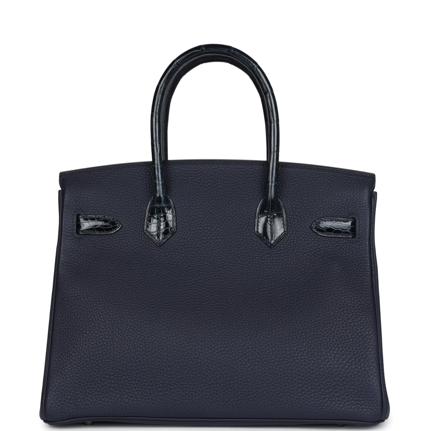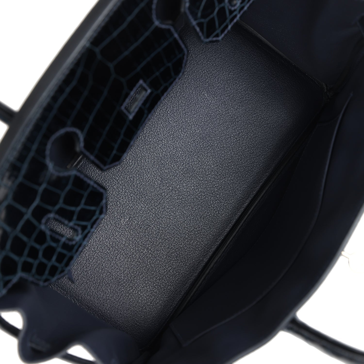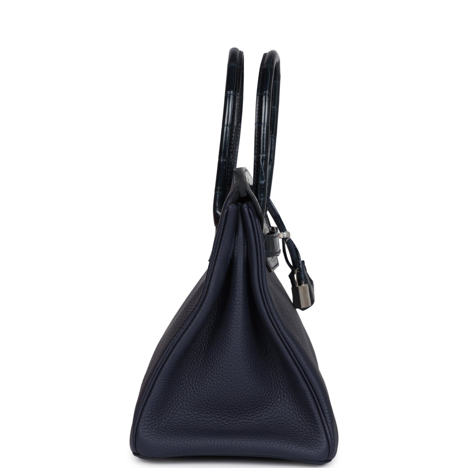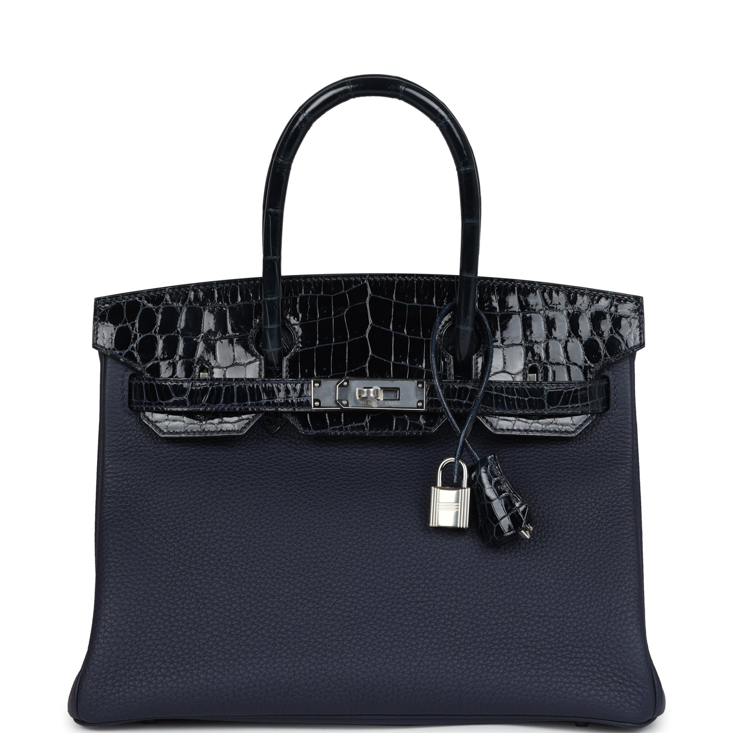 This Birkin "Touch" is in Bleu Baltique Shiny Niloticus Crocodile and Bleu Nuit togo leather with palladium hardware and has tonal stitching, two straps with front toggle closure, clochette with lock and two keys and double rolled crocodile handles.