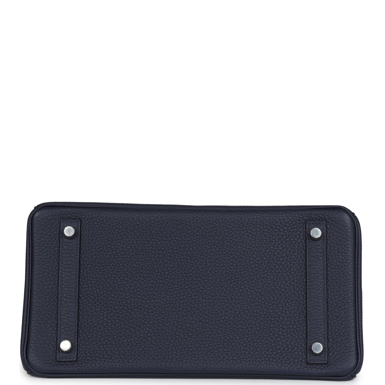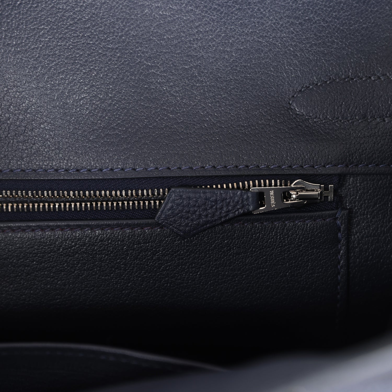 The interior is lined with Bleu Nuit chevre and has a zip pocket with an Hermes engraved zipper pull and an open pocket on the opposite side.