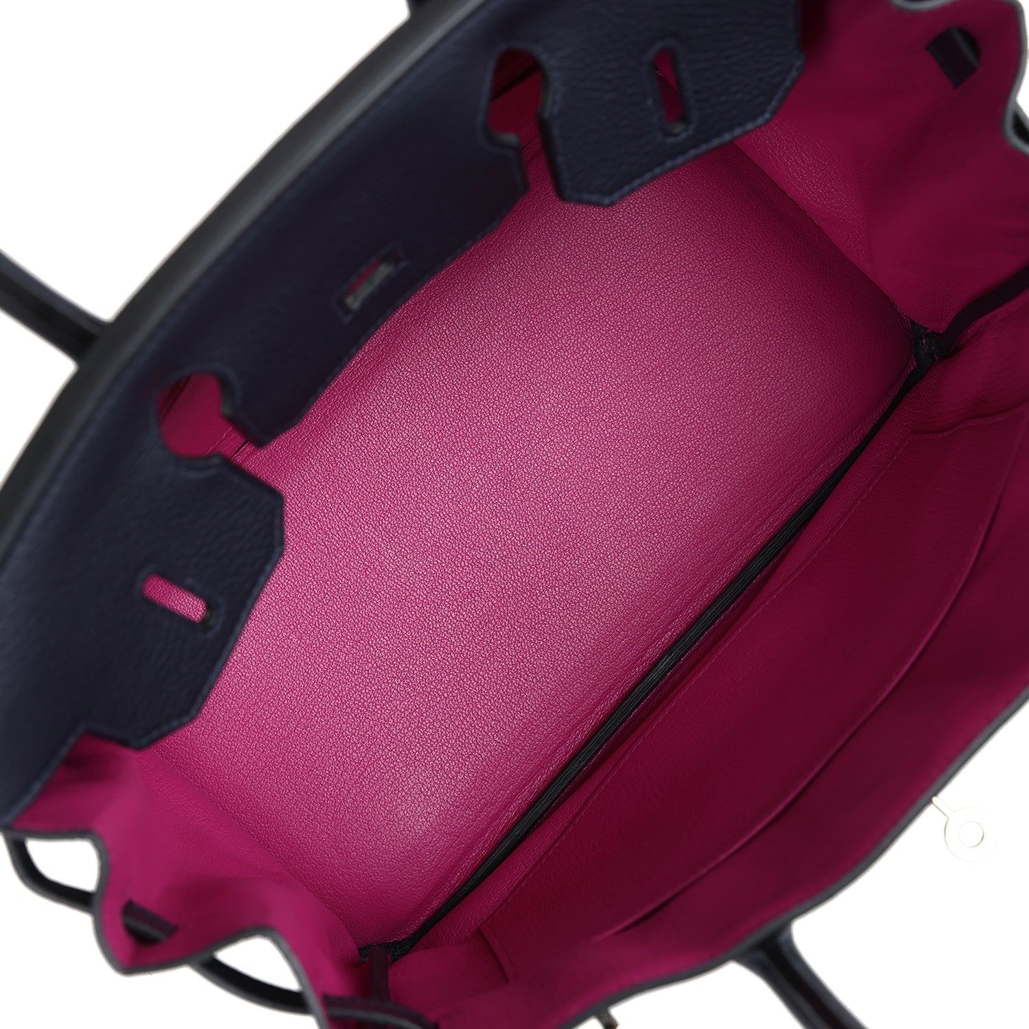 The interior is lined with Rose Pourpre chevre and has one zip pocket with an Hermes engraved zipper pull and an open pocket on the opposite side.