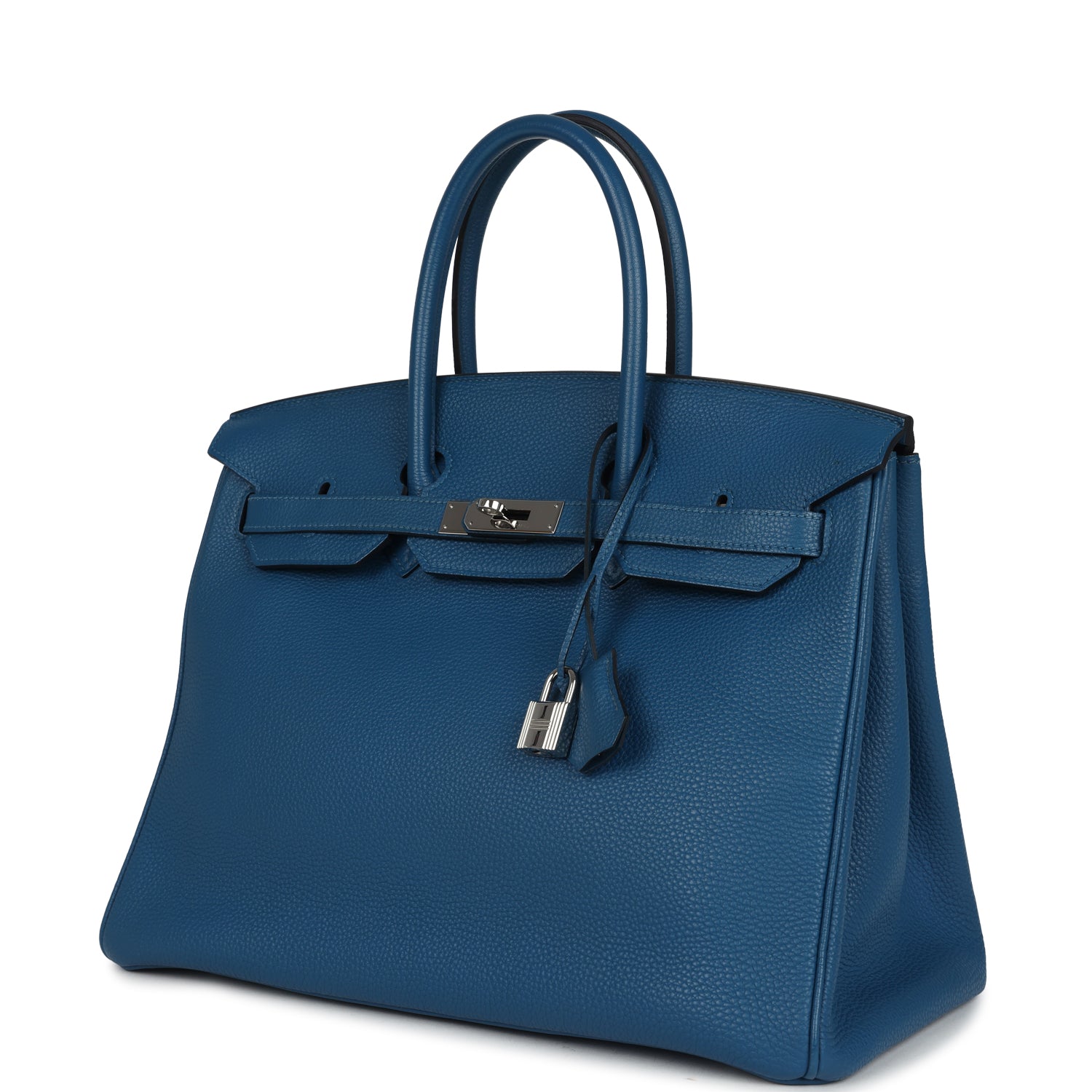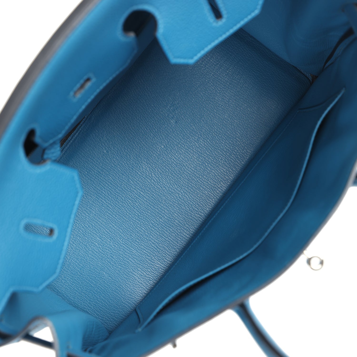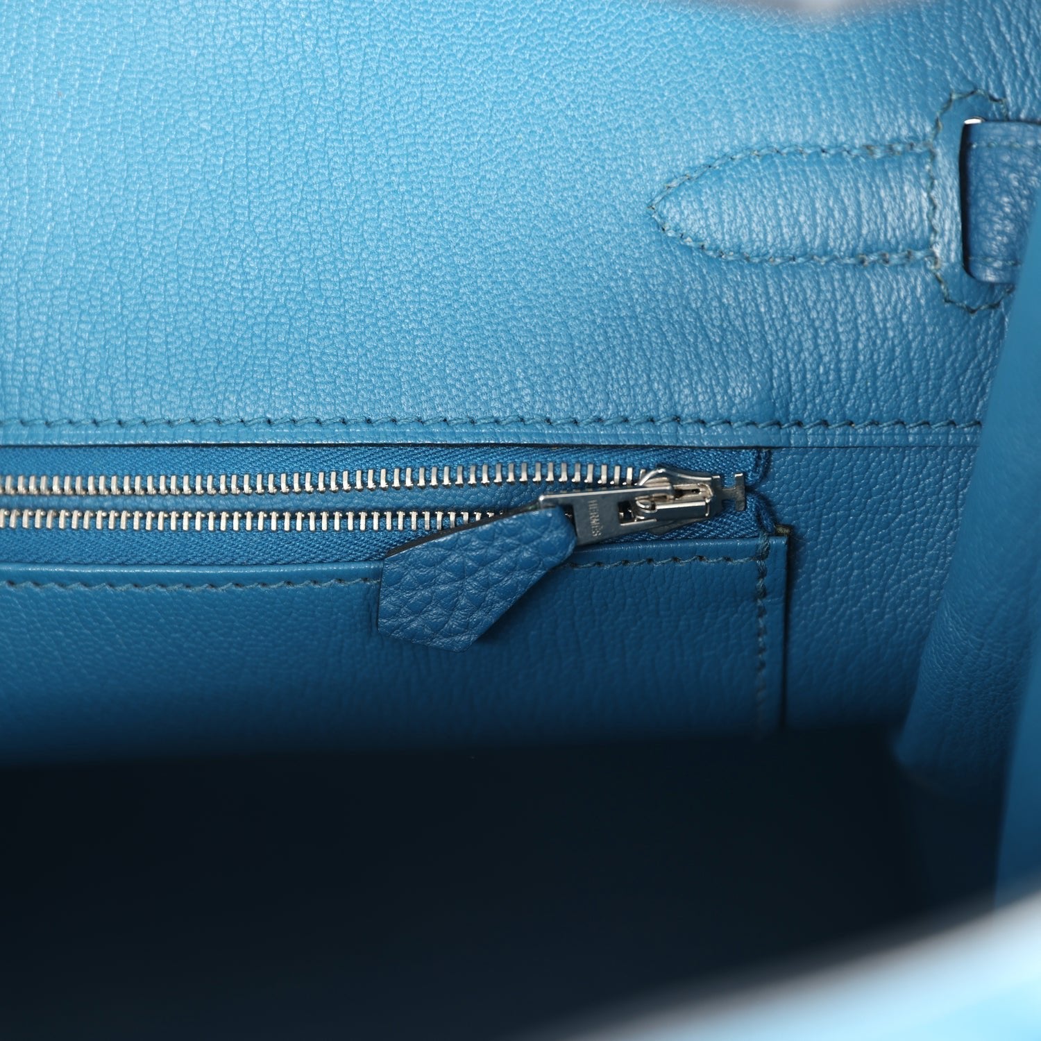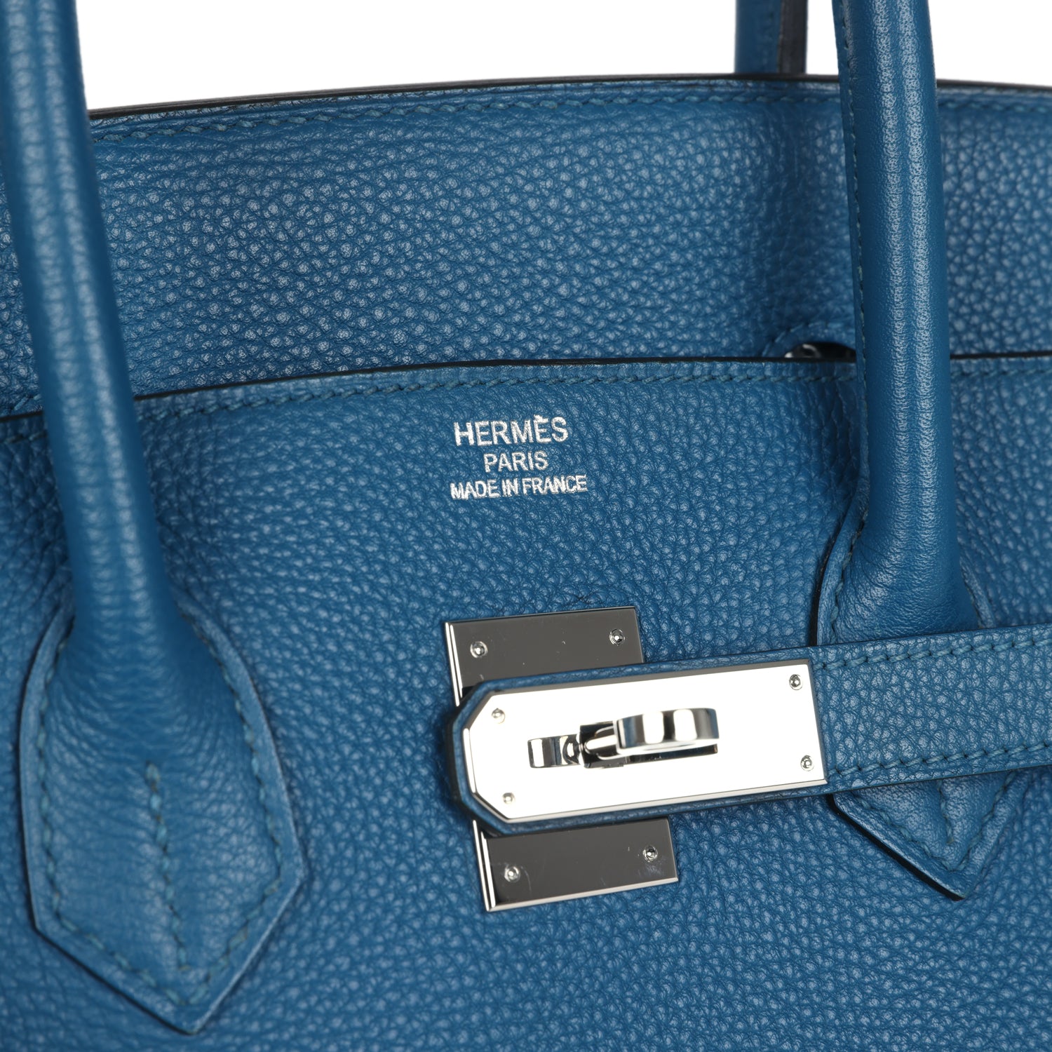 This Birkin is Bleu De Galice togo leather with palladium hardware and has tonal stitching, front flap, two straps with center toggle closure, clochette with lock and two keys, and double rolled handles.