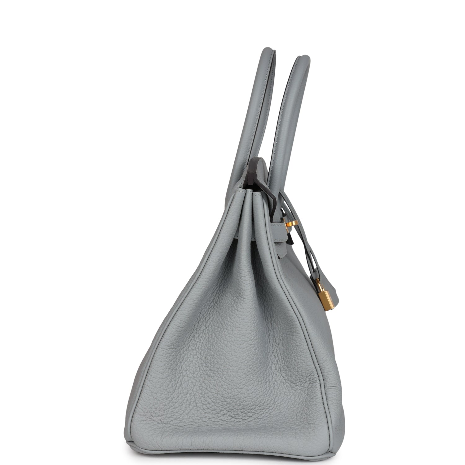 This Birkin is in Bleu Glacier togo leather with gold hardware and has tonal stitching, front flap, two straps with center toggle closure, clochette with lock and two keys, and double rolled handles.