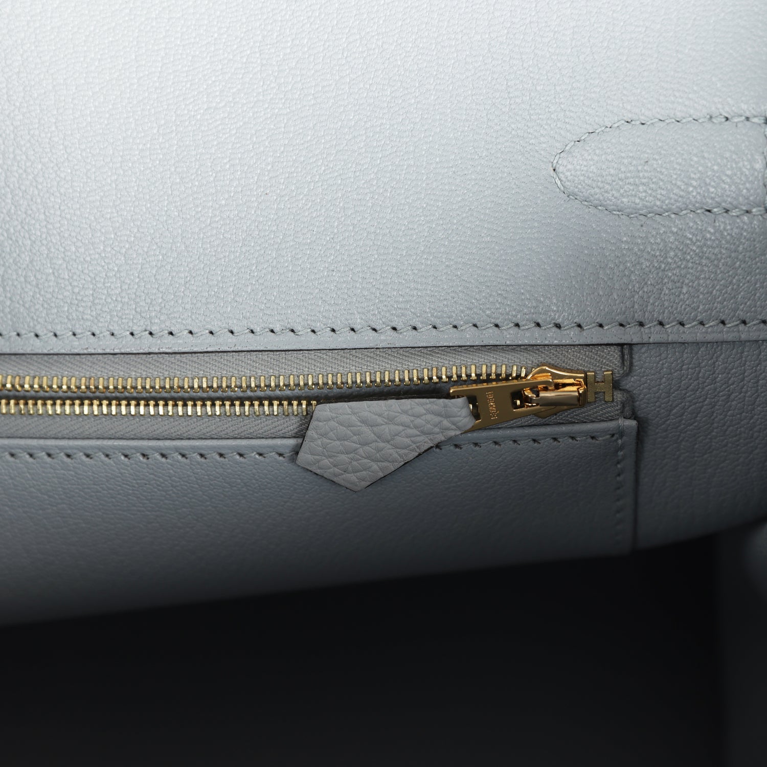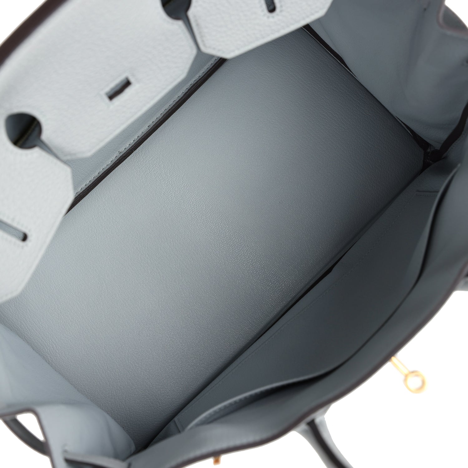 The interior is lined with Bleu Glacier chevre and has one zip pocket with an Hermes engraved zipper pull and an open pocket on the opposite side.