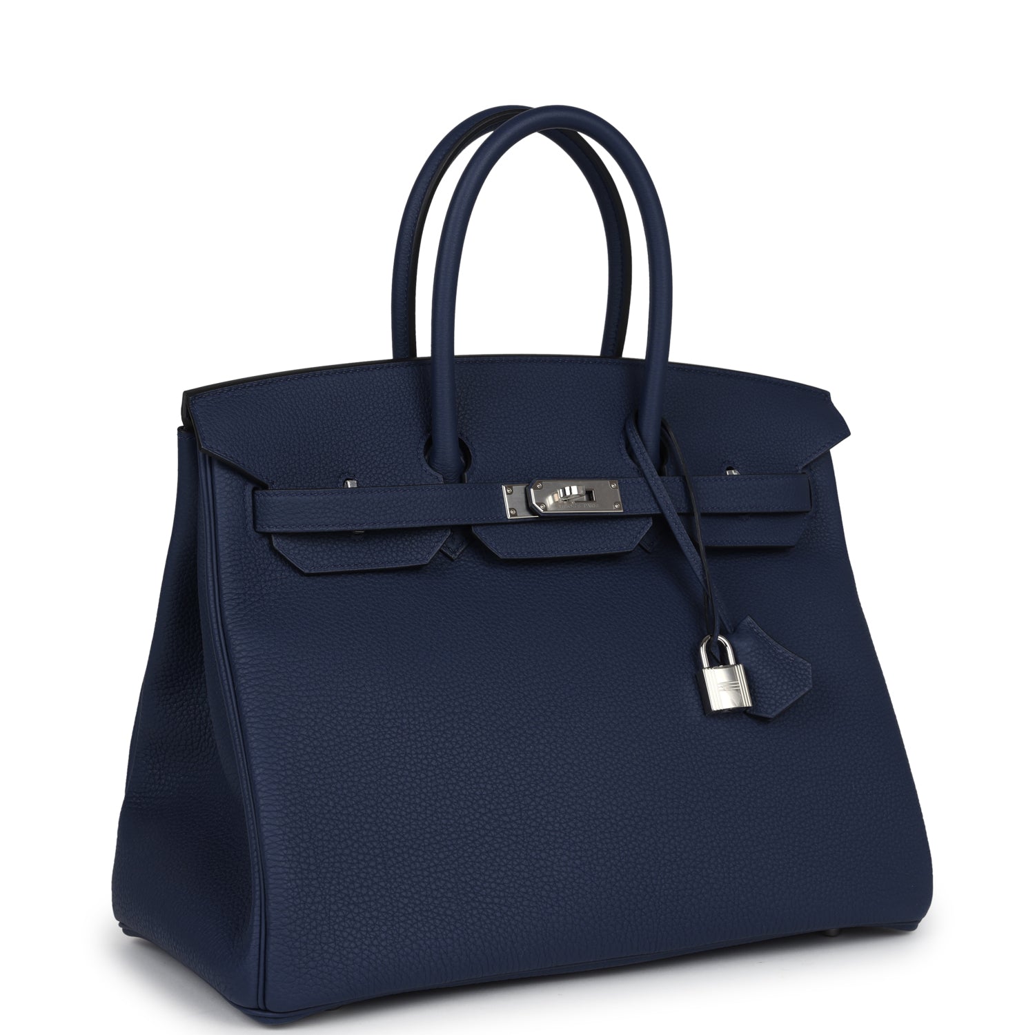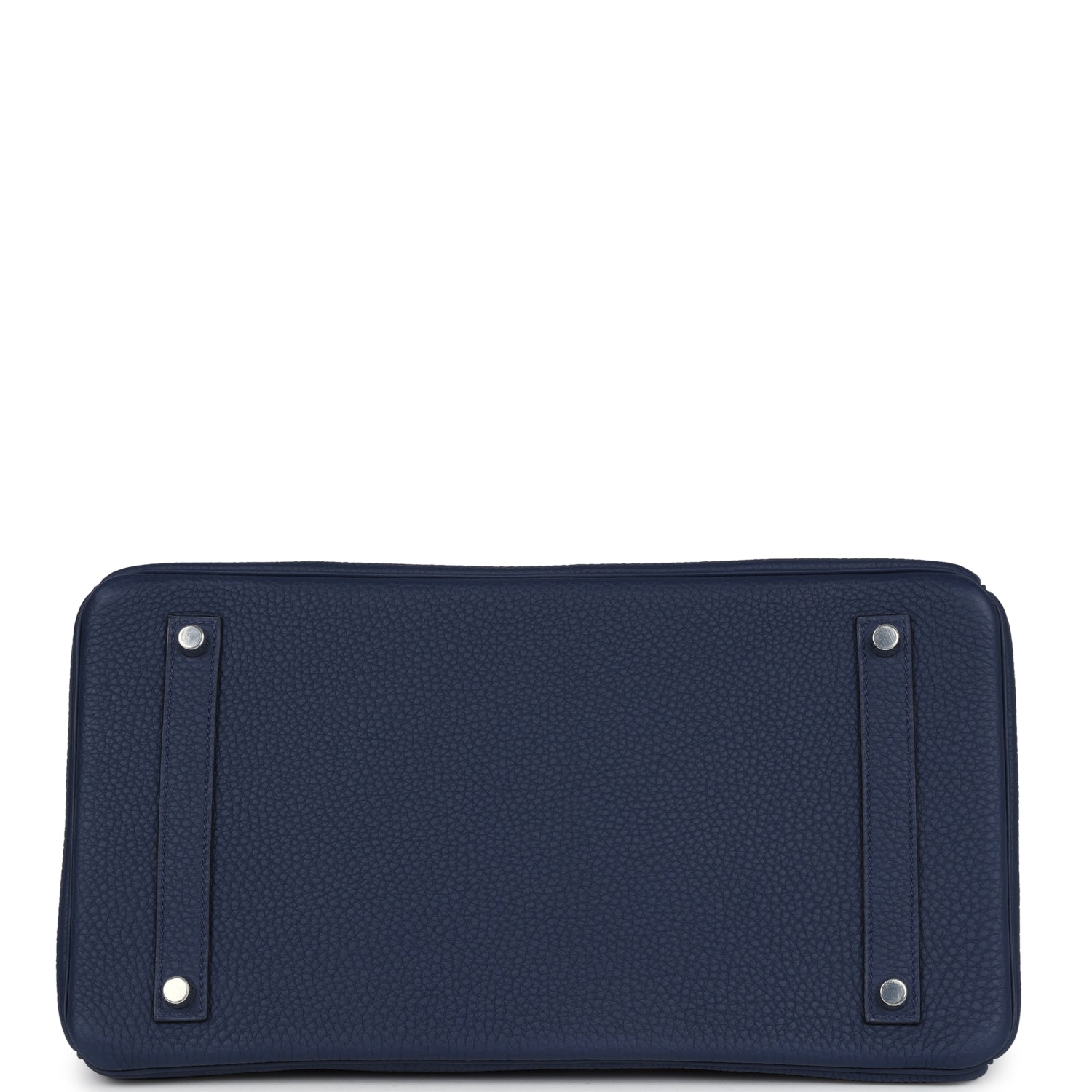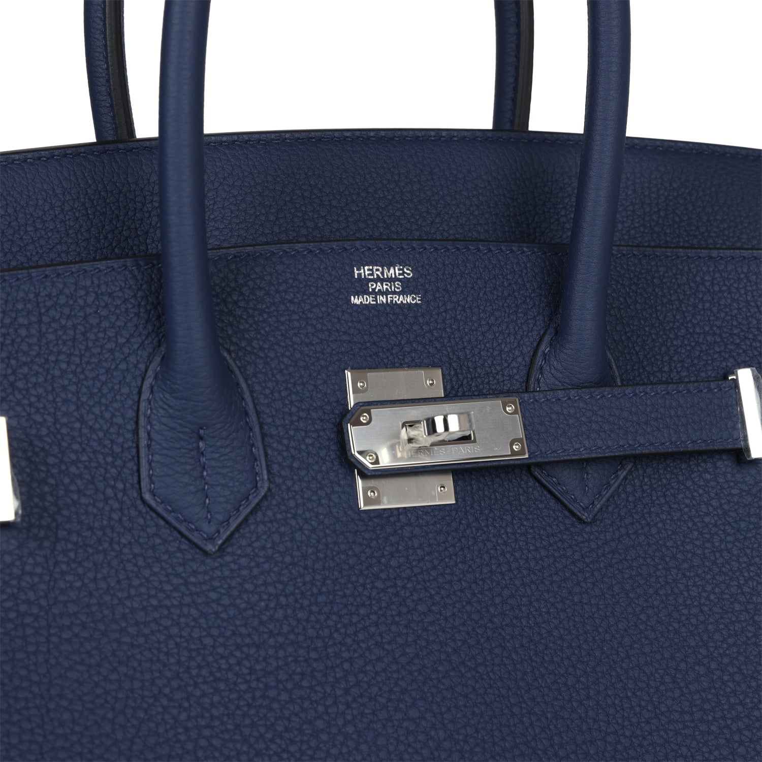 This Birkin is in Bleu Navy togo leather with palladium hardware features tonal stitching, front flap, two straps with center toggle closure, clochette with lock and two keys and double rolled handles.