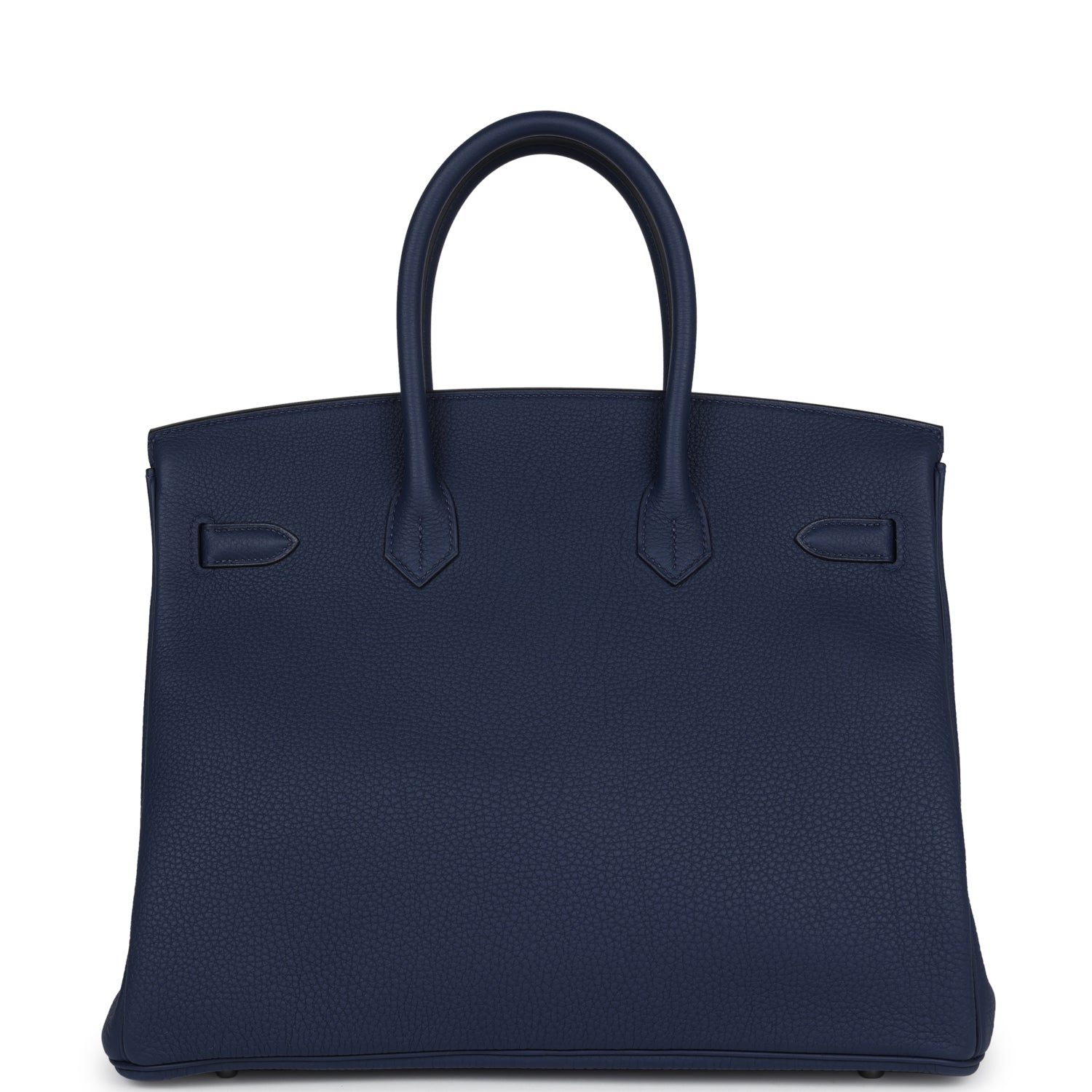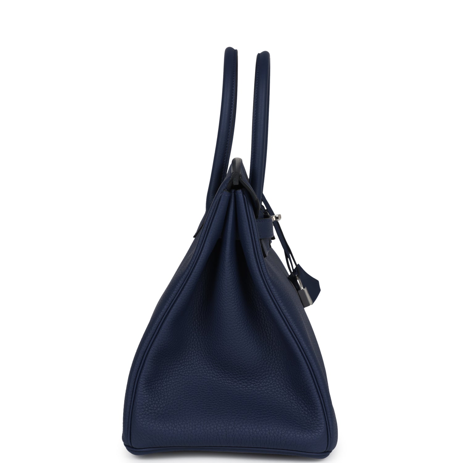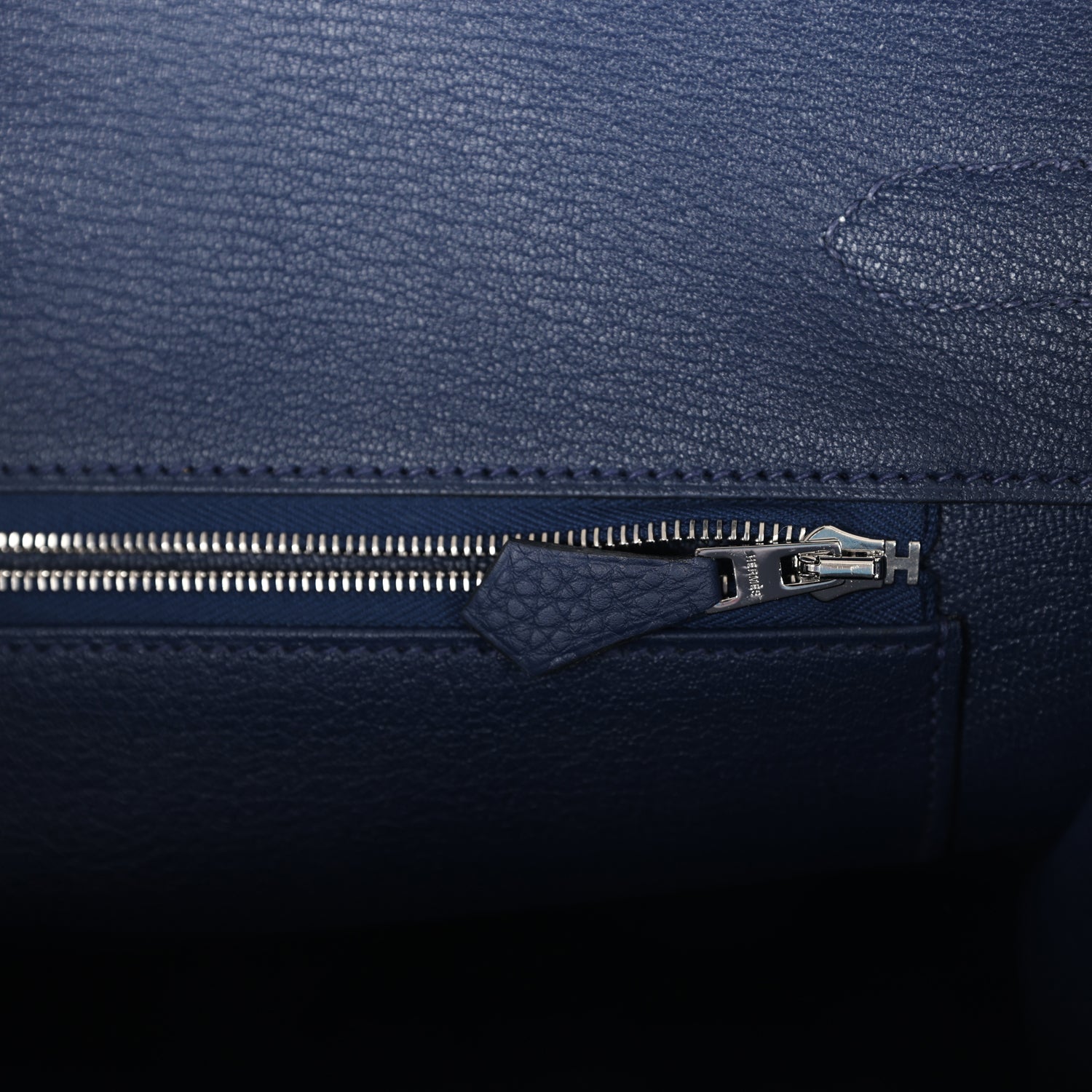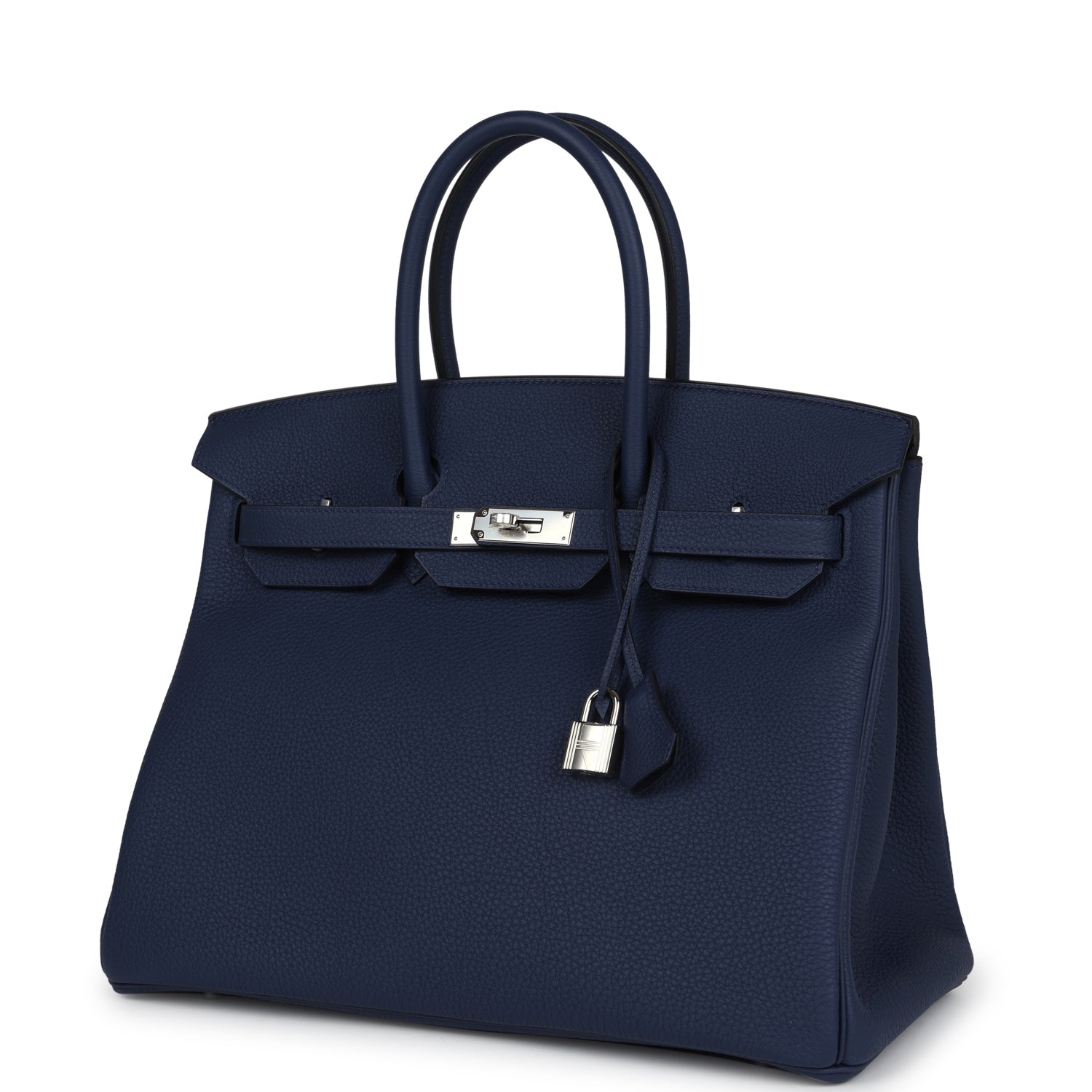 This Birkin is in Bleu Navy togo leather with palladium hardware features tonal stitching, front flap, two straps with center toggle closure, clochette with lock and two keys and double rolled handles.