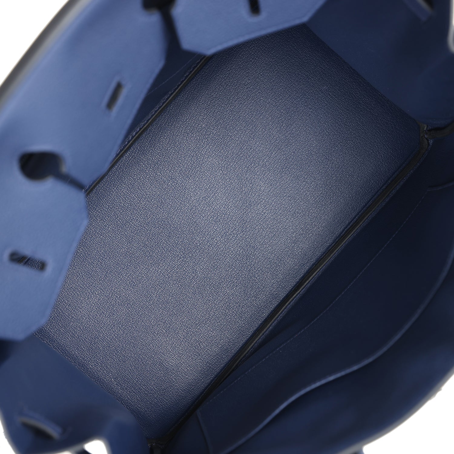 The interior is lined in Bleu Navy chevre with one zip pocket with an Hermes engraved zipper pull and an open pocket on the opposite side.