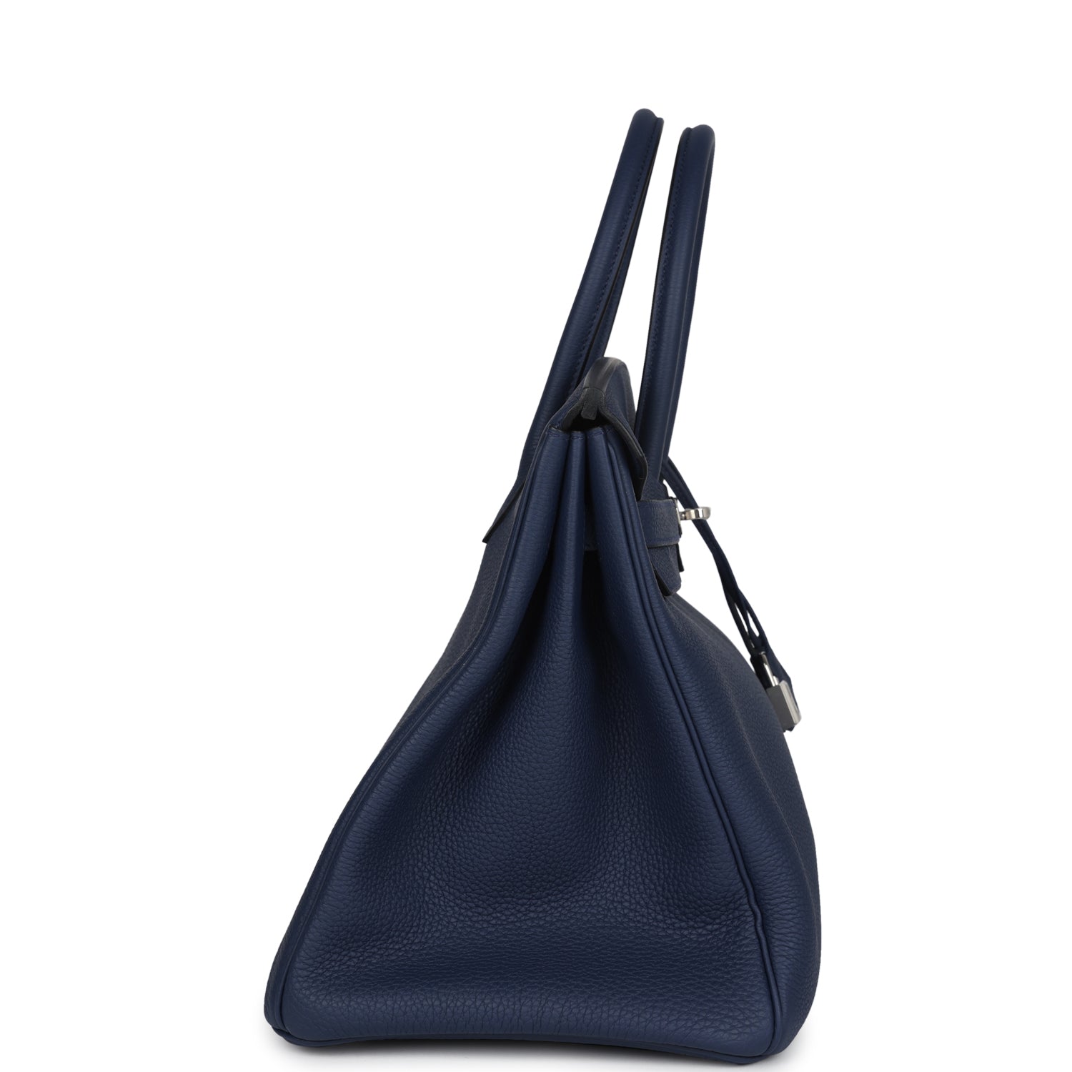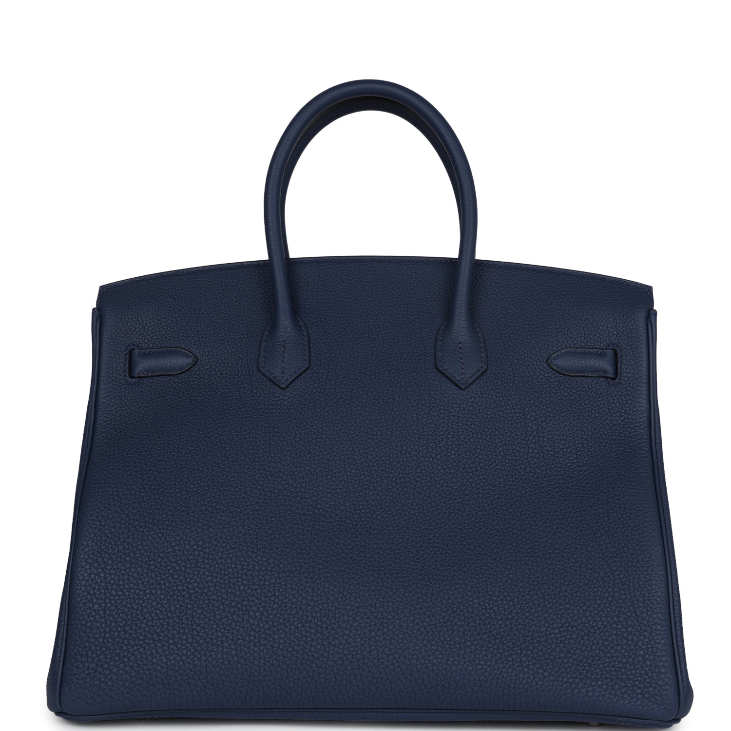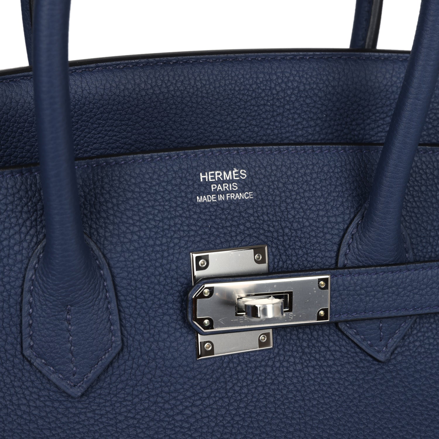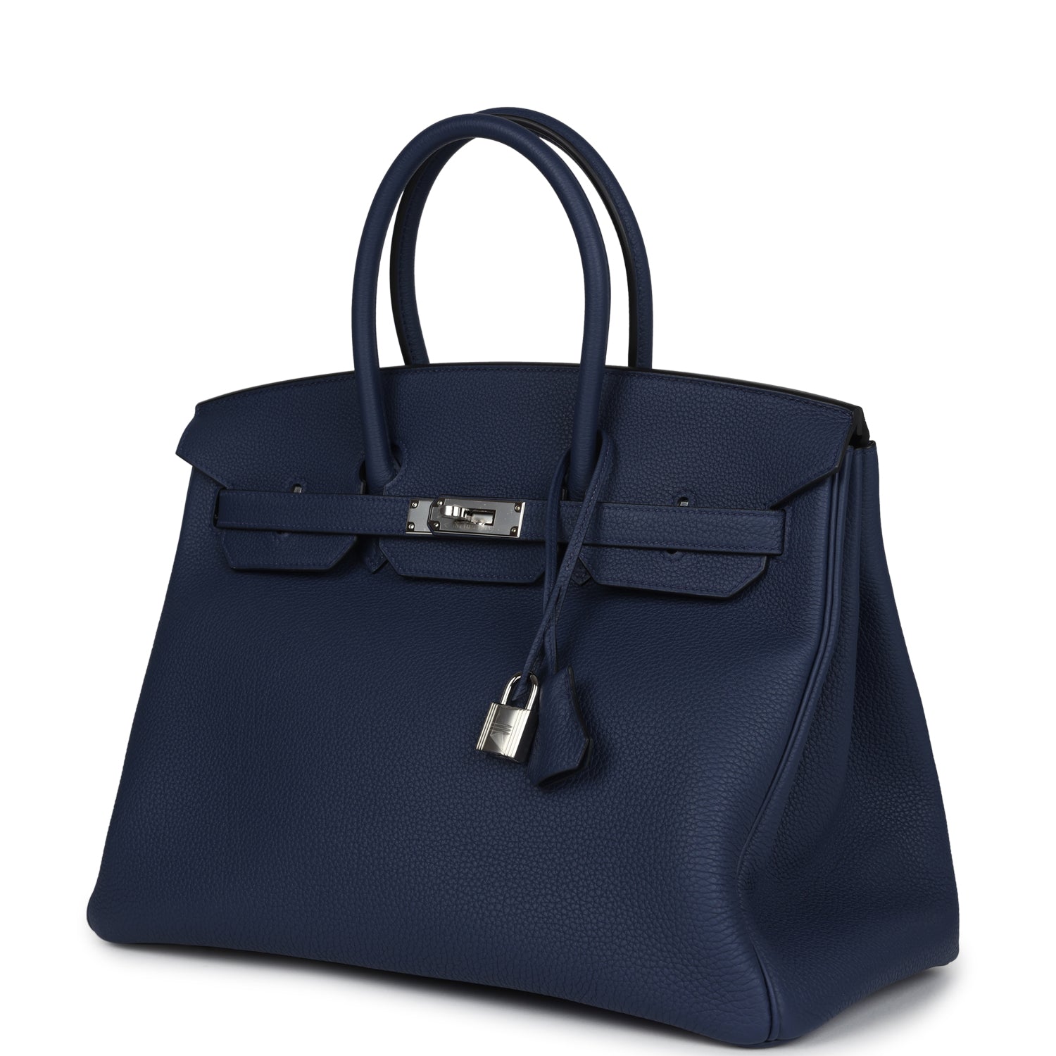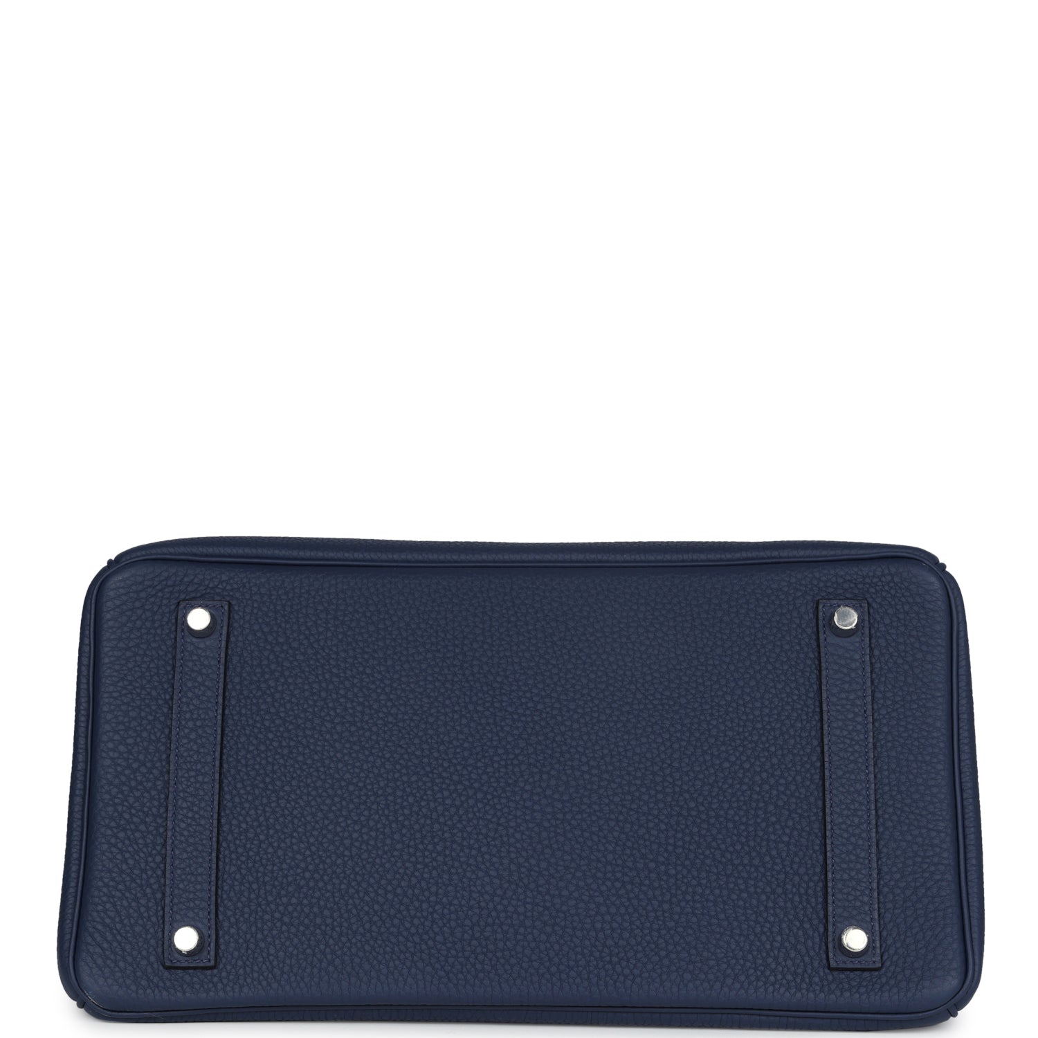 This Birkin is in Bleu Navy togo leather with palladium hardware features tonal stitching, front flap, two straps with center toggle closure, clochette with lock and two keys and double rolled handles.