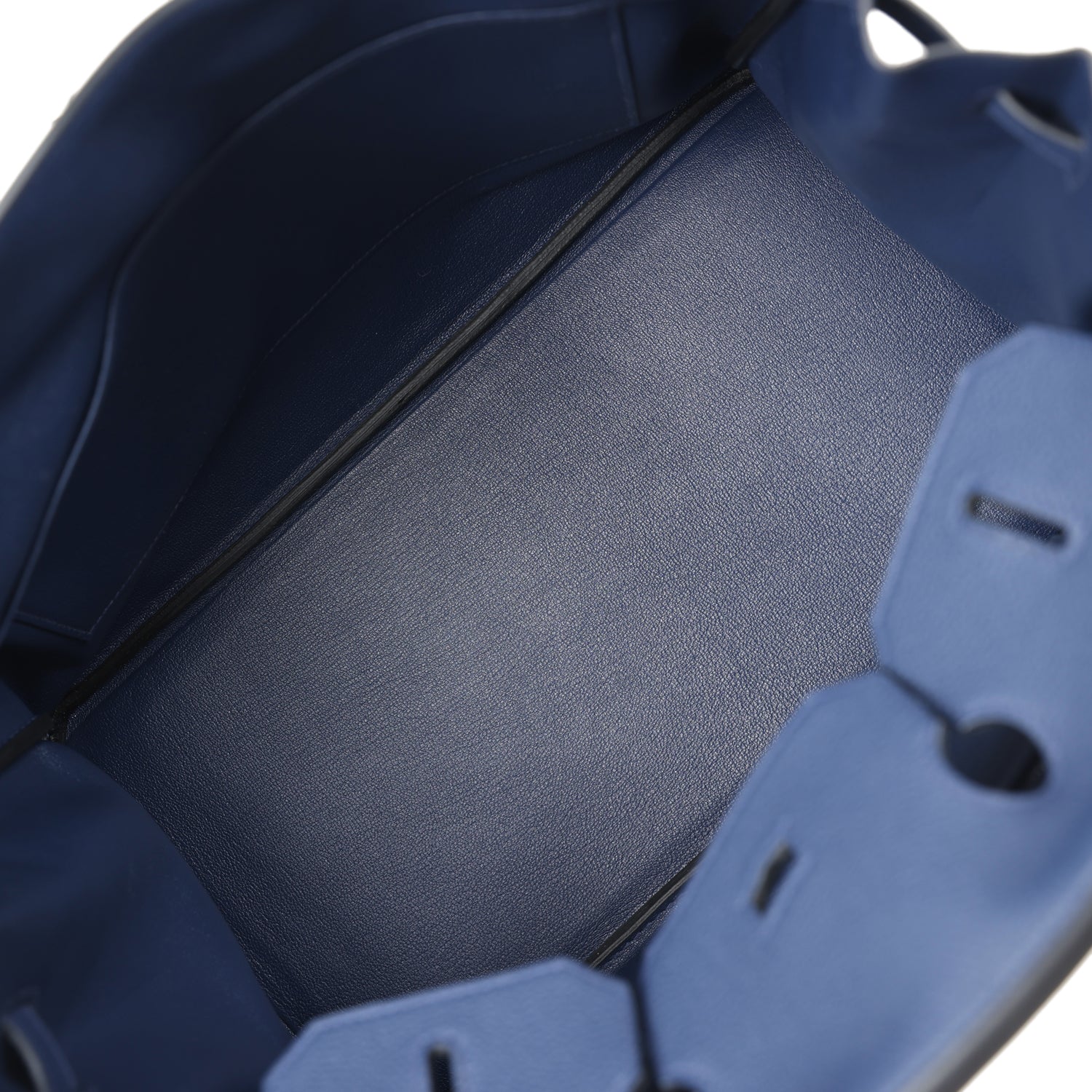 The interior is lined in Bleu Navy chevre with one zip pocket with an Hermes engraved zipper pull and an open pocket on the opposite side.