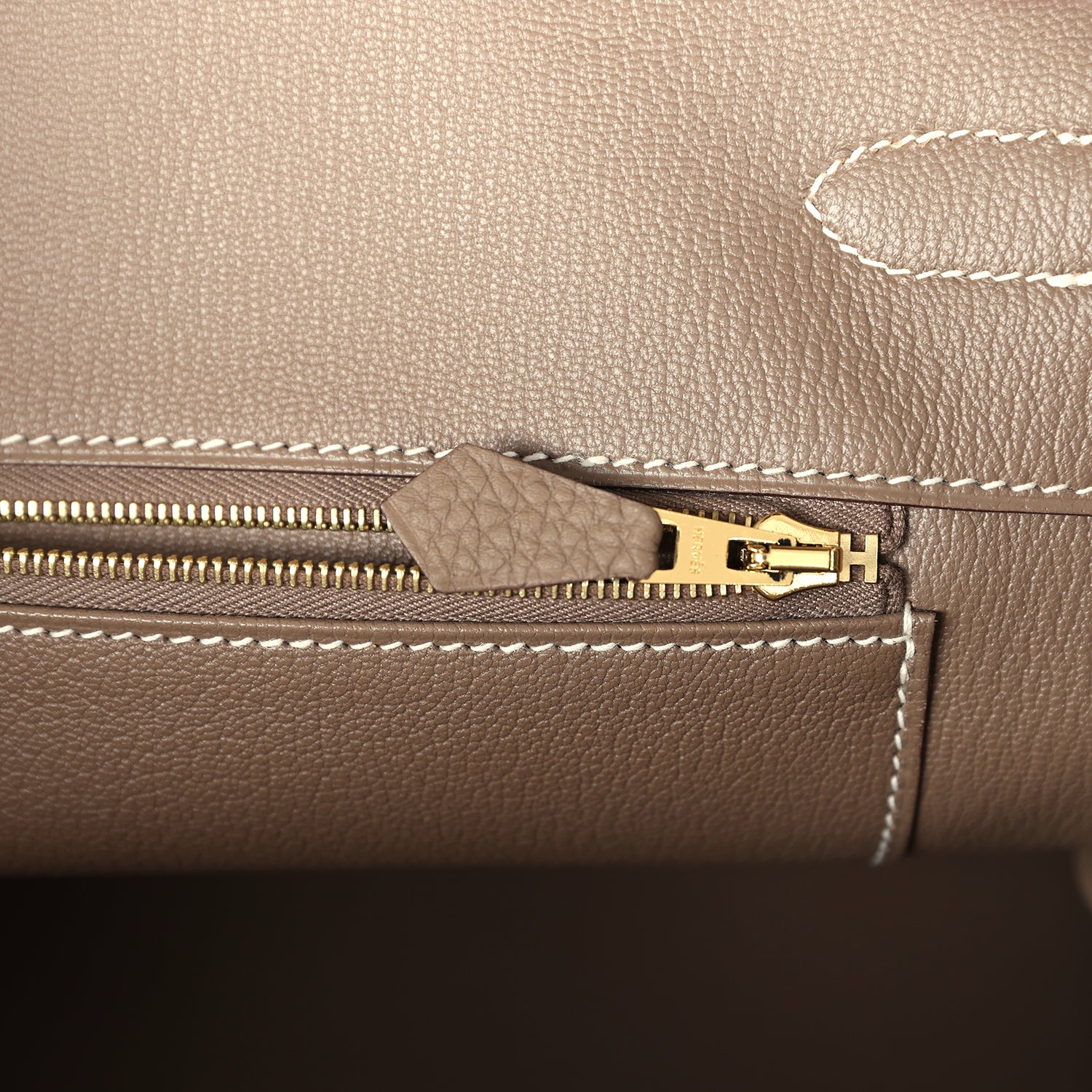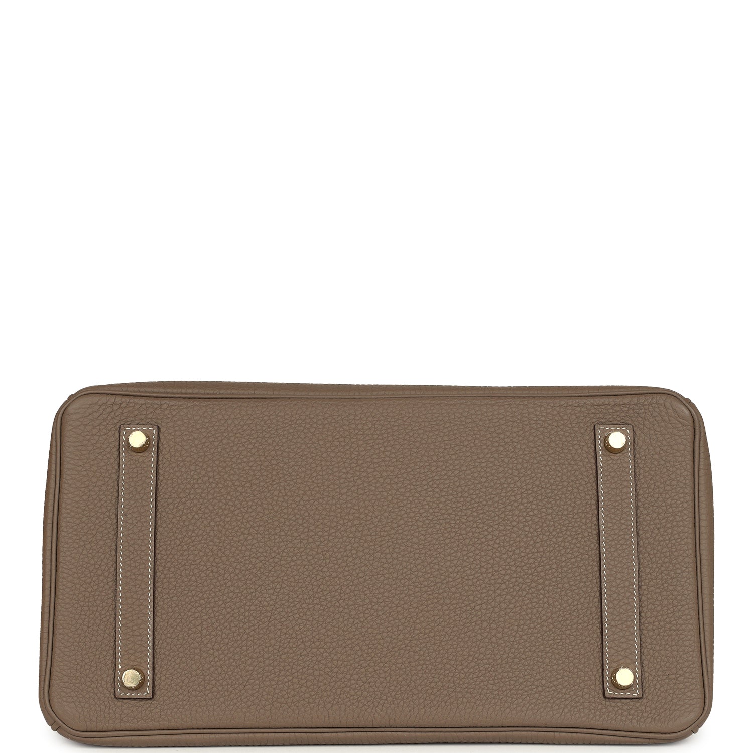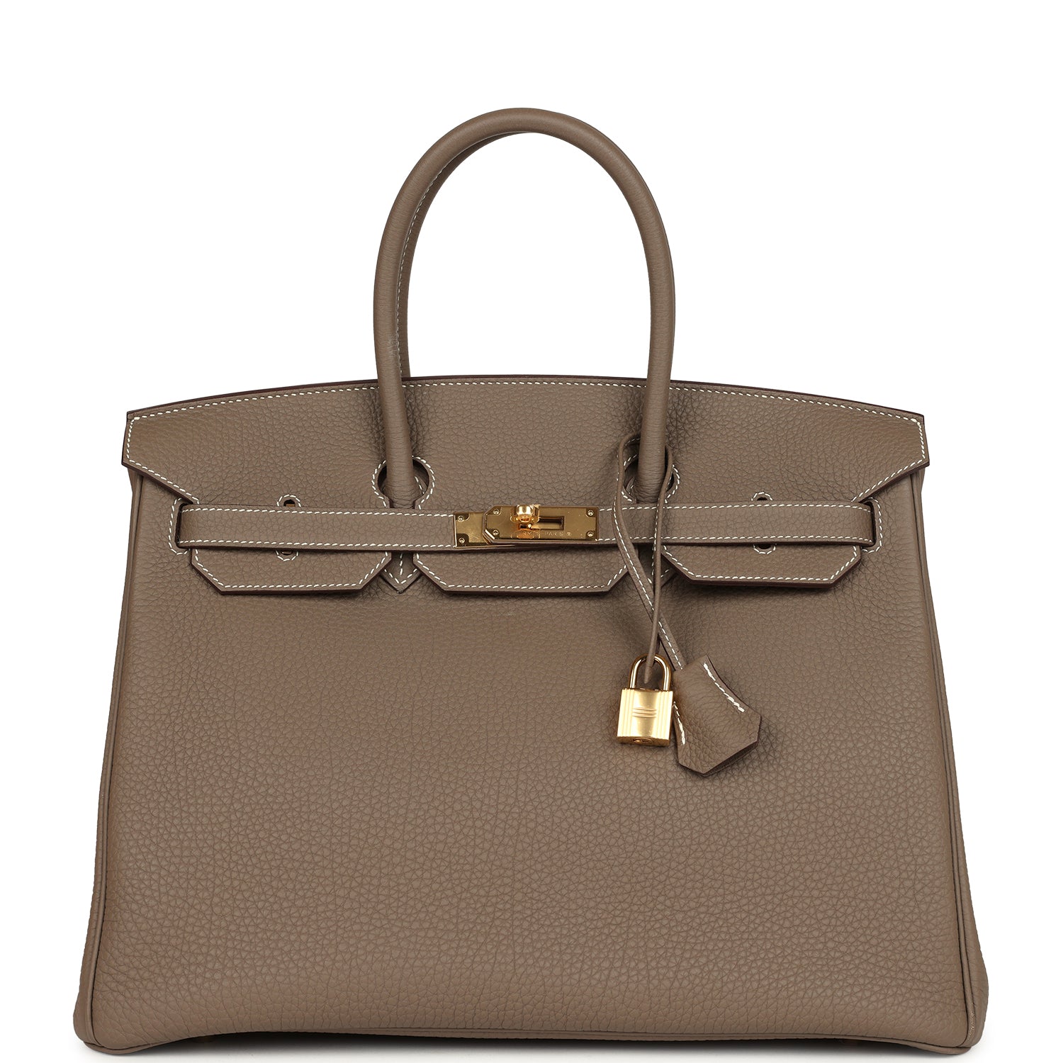 This Birkin is in Etoupe togo leather with gold hardware and has contrast stitching, front flap, two straps with center toggle closure, clochette with lock and two keys, and double rolled handles.