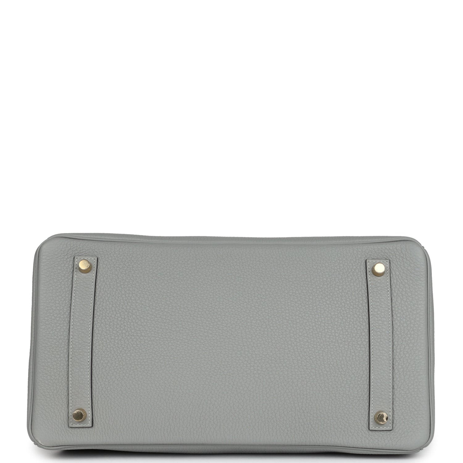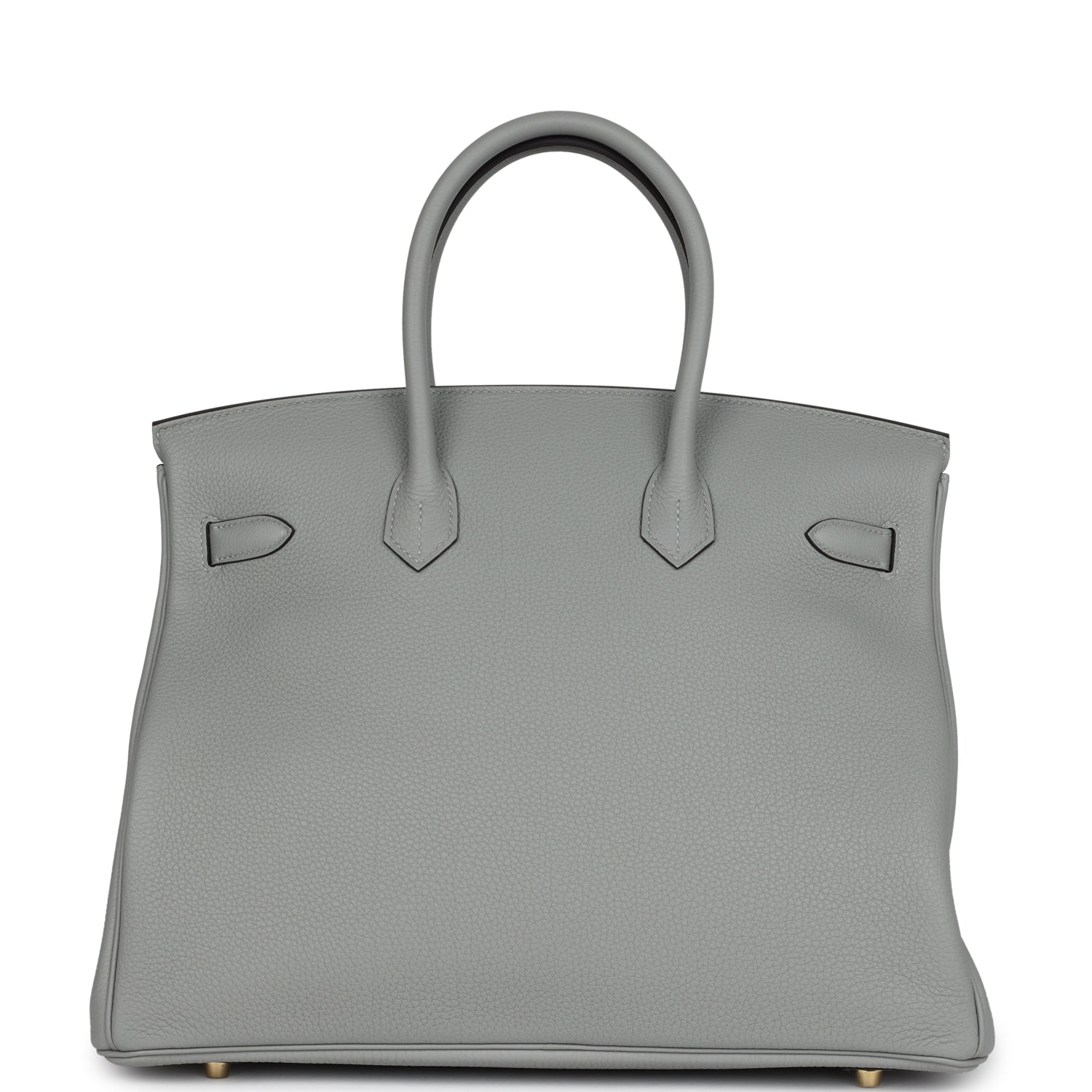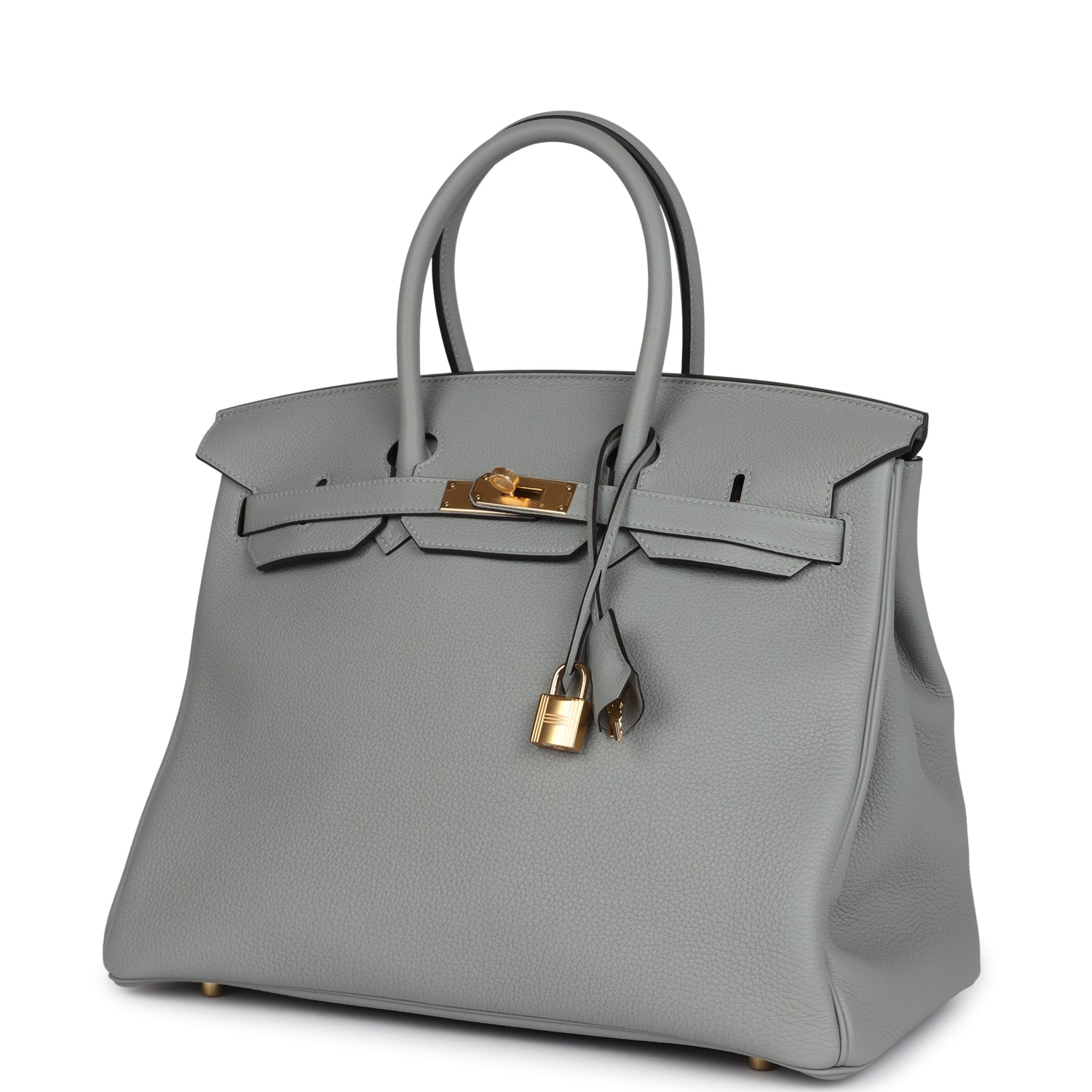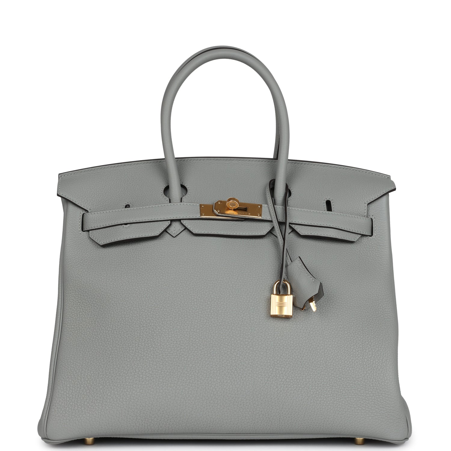 This Birkin is in Gris Mouette togo leather with gold hardware and has tonal stitching, front flap, two straps with center toggle closure, clochette with lock and two keys, and double rolled handles.