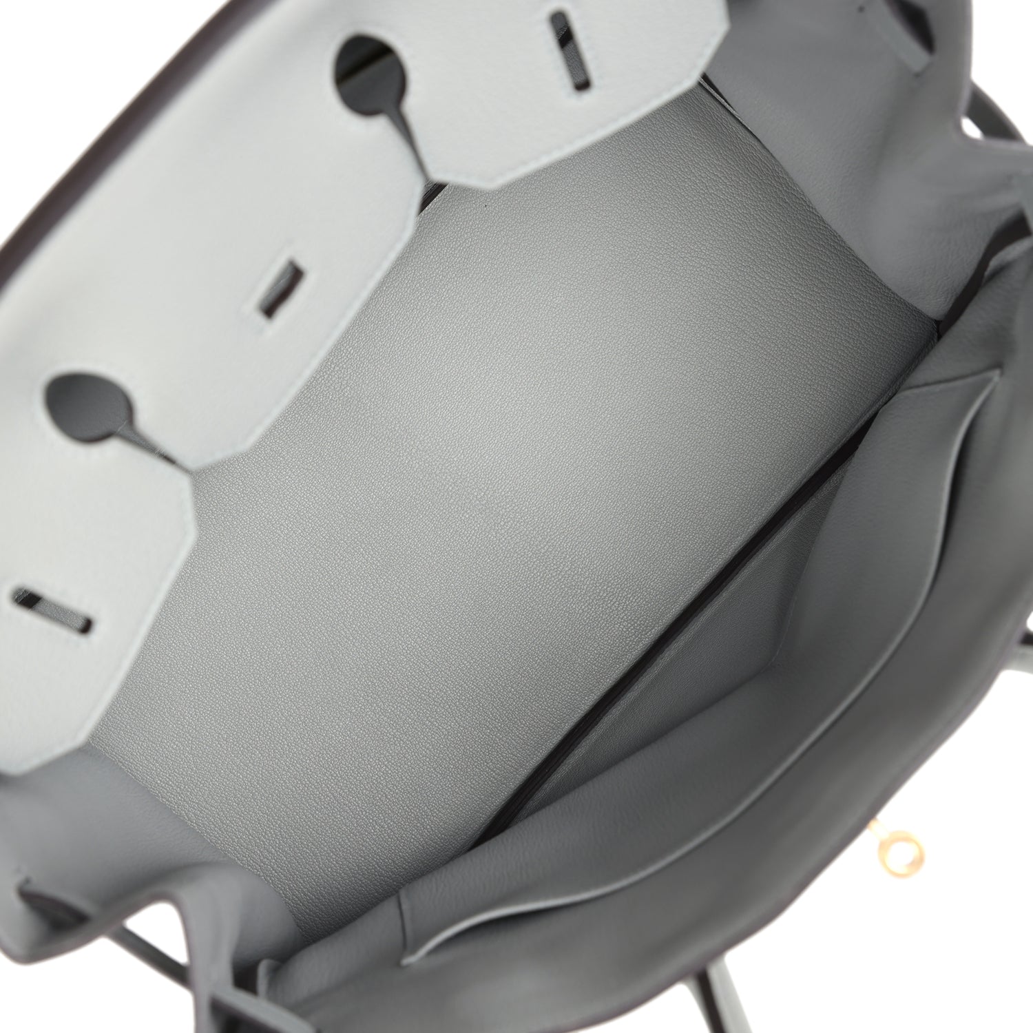 The interior is lined with Gris Mouette chevre and has one zip pocket with an Hermes engraved zipper pull and an open pocket on the opposite side.