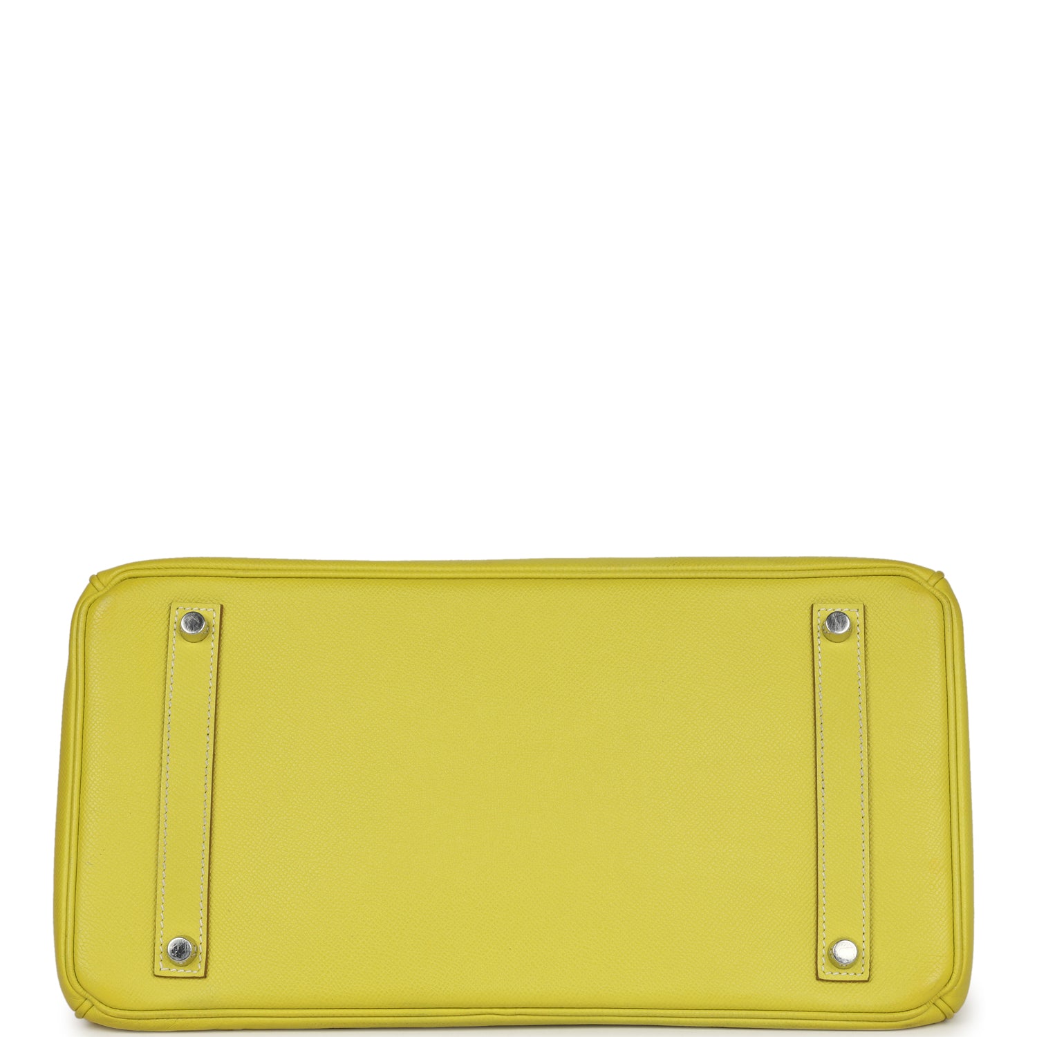 Candy Birkin 35 is in Lime epsom leather with palladium hardware and has contrast stitching, front flap with two straps, front toggle closure, clochette with lock and two keys, double rolled handles.