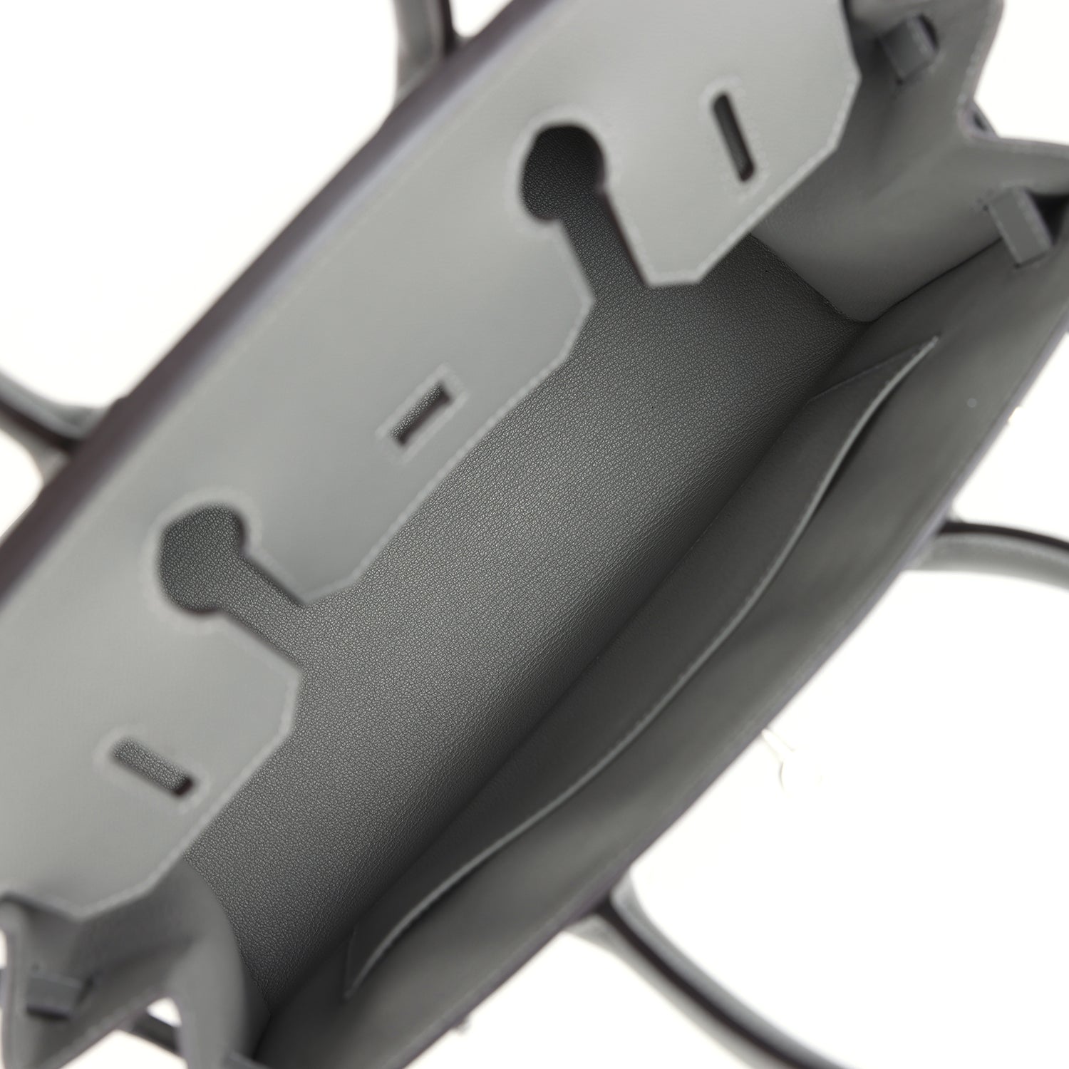 The interior is lined with Gris Meyer chevre and has one zip pocket with an Hermes engraved zipper pull and an open pocket on the opposite side.