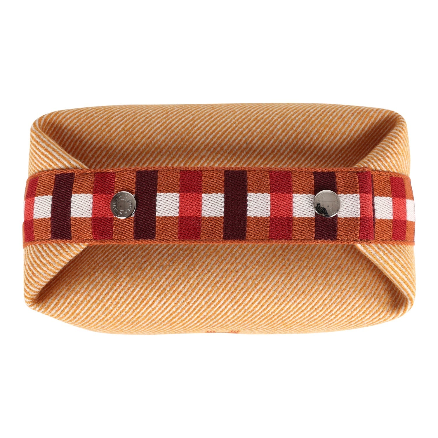 This Bride A Brac Carre Case PM is of Fauve bi-color wool with palladium hardware, features small pouch, anti-stain waterproof lining, embroidered "H" on the front, tonal stitching, zippered closure, snap closure top handle.