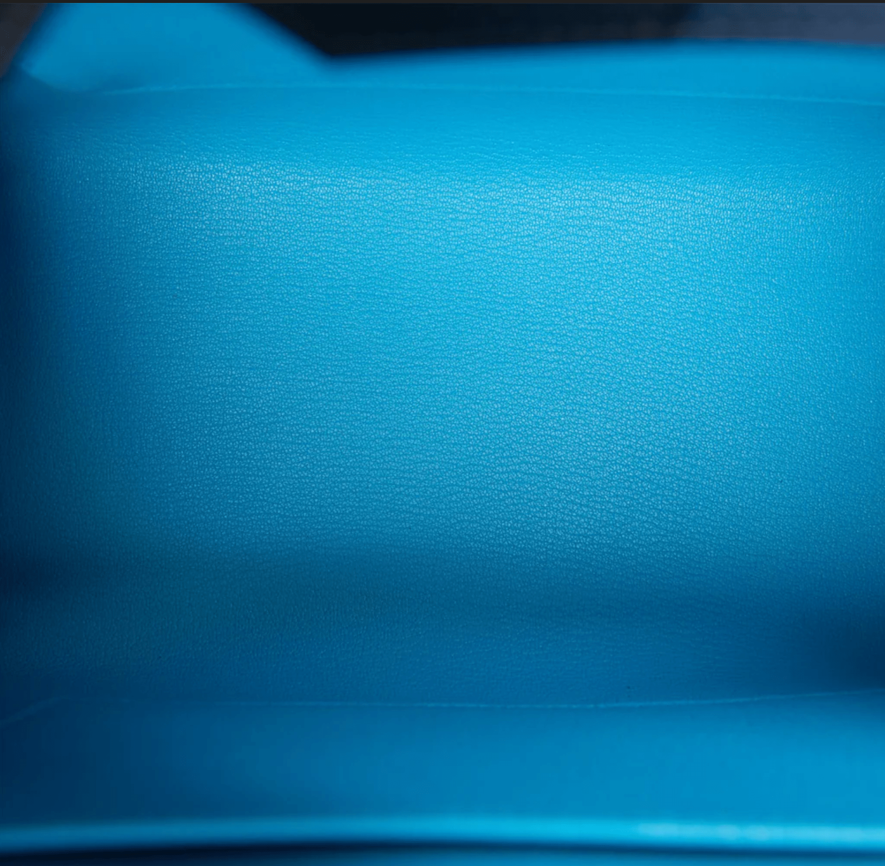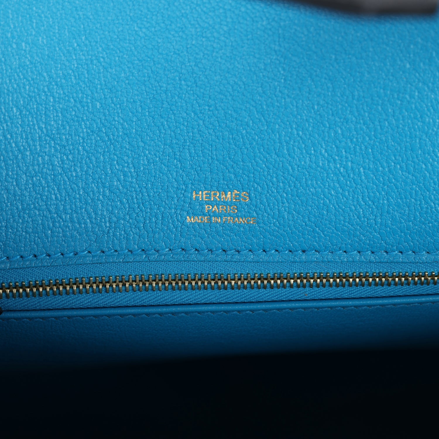 The interior is lined with Bleu Zanzibar chevre and has one zip pocket with an Hermes engraved zipper pull and an open pocket on the opposite side.