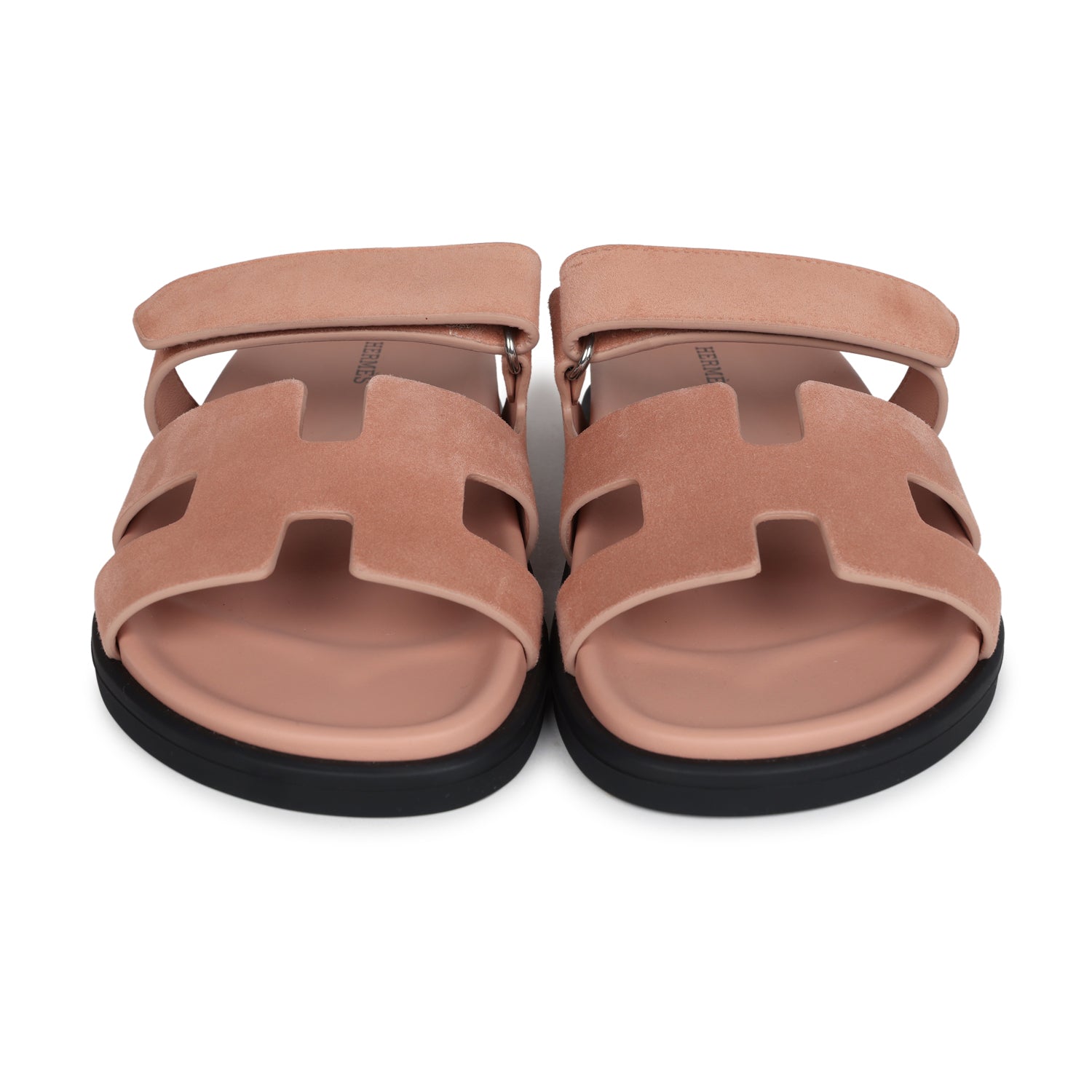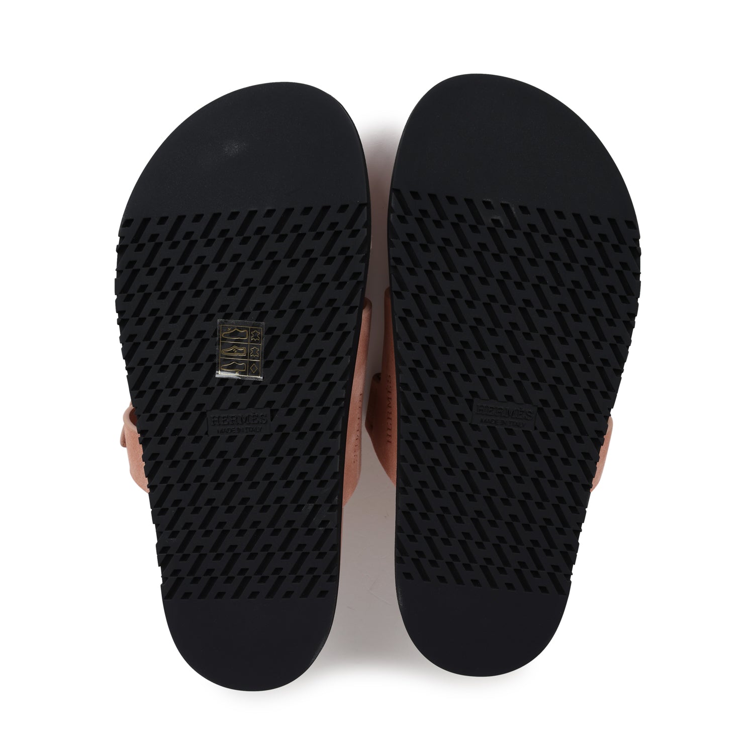 This pair of Hermes Chypre Techno sandals are in Nude sNewe leather with Black rubber soles, adjustable straps and palladium hardware in a size 38 EU.