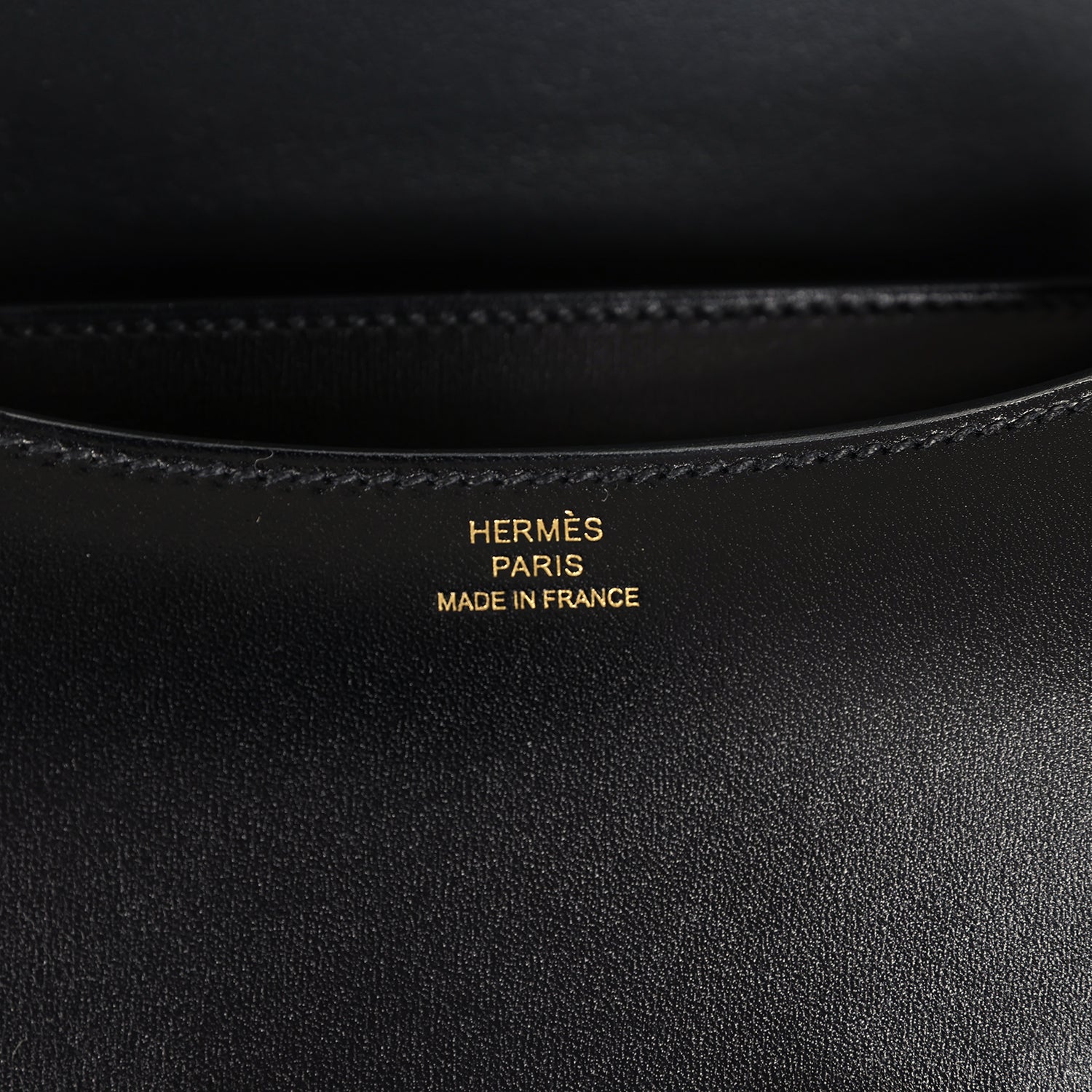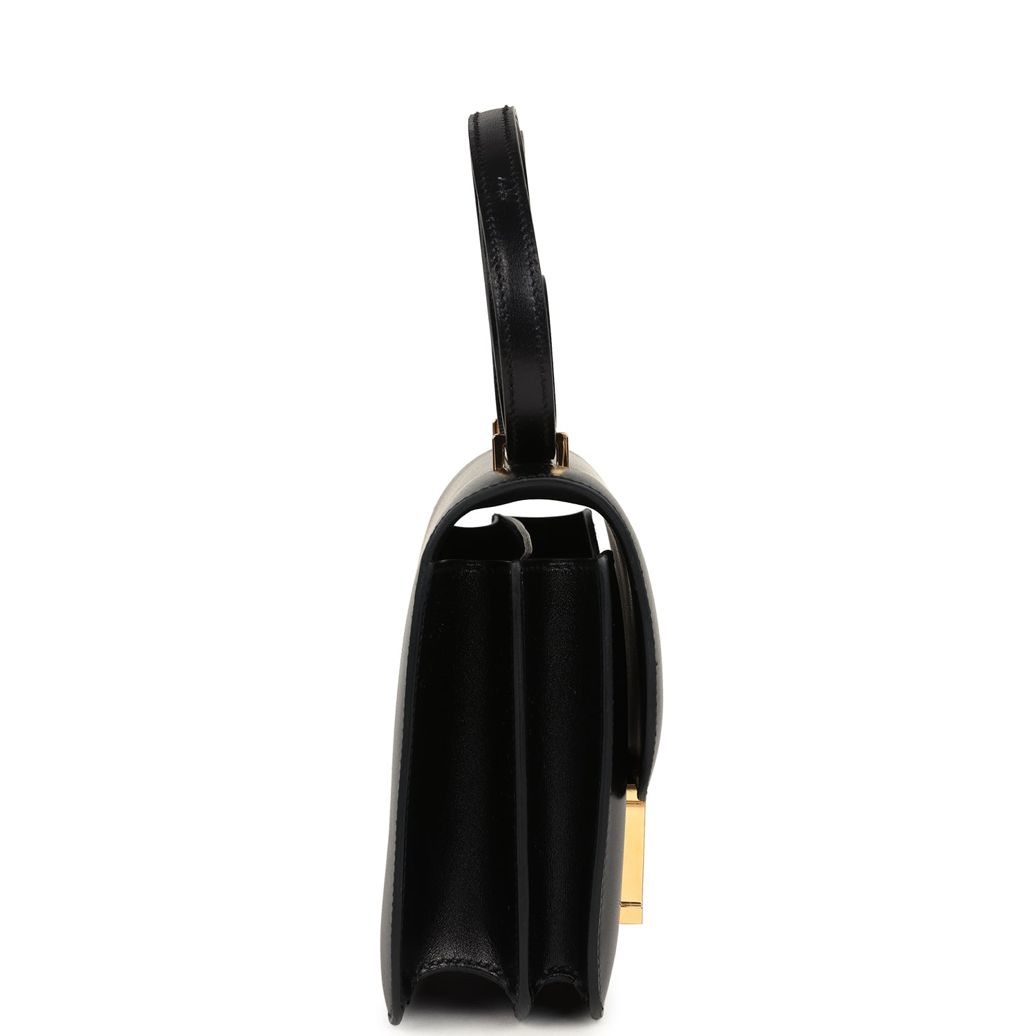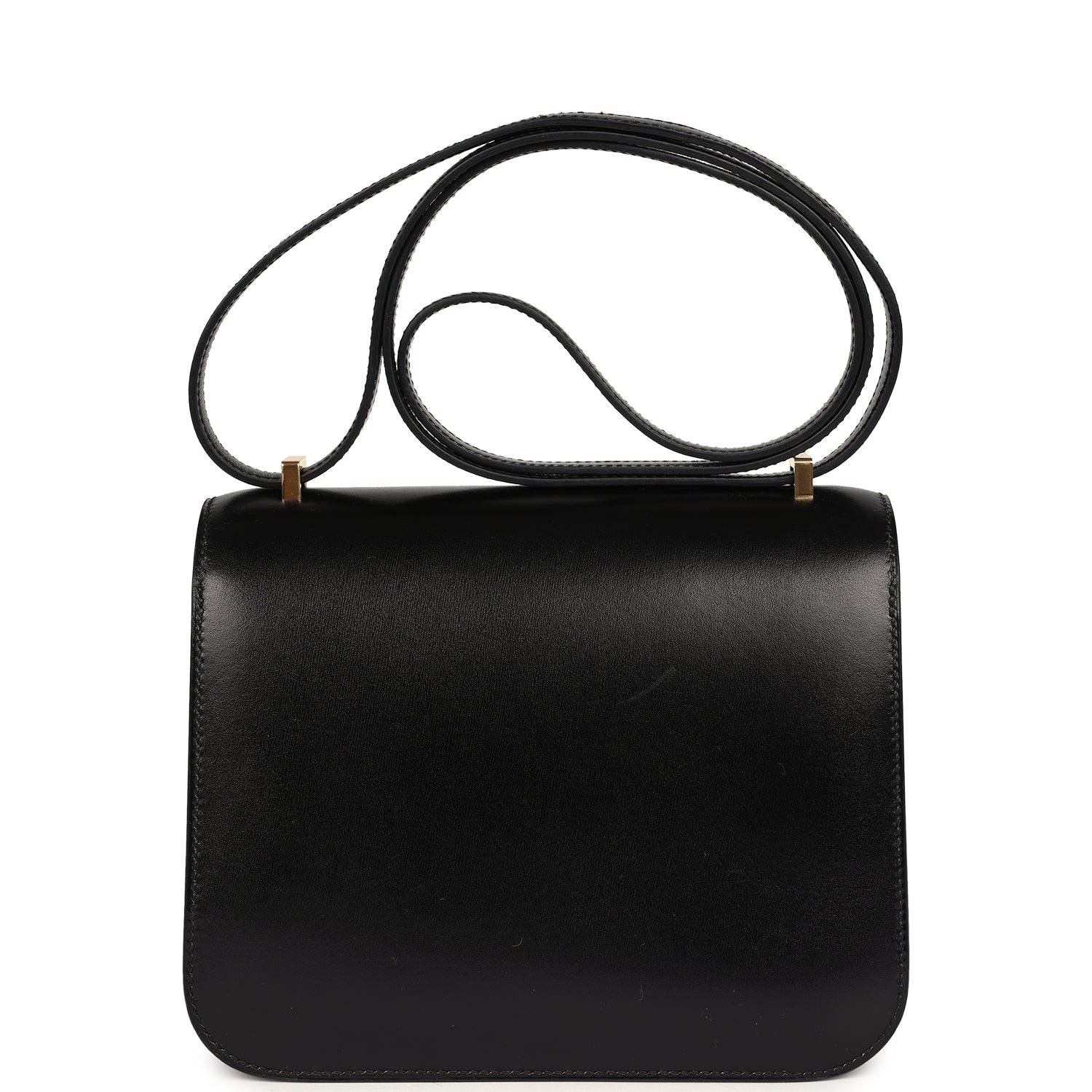 This Constance is in Black box calf leather with gold hardware and has tonal stitching, a metal "H" snap lock closure and adjustable shoulder strap.