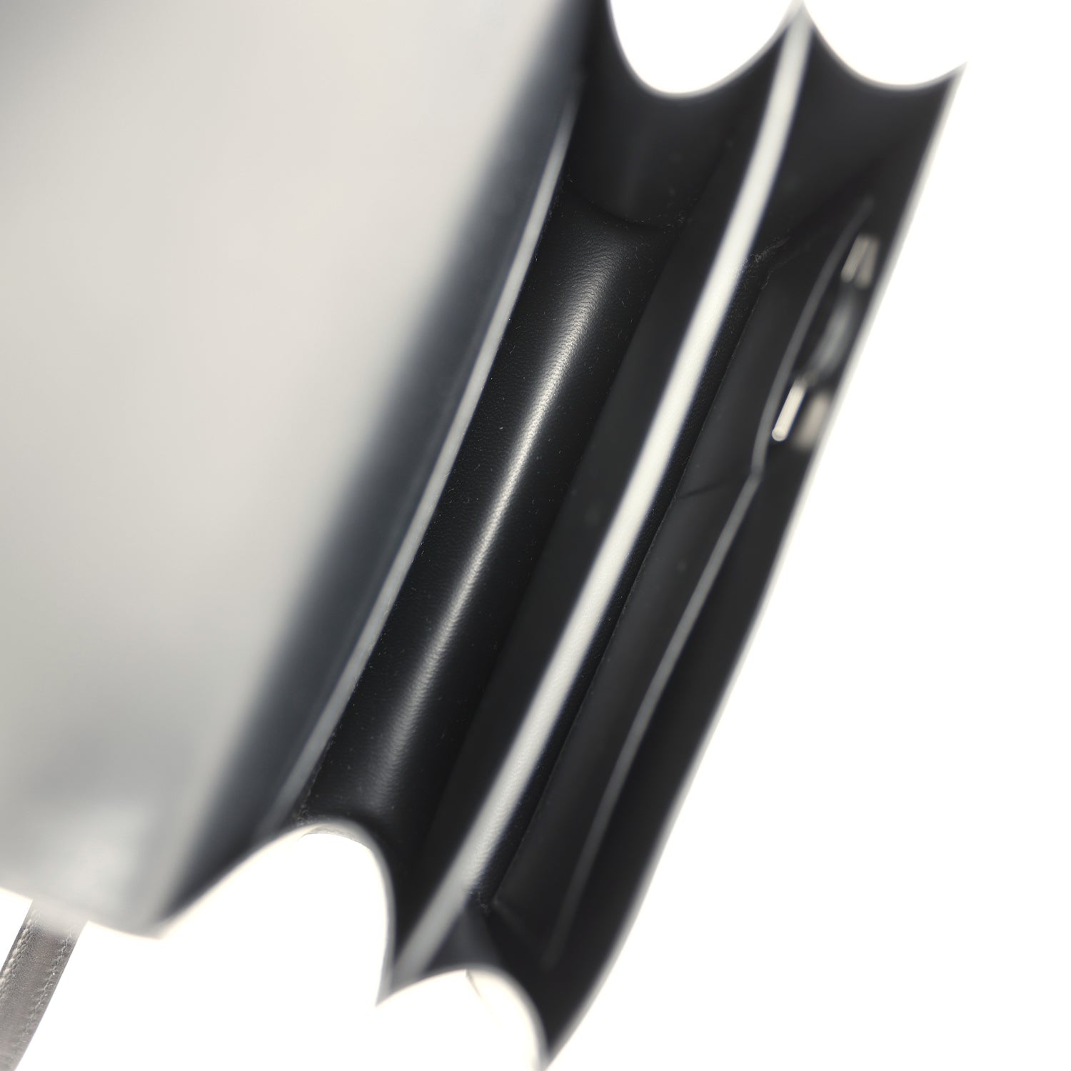 The interior is lined with Black lambskin and has an open pocket on the front wall, a center divide, removable mirror and a slit pocket on the back wall.
