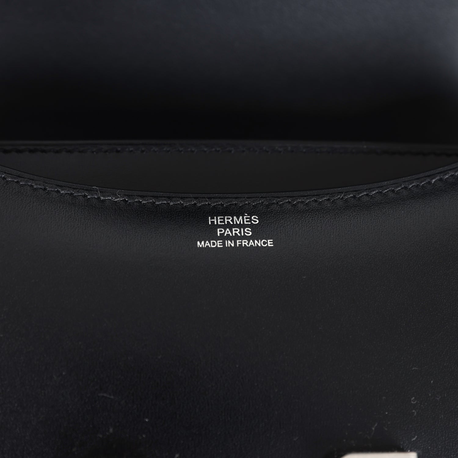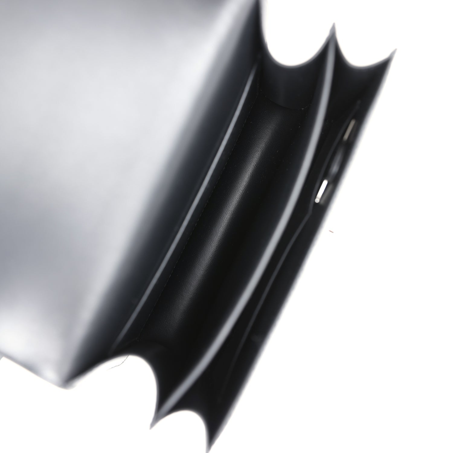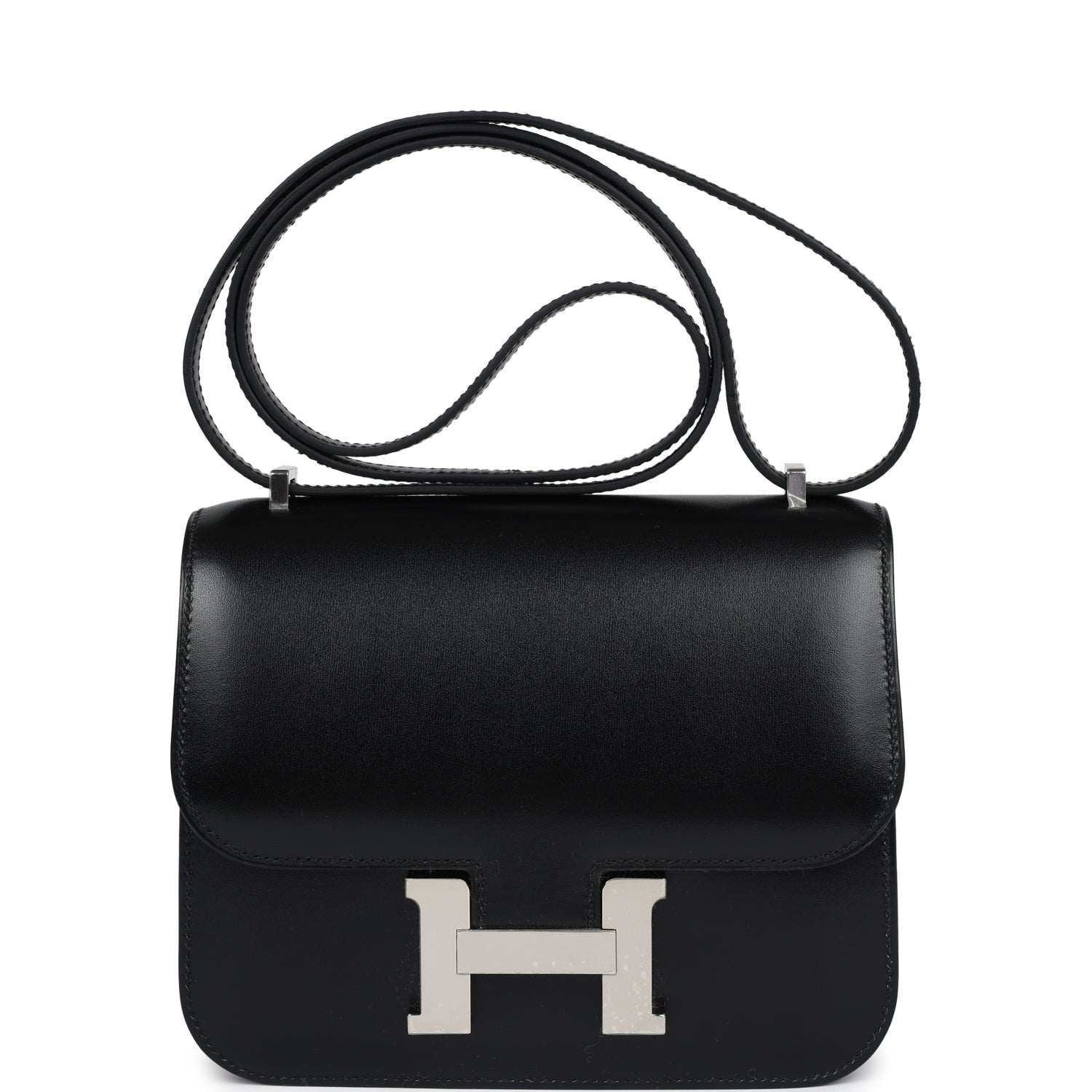 This Constance is in Black box calf leather with palladium hardware and has tonal stitching, a metal "H" snap lock closure and adjustable shoulder strap.