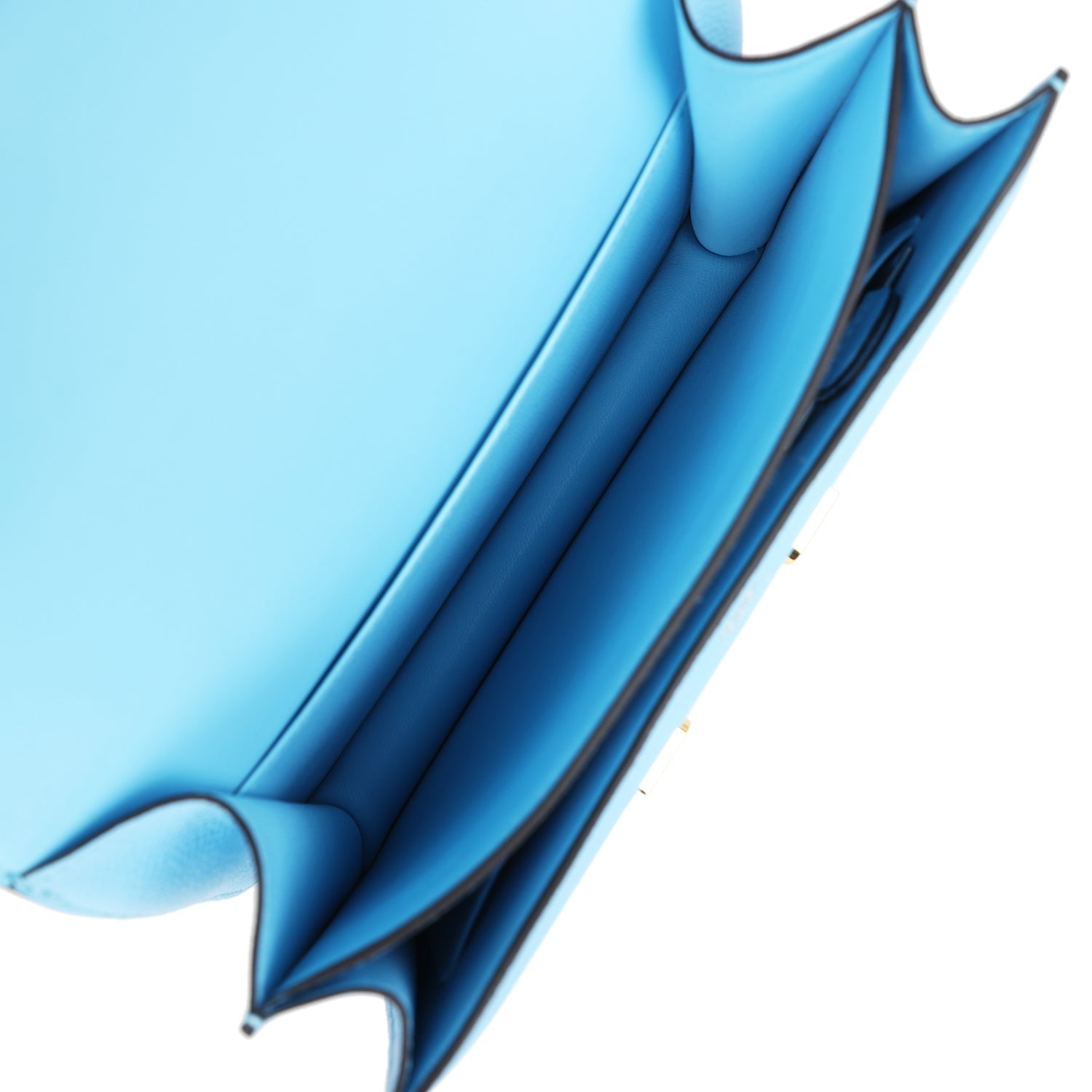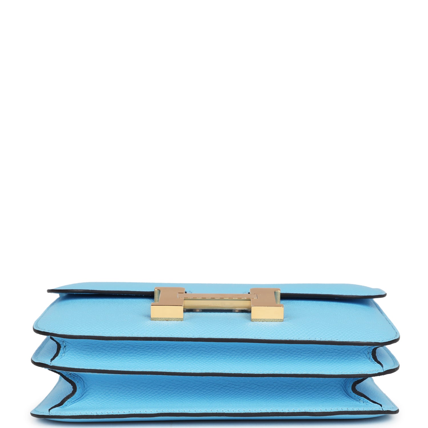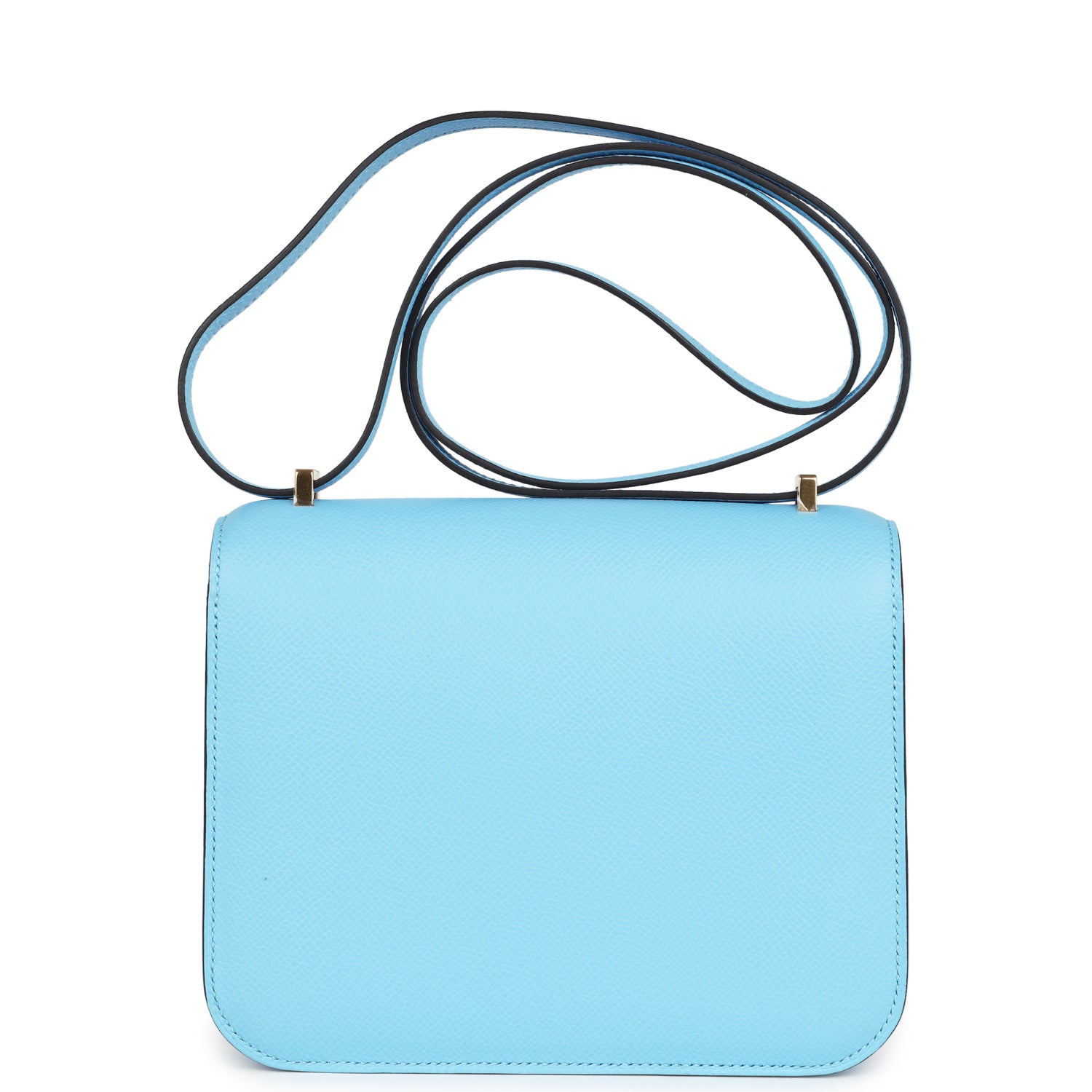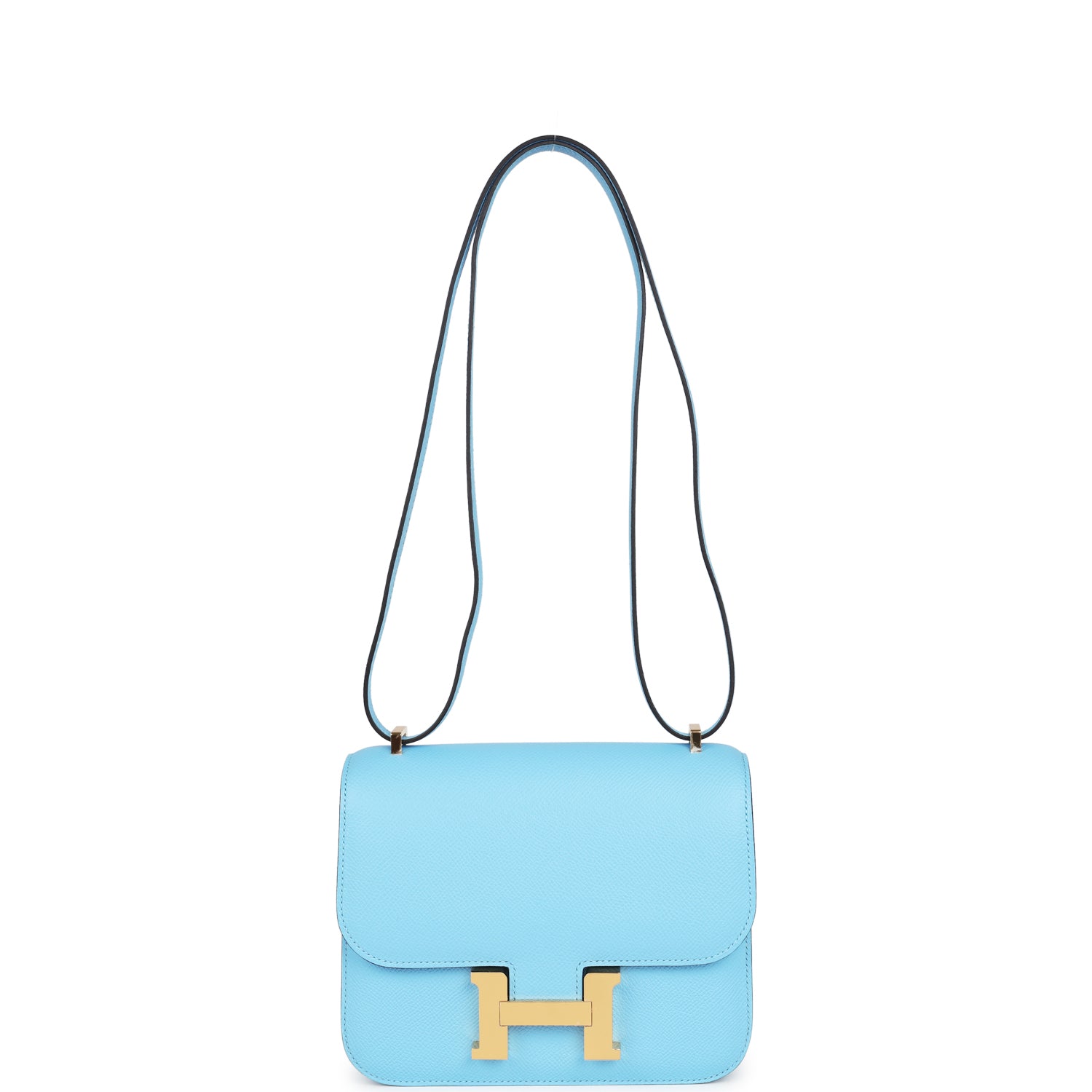 This Constance is in Celeste epsom leather with gold hardware and has tonal stitching, a metal "H" snap lock closure and adjustable shoulder strap.