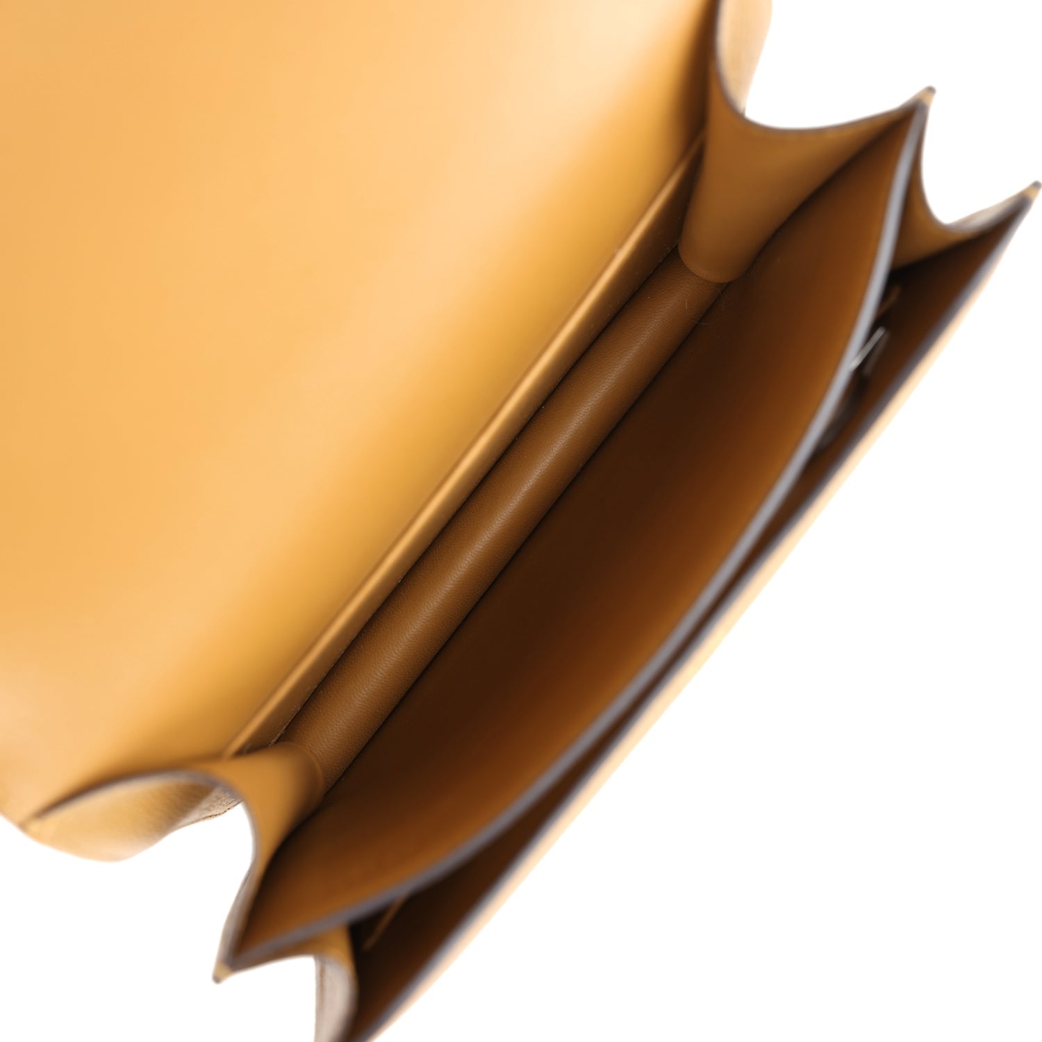This Constance 1-18 is in Kraft chevre mysore leather with gold hardware, tonal stitching, a metal "H" snap lock closure and adjustable shoulder strap.