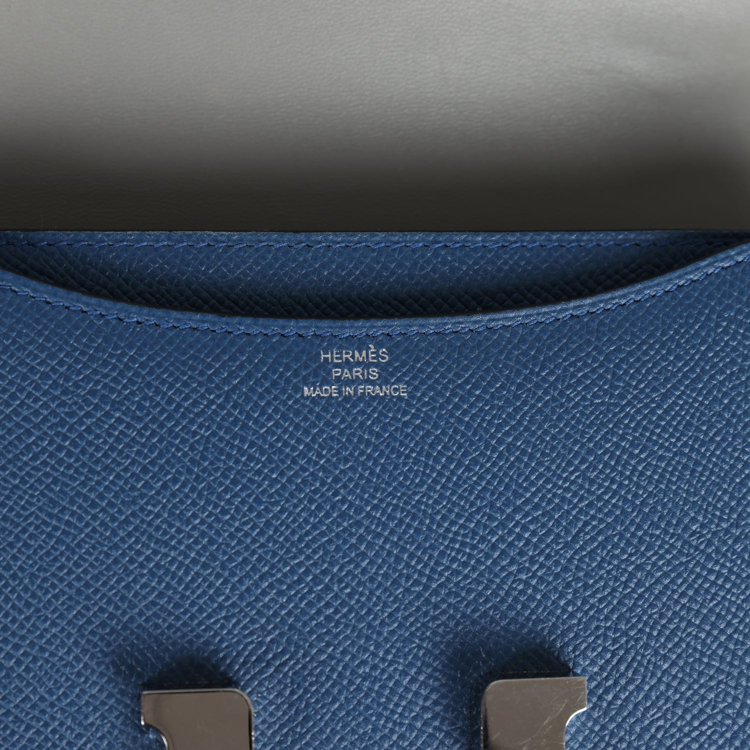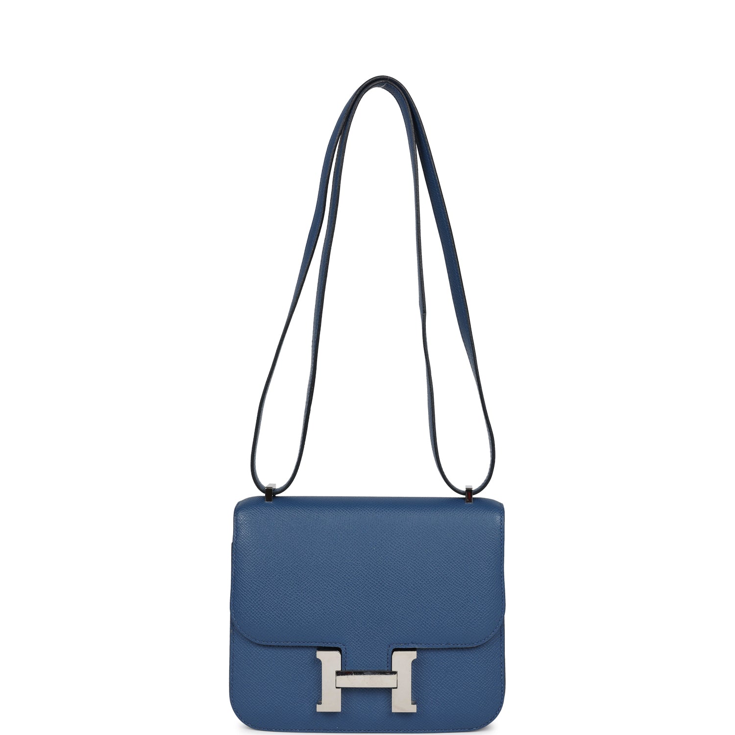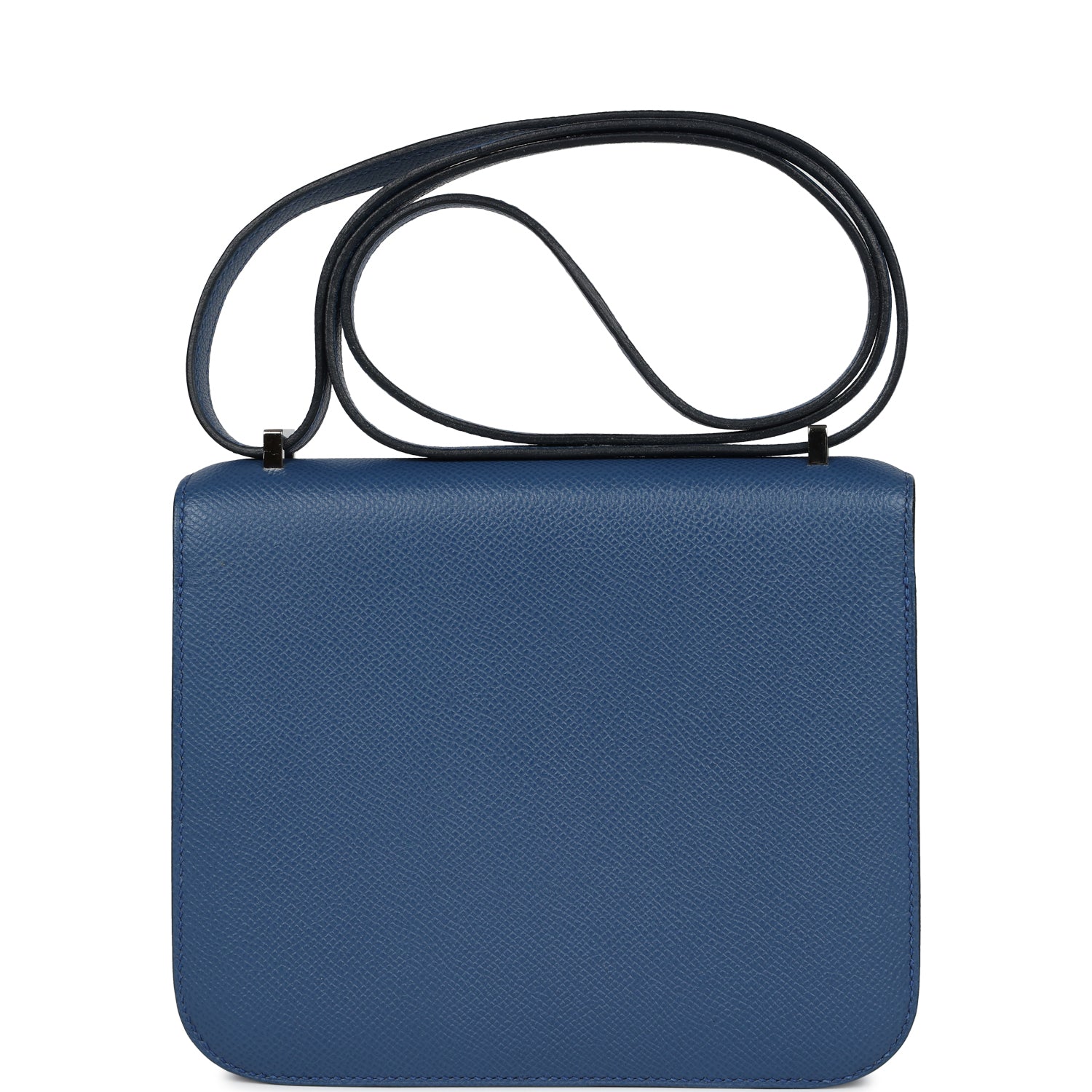 This Constance 18 Verso is in Bleu Agate epsom leather with palladium hardware, tonal stitching, a metal "H" snap lock closure and adjustable shoulder strap.