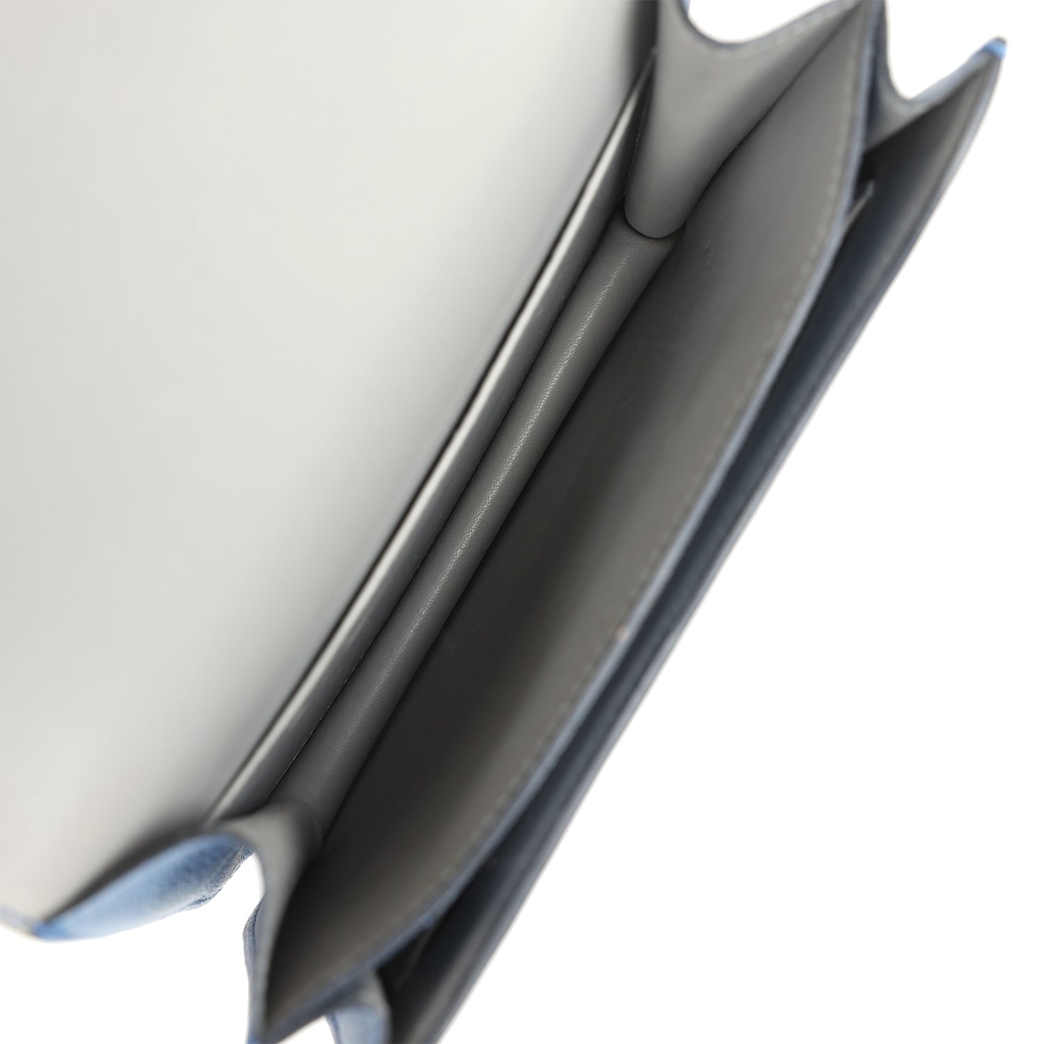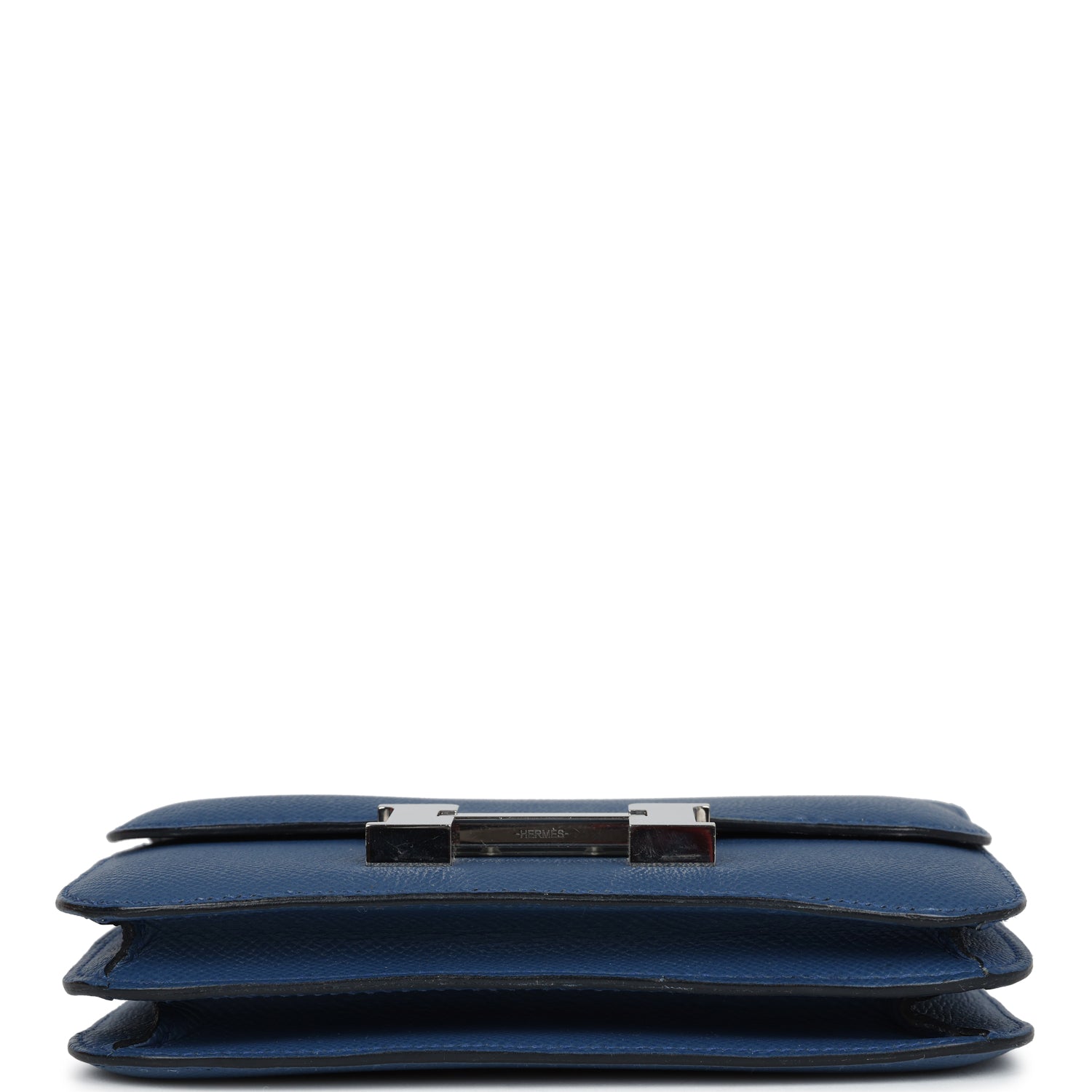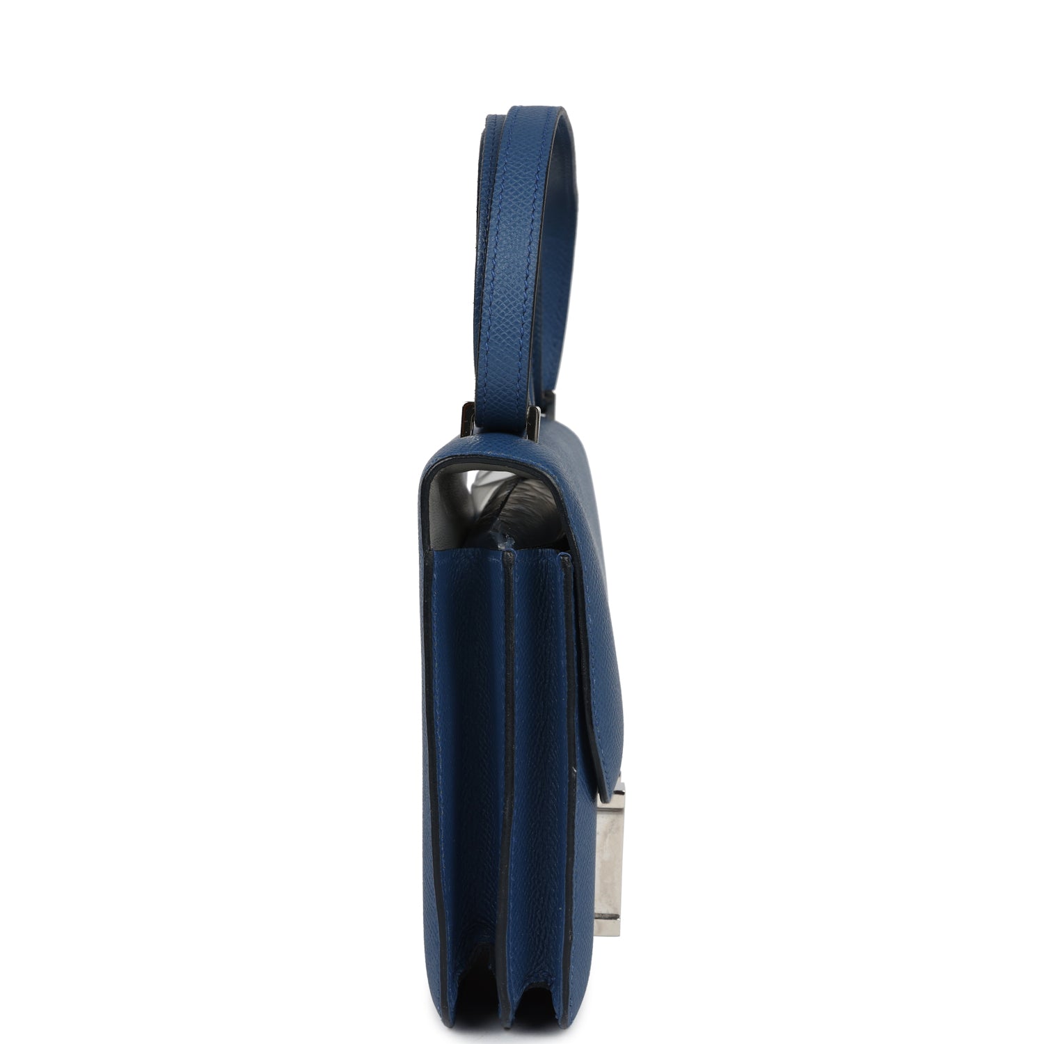 This Constance 18 Verso is in Bleu Agate epsom leather with palladium hardware, tonal stitching, a metal "H" snap lock closure and adjustable shoulder strap.