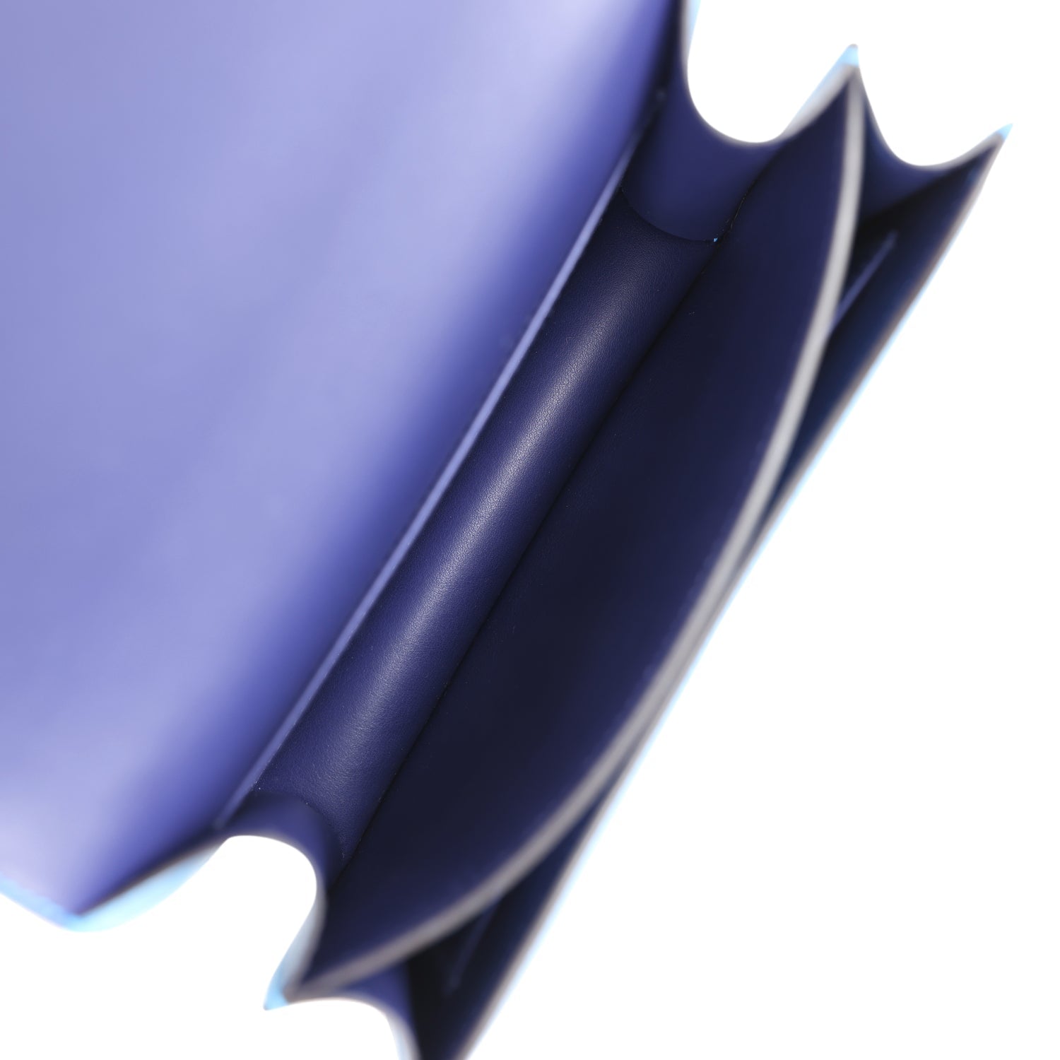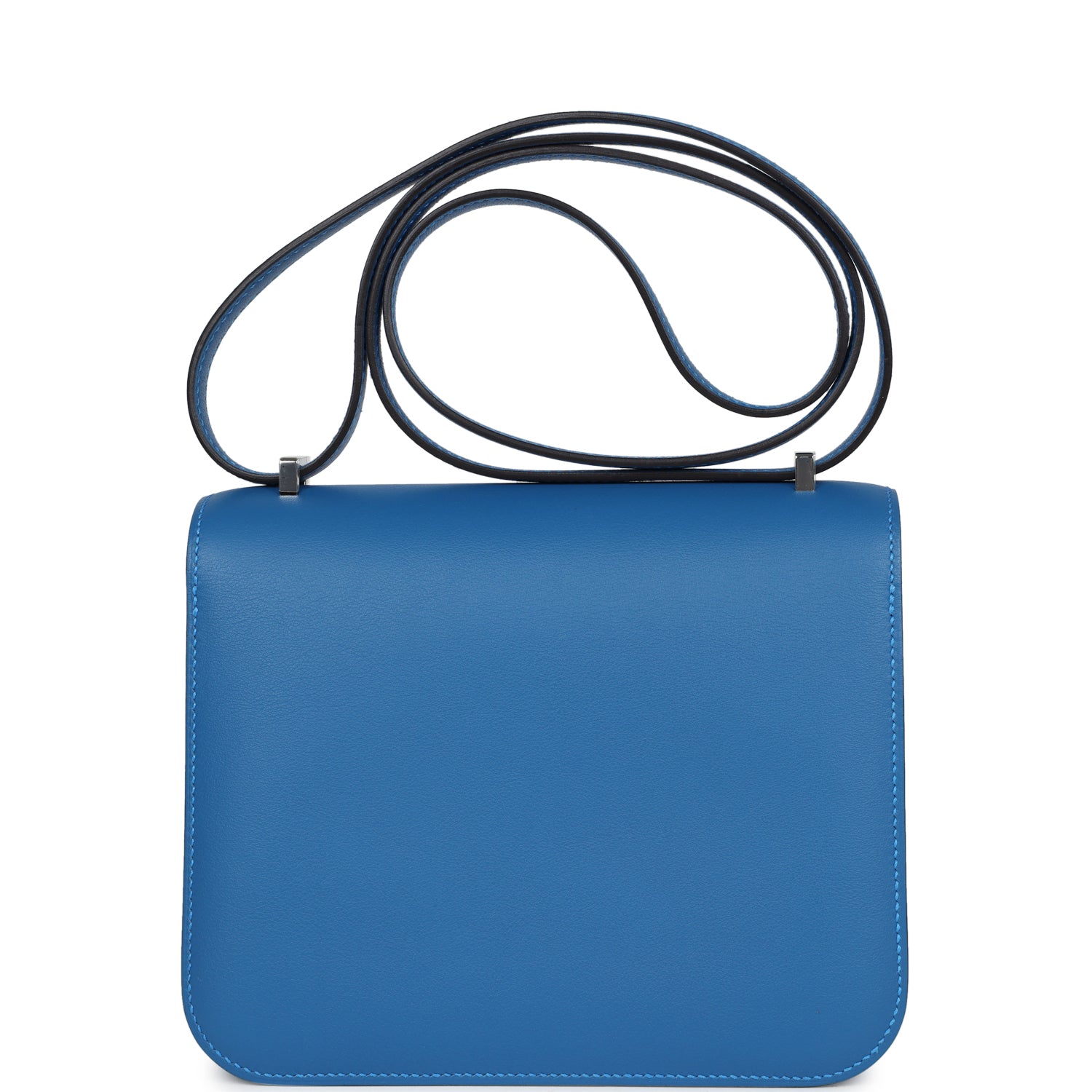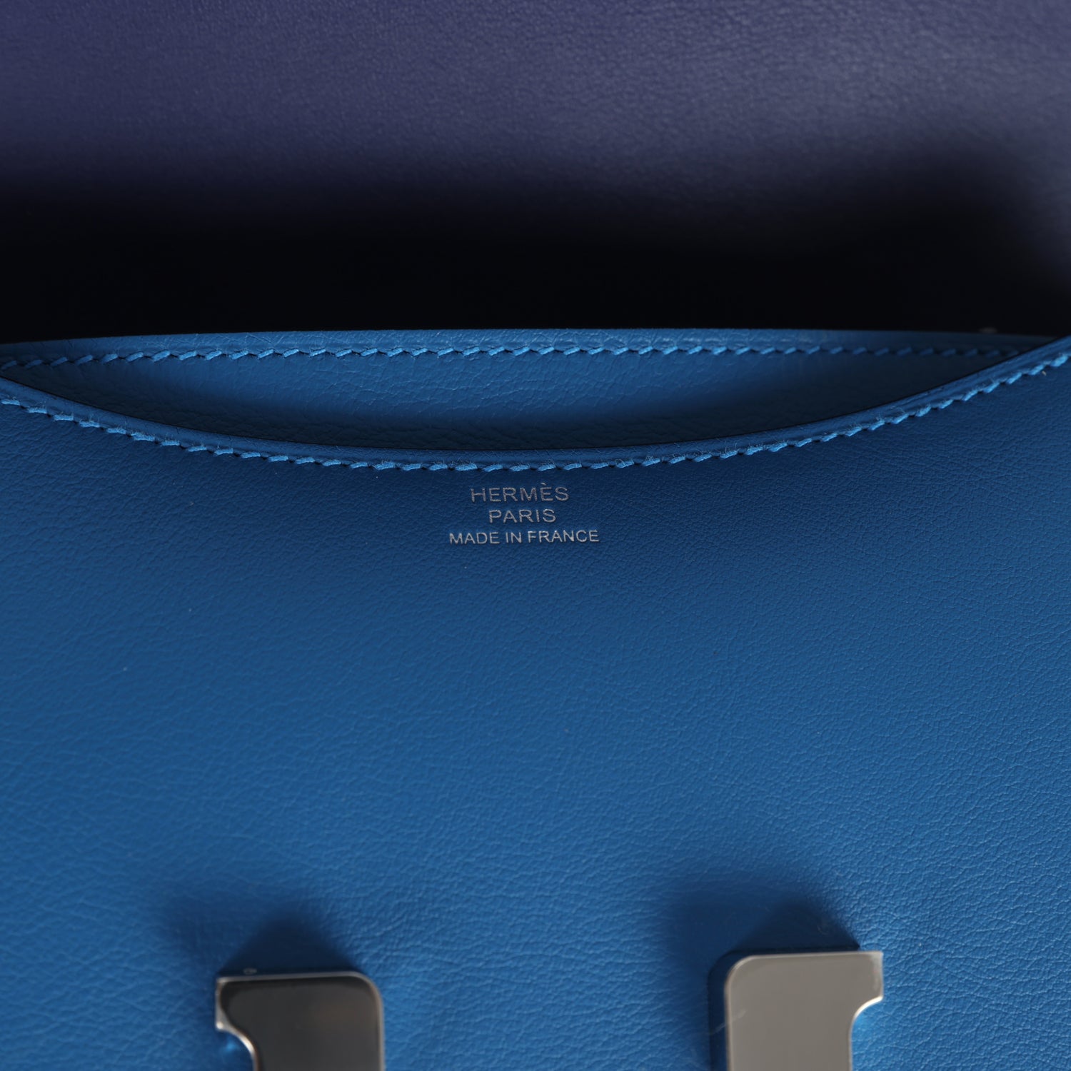This Hermes Constance verso is in Bleu Encre and Bleu Mykonos evercolor leather with palladium hardware, has tonal stitching, a metal "H" snap lock closure and adjustable shoulder strap.