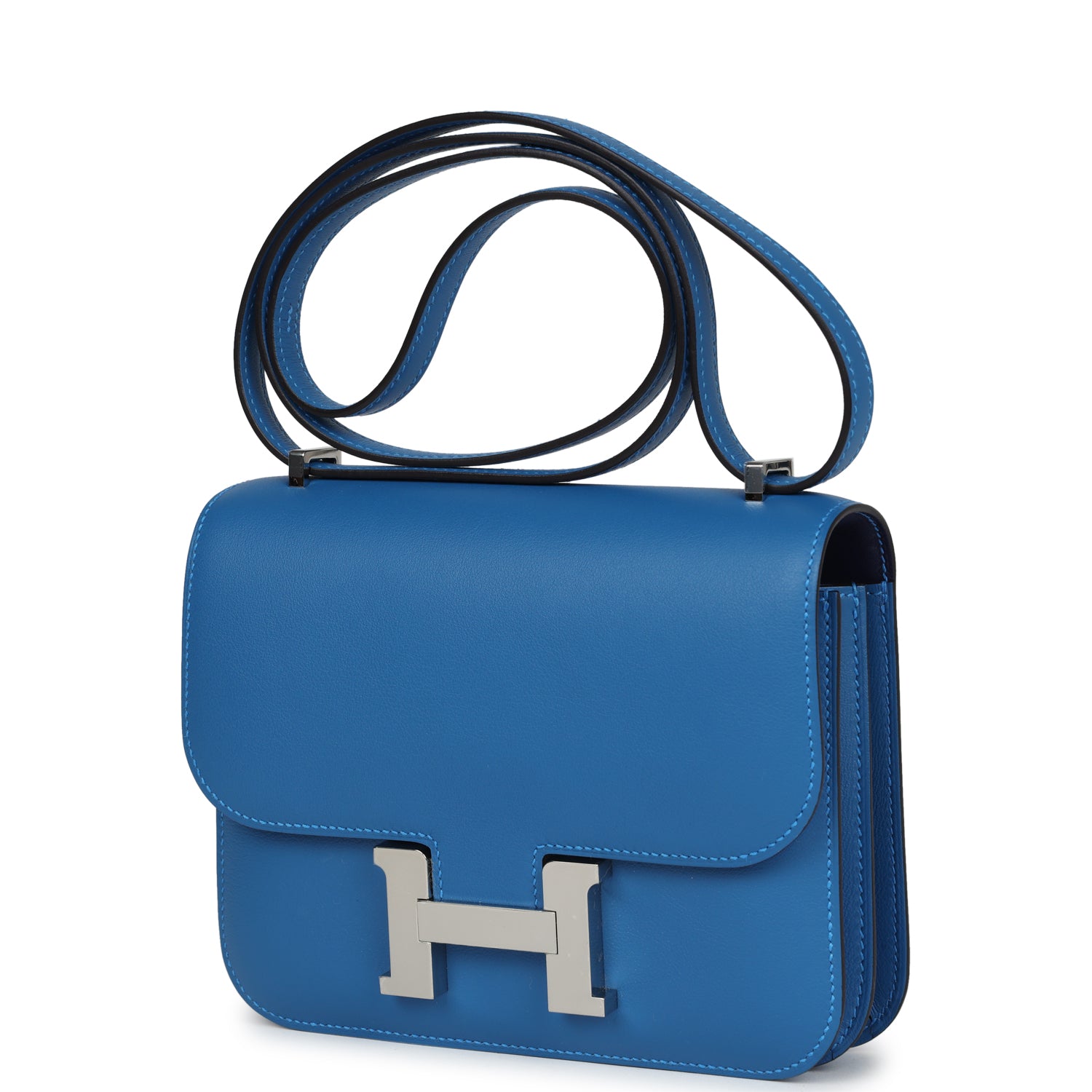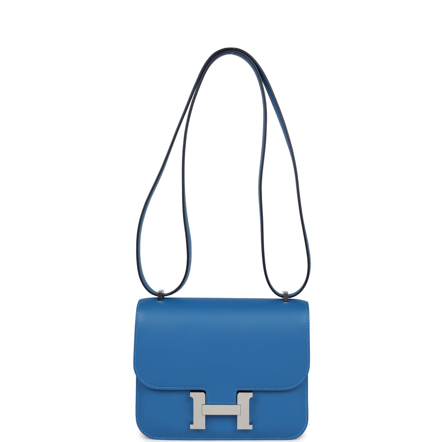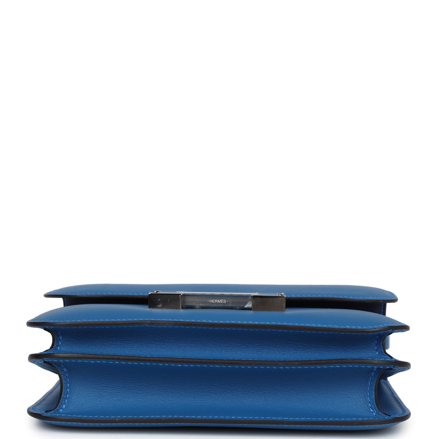 This Hermes Constance verso is in Bleu Encre and Bleu Mykonos evercolor leather with palladium hardware, has tonal stitching, a metal "H" snap lock closure and adjustable shoulder strap.