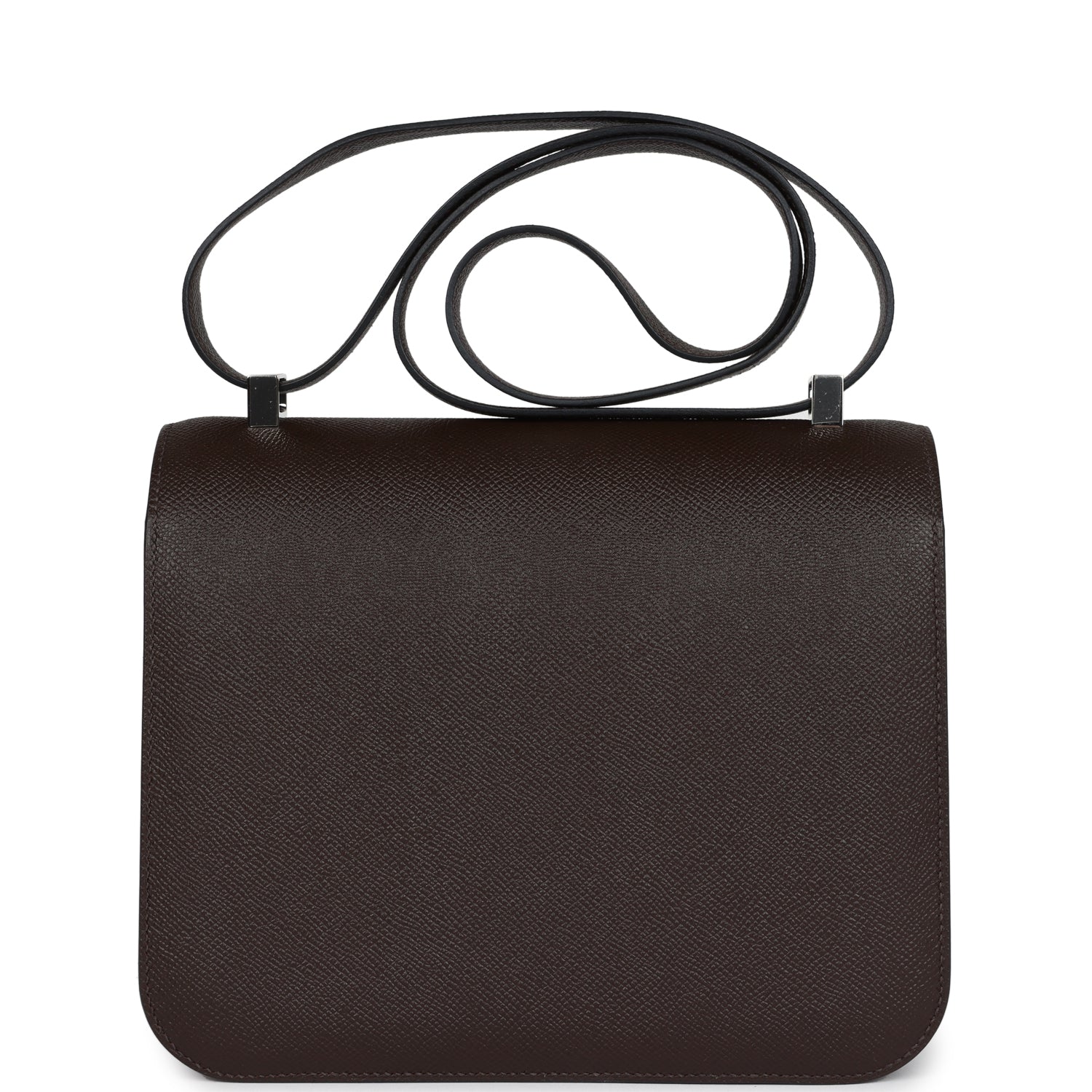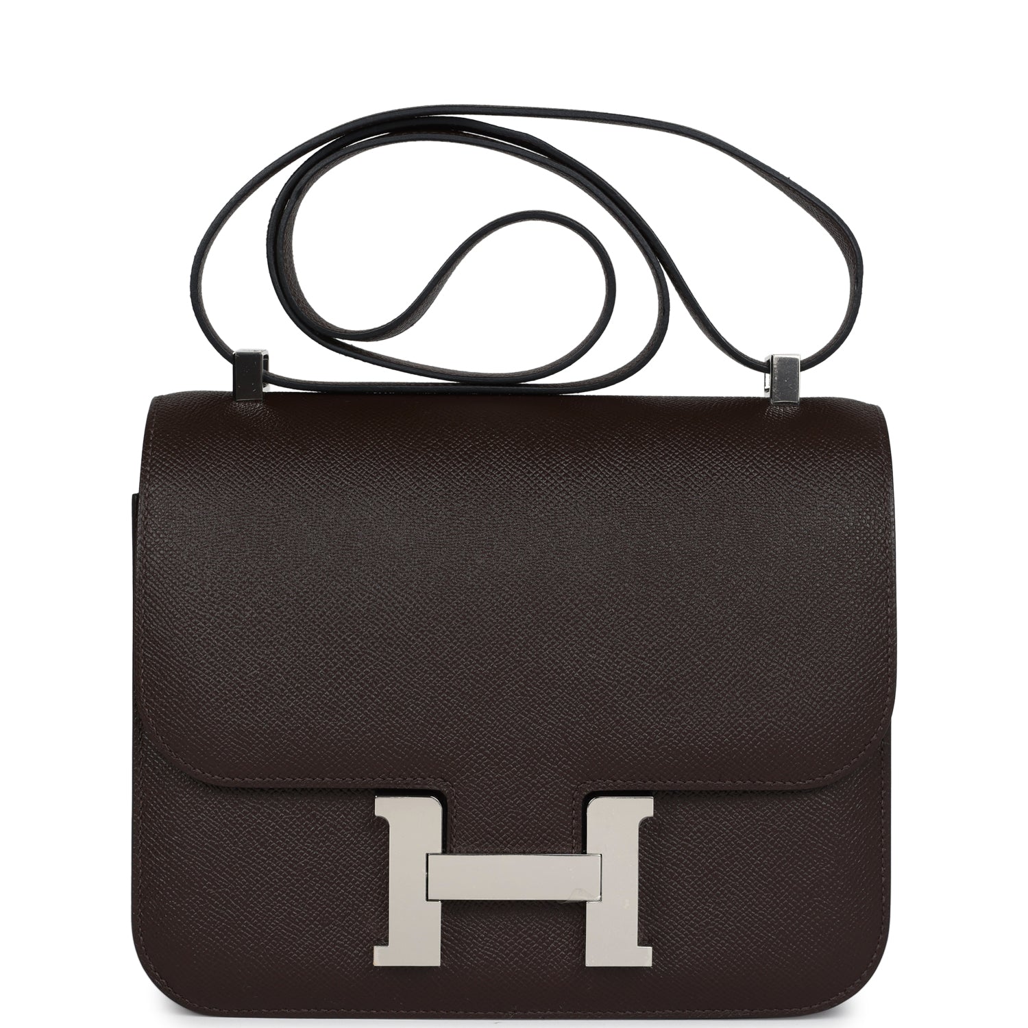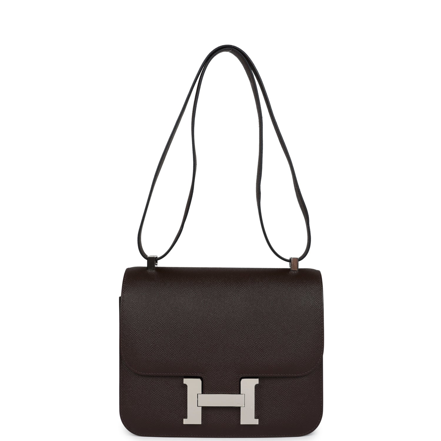 This Constance is in Chocolate epsom leather with palladium hardware and has tonal stitching, a metal "H" snap lock closure, and adjustable shoulder strap.