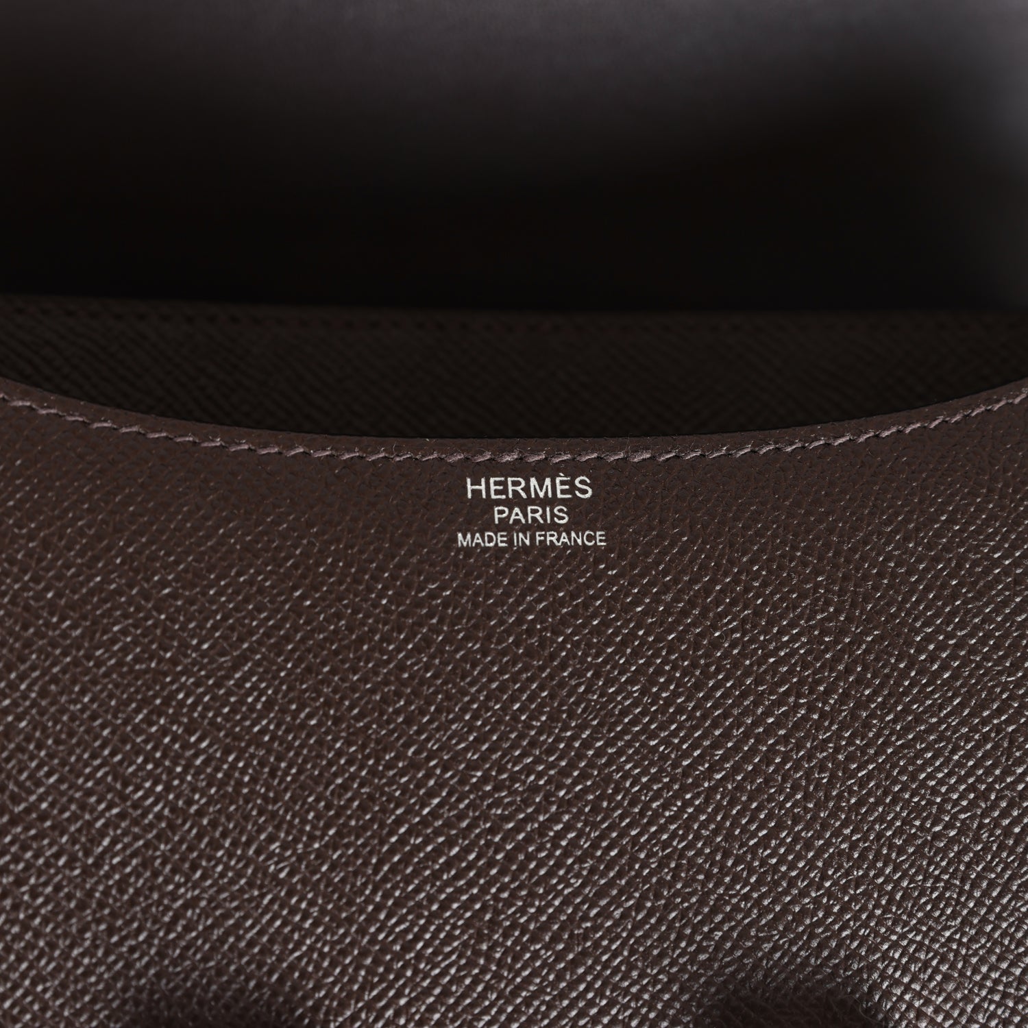 The interior is lined with Chocolate lambskin leather and has a zip pocket with an Hermes engraved pull, and one slip pocket on front wall.