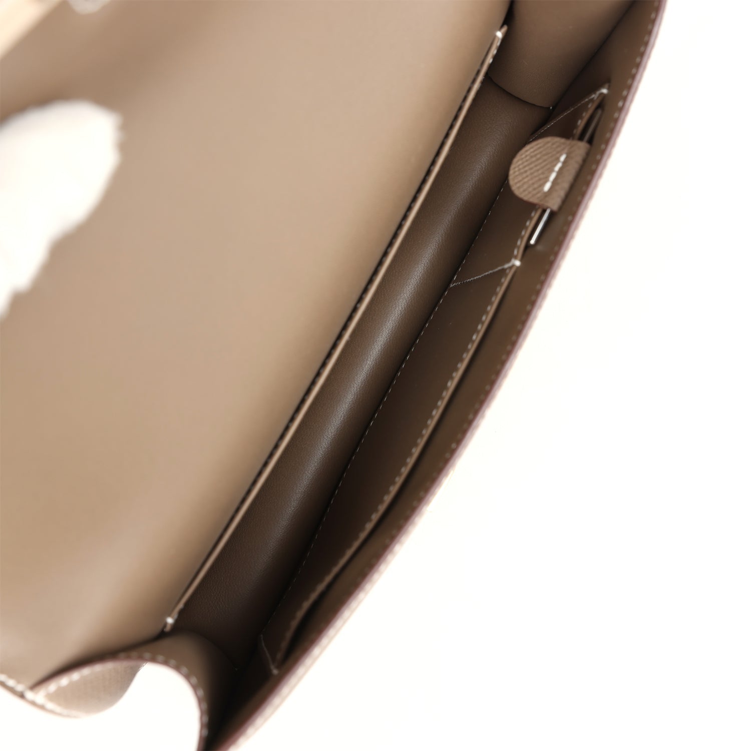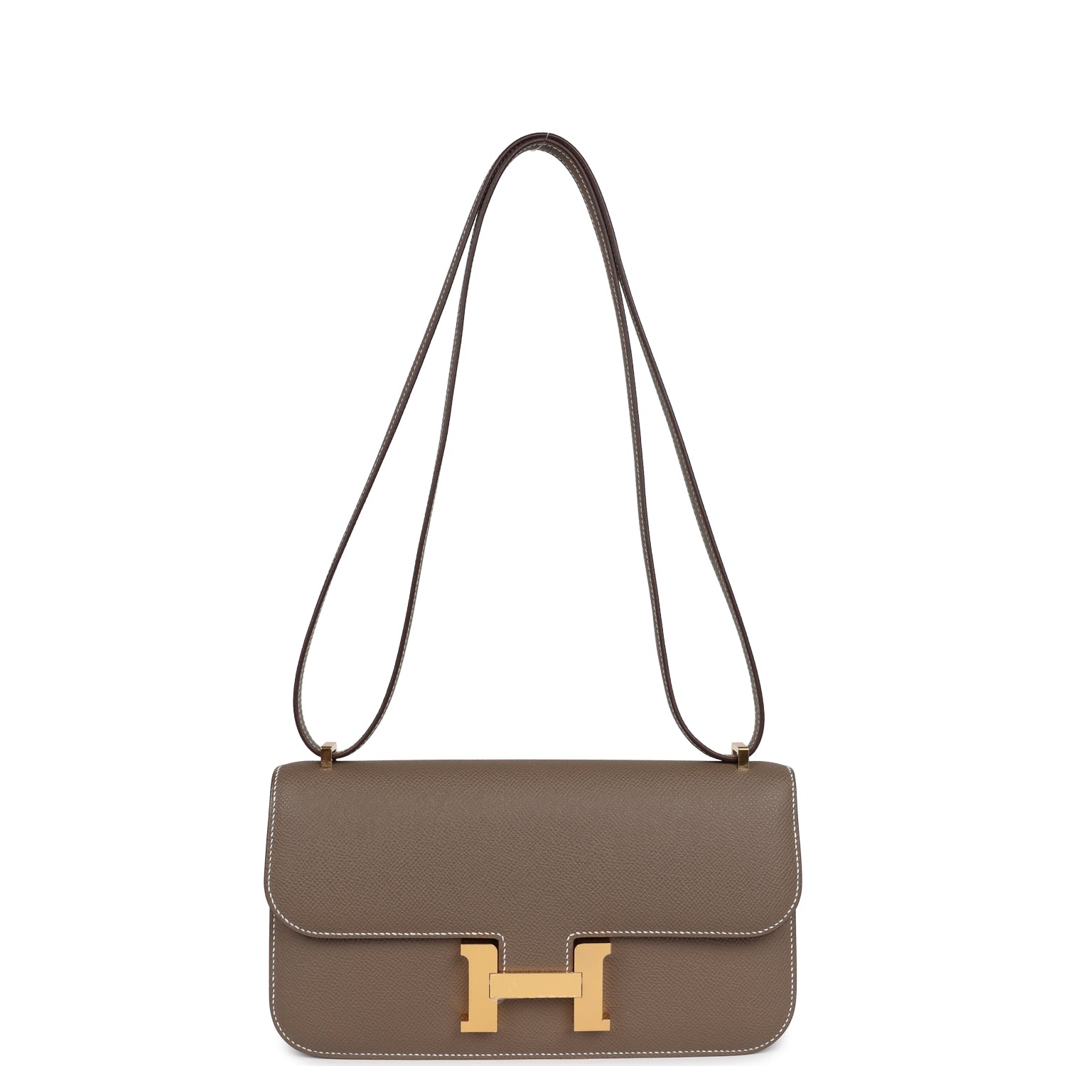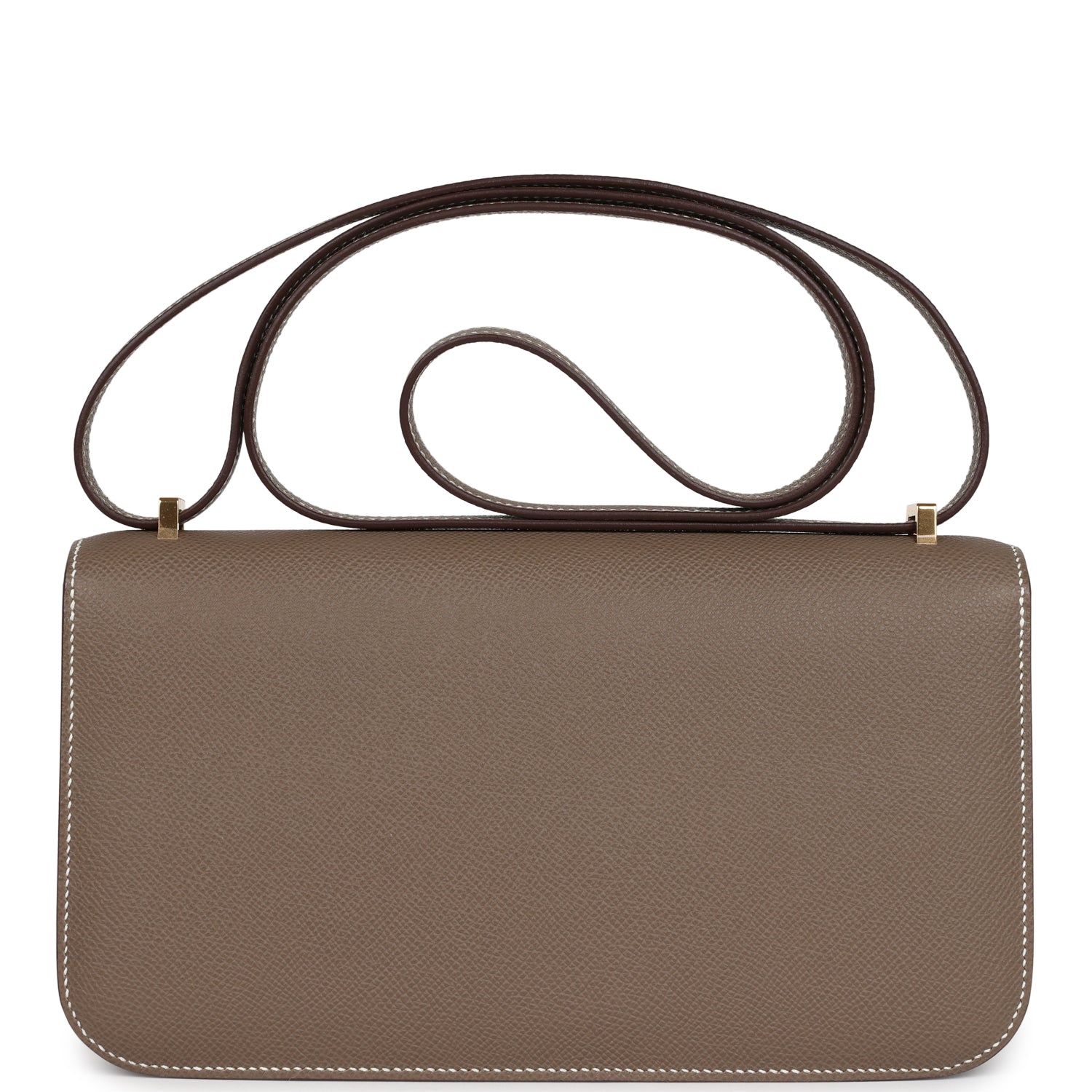 This Hermes Constance 1-Elan is in Etoupe Epsom leather with gold hardware, featuring contrast stitching, metal "H" snap closure, and an adjustable strap.